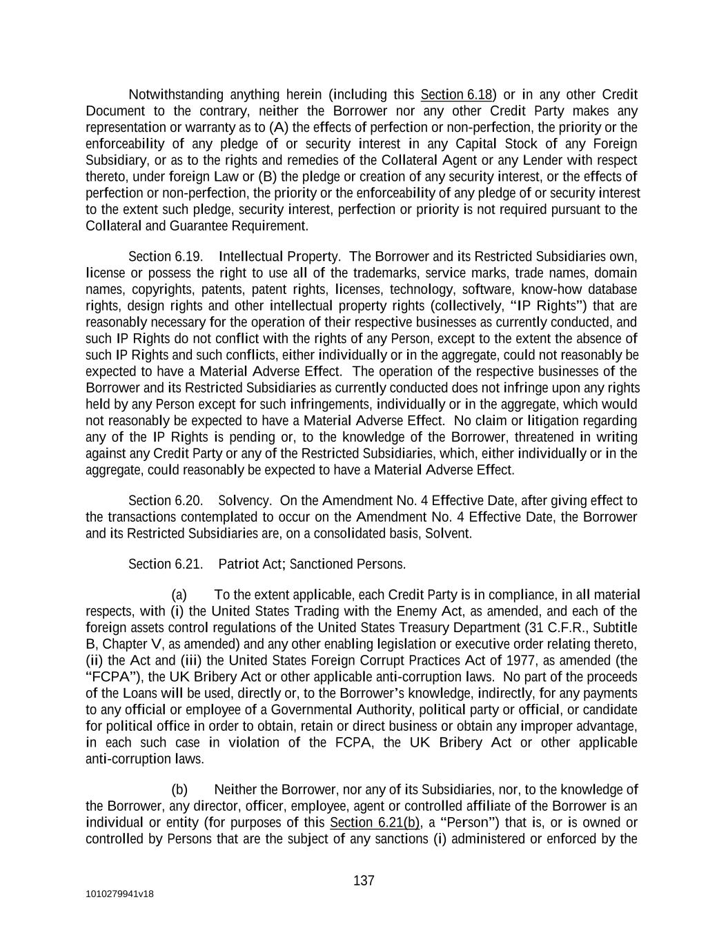 Notwithstanding anything herein (including this Section 6.18) or in any other Credit Document to the contrary, neither the Borrower nor any other Credit Party makes any representation or warranty as to (A) the effects of perfection or non-perfection, the priority or the enforceability of any pledge of or security interest in any Capital Stock of any Foreign Subsidiary, or as to the rights and remedies of the Collateral Agent or any Lender with respect thereto, under foreign Law or (B) the pledge or creation of any security interest, or the effects of perfection or non-perfection, the priority or the enforceability of any pledge of or security interest to the extent such pledge, security interest, perfection or priority is not required pursuant to the Collateral and Guarantee Requirement. Section 6.19. Intellectual Property. The Borrower and its Restricted Subsidiaries own, license or possess the right to use all of the trademarks, service marks, trade names, domain names, copyrights, patents, patent rights, licenses, technology, software, know-how database rights, design rights and other intellectual property rights (collectively, “IP Rights”) that are reasonably necessary for the operation of their respective businesses as currently conducted, and such IP Rights do not conflict with the rights of any Person, except to the extent the absence of such IP Rights and such conflicts, either individually or in the aggregate, could not reasonably be expected to have a Material Adverse Effect. The operation of the respective businesses of the Borrower and its Restricted Subsidiaries as currently conducted does not infringe upon any rights held by any Person except for such infringements, individually or in the aggregate, which would not reasonably be expected to have a Material Adverse Effect. No claim or litigation regarding any of the IP Rights is pending or, to the knowledge of the Borrower, threatened in writing against any Credit Party or any of the Restricted Subsidiaries, which, either individually or in the aggregate, could reasonably be expected to have a Material Adverse Effect. Section 6.20. Solvency. On the Amendment No. 4 Effective Date, after giving effect to the transactions contemplated to occur on the Amendment No. 4 Effective Date, the Borrower and its Restricted Subsidiaries are, on a consolidated basis, Solvent. Section 6.21. Patriot Act; Sanctioned Persons. (a) To the extent applicable, each Credit Party is in compliance, in all material respects, with (i) the United States Trading with the Enemy Act, as amended, and each of the foreign assets control regulations of the United States Treasury Department (31 C.F.R., Subtitle B, Chapter V, as amended) and any other enabling legislation or executive order relating thereto, (ii) the Act and (iii) the United States Foreign Corrupt Practices Act of 1977, as amended (the “FCPA”), the UK Bribery Act or other applicable anti-corruption laws. No part of the proceeds of the Loans will be used, directly or, to the Borrower’s knowledge, indirectly, for any payments to any official or employee of a Governmental Authority, political party or official, or candidate for political office in order to obtain, retain or direct business or obtain any improper advantage, in each such case in violation of the FCPA, the UK Bribery Act or other applicable anti-corruption laws. (b) Neither the Borrower, nor any of its Subsidiaries, nor, to the knowledge of the Borrower, any director, officer, employee, agent or controlled affiliate of the Borrower is an individual or entity (for purposes of this Section 6.21(b), a “Person”) that is, or is owned or controlled by Persons that are the subject of any sanctions (i) administered or enforced by the 137 1010279941v18