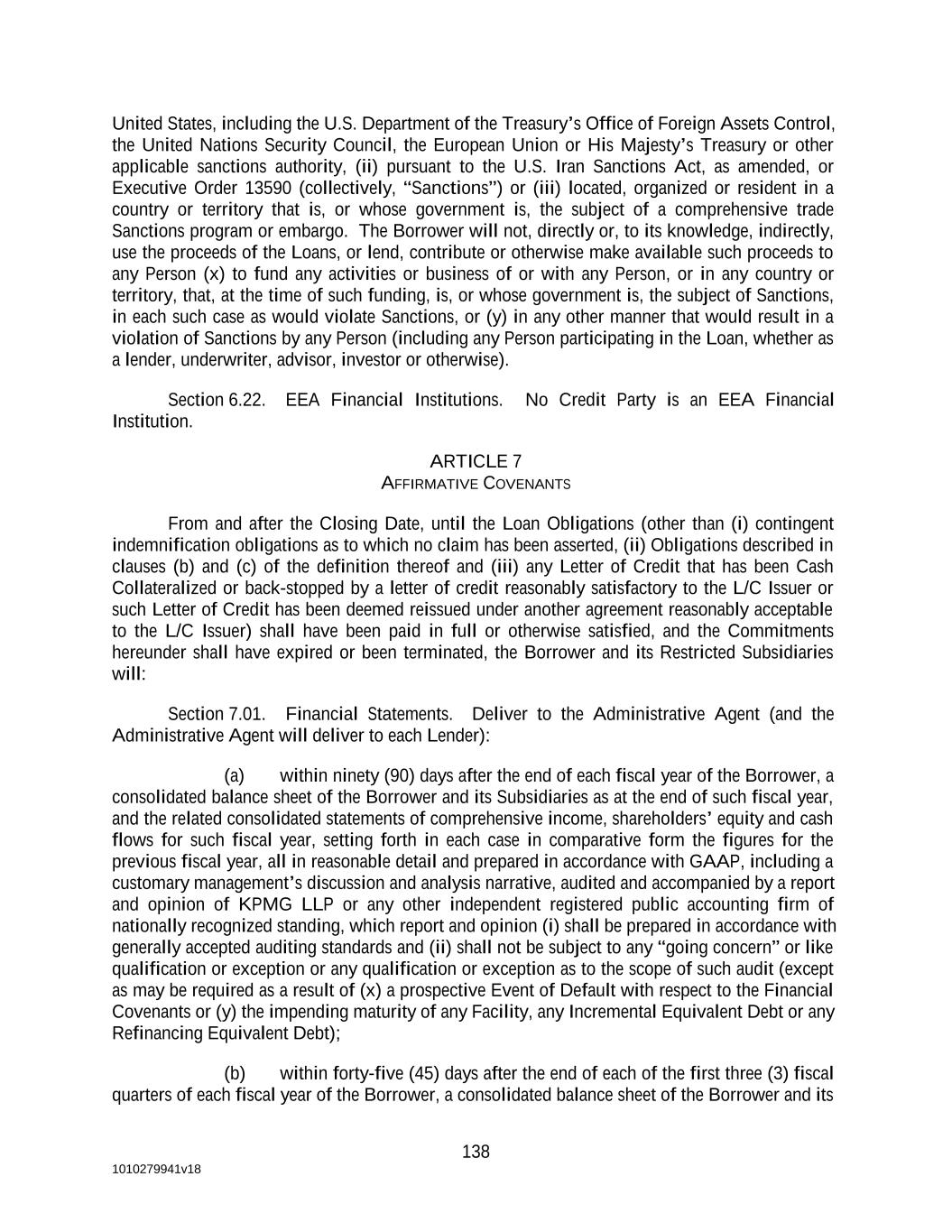 United States, including the U.S. Department of the Treasury’s Office of Foreign Assets Control, the United Nations Security Council, the European Union or His Majesty’s Treasury or other applicable sanctions authority, (ii) pursuant to the U.S. Iran Sanctions Act, as amended, or Executive Order 13590 (collectively, “Sanctions”) or (iii) located, organized or resident in a country or territory that is, or whose government is, the subject of a comprehensive trade Sanctions program or embargo. The Borrower will not, directly or, to its knowledge, indirectly, use the proceeds of the Loans, or lend, contribute or otherwise make available such proceeds to any Person (x) to fund any activities or business of or with any Person, or in any country or territory, that, at the time of such funding, is, or whose government is, the subject of Sanctions, in each such case as would violate Sanctions, or (y) in any other manner that would result in a violation of Sanctions by any Person (including any Person participating in the Loan, whether as a lender, underwriter, advisor, investor or otherwise). Section 6.22. EEA Financial Institutions. No Credit Party is an EEA Financial Institution. ARTICLE 7 AFFIRMATIVE COVENANTS From and after the Closing Date, until the Loan Obligations (other than (i) contingent indemnification obligations as to which no claim has been asserted, (ii) Obligations described in clauses (b) and (c) of the definition thereof and (iii) any Letter of Credit that has been Cash Collateralized or back-stopped by a letter of credit reasonably satisfactory to the L/C Issuer or such Letter of Credit has been deemed reissued under another agreement reasonably acceptable to the L/C Issuer) shall have been paid in full or otherwise satisfied, and the Commitments hereunder shall have expired or been terminated, the Borrower and its Restricted Subsidiaries will: Section 7.01. Financial Statements. Deliver to the Administrative Agent (and the Administrative Agent will deliver to each Lender): (a) within ninety (90) days after the end of each fiscal year of the Borrower, a consolidated balance sheet of the Borrower and its Subsidiaries as at the end of such fiscal year, and the related consolidated statements of comprehensive income, shareholders’ equity and cash flows for such fiscal year, setting forth in each case in comparative form the figures for the previous fiscal year, all in reasonable detail and prepared in accordance with GAAP, including a customary management’s discussion and analysis narrative, audited and accompanied by a report and opinion of KPMG LLP or any other independent registered public accounting firm of nationally recognized standing, which report and opinion (i) shall be prepared in accordance with generally accepted auditing standards and (ii) shall not be subject to any “going concern” or like qualification or exception or any qualification or exception as to the scope of such audit (except as may be required as a result of (x) a prospective Event of Default with respect to the Financial Covenants or (y) the impending maturity of any Facility, any Incremental Equivalent Debt or any Refinancing Equivalent Debt); (b) within forty-five (45) days after the end of each of the first three (3) fiscal quarters of each fiscal year of the Borrower, a consolidated balance sheet of the Borrower and its 138 1010279941v18