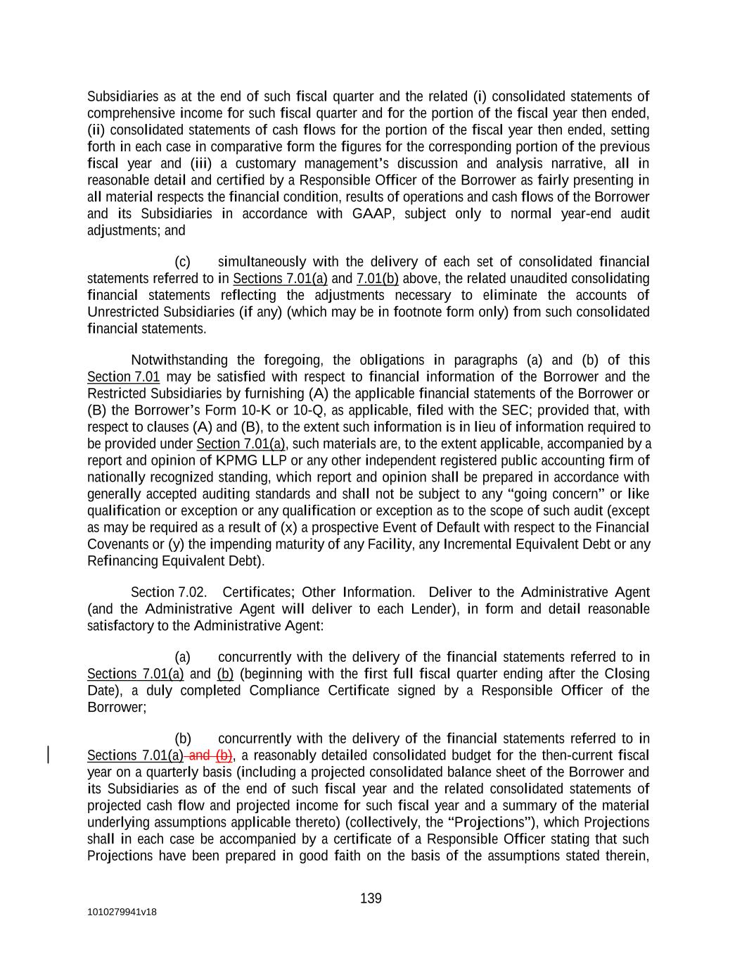 Subsidiaries as at the end of such fiscal quarter and the related (i) consolidated statements of comprehensive income for such fiscal quarter and for the portion of the fiscal year then ended, (ii) consolidated statements of cash flows for the portion of the fiscal year then ended, setting forth in each case in comparative form the figures for the corresponding portion of the previous fiscal year and (iii) a customary management’s discussion and analysis narrative, all in reasonable detail and certified by a Responsible Officer of the Borrower as fairly presenting in all material respects the financial condition, results of operations and cash flows of the Borrower and its Subsidiaries in accordance with GAAP, subject only to normal year-end audit adjustments; and (c) simultaneously with the delivery of each set of consolidated financial statements referred to in Sections 7.01(a) and 7.01(b) above, the related unaudited consolidating financial statements reflecting the adjustments necessary to eliminate the accounts of Unrestricted Subsidiaries (if any) (which may be in footnote form only) from such consolidated financial statements. Notwithstanding the foregoing, the obligations in paragraphs (a) and (b) of this Section 7.01 may be satisfied with respect to financial information of the Borrower and the Restricted Subsidiaries by furnishing (A) the applicable financial statements of the Borrower or (B) the Borrower’s Form 10-K or 10-Q, as applicable, filed with the SEC; provided that, with respect to clauses (A) and (B), to the extent such information is in lieu of information required to be provided under Section 7.01(a), such materials are, to the extent applicable, accompanied by a report and opinion of KPMG LLP or any other independent registered public accounting firm of nationally recognized standing, which report and opinion shall be prepared in accordance with generally accepted auditing standards and shall not be subject to any “going concern” or like qualification or exception or any qualification or exception as to the scope of such audit (except as may be required as a result of (x) a prospective Event of Default with respect to the Financial Covenants or (y) the impending maturity of any Facility, any Incremental Equivalent Debt or any Refinancing Equivalent Debt). Section 7.02. Certificates; Other Information. Deliver to the Administrative Agent (and the Administrative Agent will deliver to each Lender), in form and detail reasonable satisfactory to the Administrative Agent: (a) concurrently with the delivery of the financial statements referred to in Sections 7.01(a) and (b) (beginning with the first full fiscal quarter ending after the Closing Date), a duly completed Compliance Certificate signed by a Responsible Officer of the Borrower; (b) concurrently with the delivery of the financial statements referred to in Sections 7.01(a) and (b), a reasonably detailed consolidated budget for the then-current fiscal year on a quarterly basis (including a projected consolidated balance sheet of the Borrower and its Subsidiaries as of the end of such fiscal year and the related consolidated statements of projected cash flow and projected income for such fiscal year and a summary of the material underlying assumptions applicable thereto) (collectively, the “Projections”), which Projections shall in each case be accompanied by a certificate of a Responsible Officer stating that such Projections have been prepared in good faith on the basis of the assumptions stated therein, 139 1010279941v18
