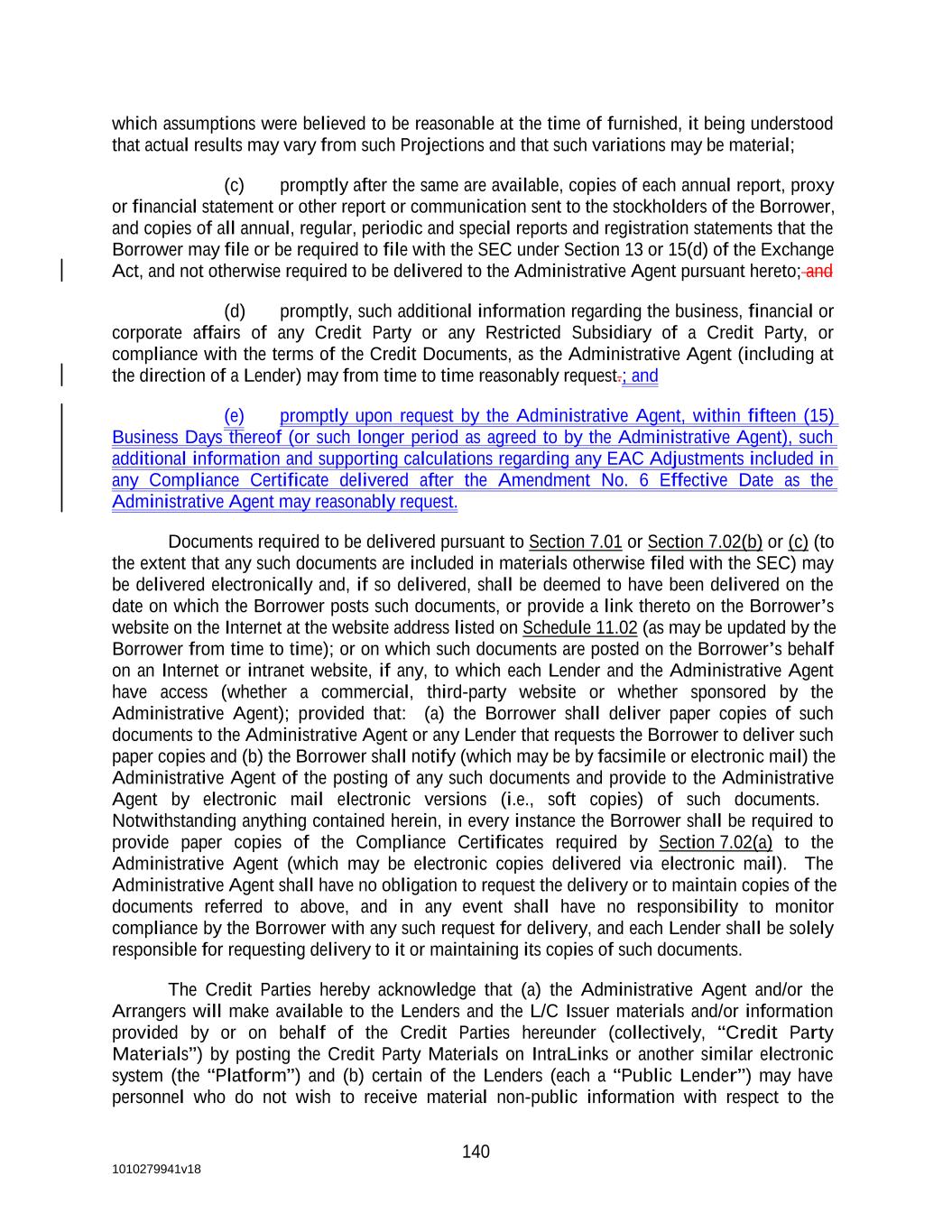 which assumptions were believed to be reasonable at the time of furnished, it being understood that actual results may vary from such Projections and that such variations may be material; (c) promptly after the same are available, copies of each annual report, proxy or financial statement or other report or communication sent to the stockholders of the Borrower, and copies of all annual, regular, periodic and special reports and registration statements that the Borrower may file or be required to file with the SEC under Section 13 or 15(d) of the Exchange Act, and not otherwise required to be delivered to the Administrative Agent pursuant hereto; and (d) promptly, such additional information regarding the business, financial or corporate affairs of any Credit Party or any Restricted Subsidiary of a Credit Party, or compliance with the terms of the Credit Documents, as the Administrative Agent (including at the direction of a Lender) may from time to time reasonably request.; and (e) promptly upon request by the Administrative Agent, within fifteen (15) Business Days thereof (or such longer period as agreed to by the Administrative Agent), such additional information and supporting calculations regarding any EAC Adjustments included in any Compliance Certificate delivered after the Amendment No. 6 Effective Date as the Administrative Agent may reasonably request. Documents required to be delivered pursuant to Section 7.01 or Section 7.02(b) or (c) (to the extent that any such documents are included in materials otherwise filed with the SEC) may be delivered electronically and, if so delivered, shall be deemed to have been delivered on the date on which the Borrower posts such documents, or provide a link thereto on the Borrower’s website on the Internet at the website address listed on Schedule 11.02 (as may be updated by the Borrower from time to time); or on which such documents are posted on the Borrower’s behalf on an Internet or intranet website, if any, to which each Lender and the Administrative Agent have access (whether a commercial, third-party website or whether sponsored by the Administrative Agent); provided that: (a) the Borrower shall deliver paper copies of such documents to the Administrative Agent or any Lender that requests the Borrower to deliver such paper copies and (b) the Borrower shall notify (which may be by facsimile or electronic mail) the Administrative Agent of the posting of any such documents and provide to the Administrative Agent by electronic mail electronic versions (i.e., soft copies) of such documents. Notwithstanding anything contained herein, in every instance the Borrower shall be required to provide paper copies of the Compliance Certificates required by Section 7.02(a) to the Administrative Agent (which may be electronic copies delivered via electronic mail). The Administrative Agent shall have no obligation to request the delivery or to maintain copies of the documents referred to above, and in any event shall have no responsibility to monitor compliance by the Borrower with any such request for delivery, and each Lender shall be solely responsible for requesting delivery to it or maintaining its copies of such documents. The Credit Parties hereby acknowledge that (a) the Administrative Agent and/or the Arrangers will make available to the Lenders and the L/C Issuer materials and/or information provided by or on behalf of the Credit Parties hereunder (collectively, “Credit Party Materials”) by posting the Credit Party Materials on IntraLinks or another similar electronic system (the “Platform”) and (b) certain of the Lenders (each a “Public Lender”) may have personnel who do not wish to receive material non-public information with respect to the 140 1010279941v18