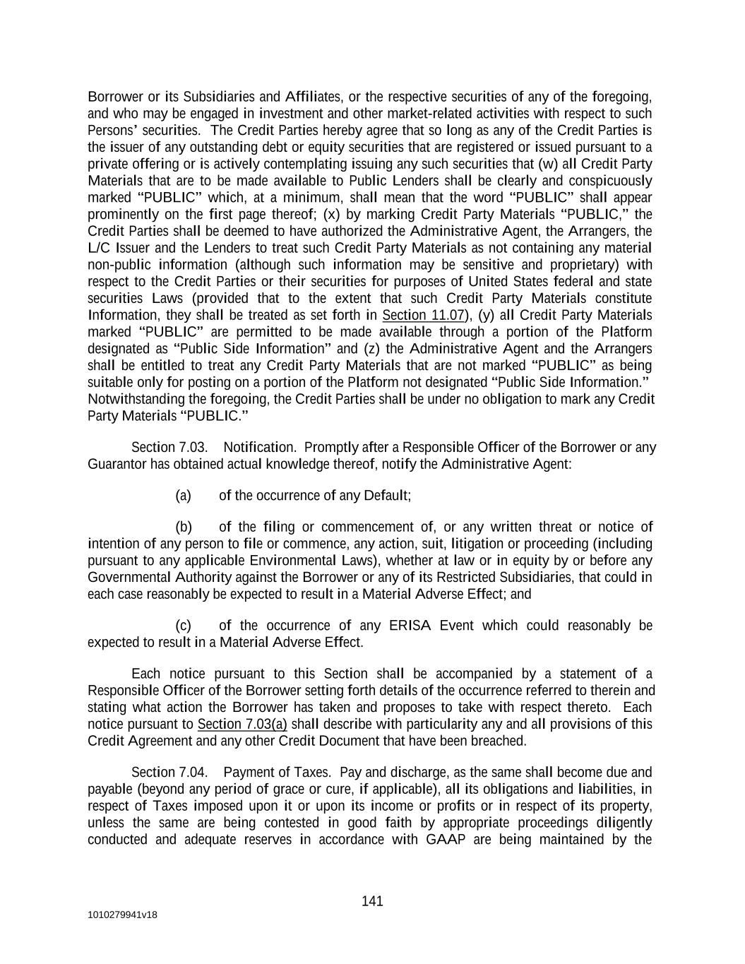 Borrower or its Subsidiaries and Affiliates, or the respective securities of any of the foregoing, and who may be engaged in investment and other market-related activities with respect to such Persons’ securities. The Credit Parties hereby agree that so long as any of the Credit Parties is the issuer of any outstanding debt or equity securities that are registered or issued pursuant to a private offering or is actively contemplating issuing any such securities that (w) all Credit Party Materials that are to be made available to Public Lenders shall be clearly and conspicuously marked “PUBLIC” which, at a minimum, shall mean that the word “PUBLIC” shall appear prominently on the first page thereof; (x) by marking Credit Party Materials “PUBLIC,” the Credit Parties shall be deemed to have authorized the Administrative Agent, the Arrangers, the L/C Issuer and the Lenders to treat such Credit Party Materials as not containing any material non-public information (although such information may be sensitive and proprietary) with respect to the Credit Parties or their securities for purposes of United States federal and state securities Laws (provided that to the extent that such Credit Party Materials constitute Information, they shall be treated as set forth in Section 11.07), (y) all Credit Party Materials marked “PUBLIC” are permitted to be made available through a portion of the Platform designated as “Public Side Information” and (z) the Administrative Agent and the Arrangers shall be entitled to treat any Credit Party Materials that are not marked “PUBLIC” as being suitable only for posting on a portion of the Platform not designated “Public Side Information.” Notwithstanding the foregoing, the Credit Parties shall be under no obligation to mark any Credit Party Materials “PUBLIC.” Section 7.03. Notification. Promptly after a Responsible Officer of the Borrower or any Guarantor has obtained actual knowledge thereof, notify the Administrative Agent: (a) of the occurrence of any Default; (b) of the filing or commencement of, or any written threat or notice of intention of any person to file or commence, any action, suit, litigation or proceeding (including pursuant to any applicable Environmental Laws), whether at law or in equity by or before any Governmental Authority against the Borrower or any of its Restricted Subsidiaries, that could in each case reasonably be expected to result in a Material Adverse Effect; and (c) of the occurrence of any ERISA Event which could reasonably be expected to result in a Material Adverse Effect. Each notice pursuant to this Section shall be accompanied by a statement of a Responsible Officer of the Borrower setting forth details of the occurrence referred to therein and stating what action the Borrower has taken and proposes to take with respect thereto. Each notice pursuant to Section 7.03(a) shall describe with particularity any and all provisions of this Credit Agreement and any other Credit Document that have been breached. Section 7.04. Payment of Taxes. Pay and discharge, as the same shall become due and payable (beyond any period of grace or cure, if applicable), all its obligations and liabilities, in respect of Taxes imposed upon it or upon its income or profits or in respect of its property, unless the same are being contested in good faith by appropriate proceedings diligently conducted and adequate reserves in accordance with GAAP are being maintained by the 141 1010279941v18