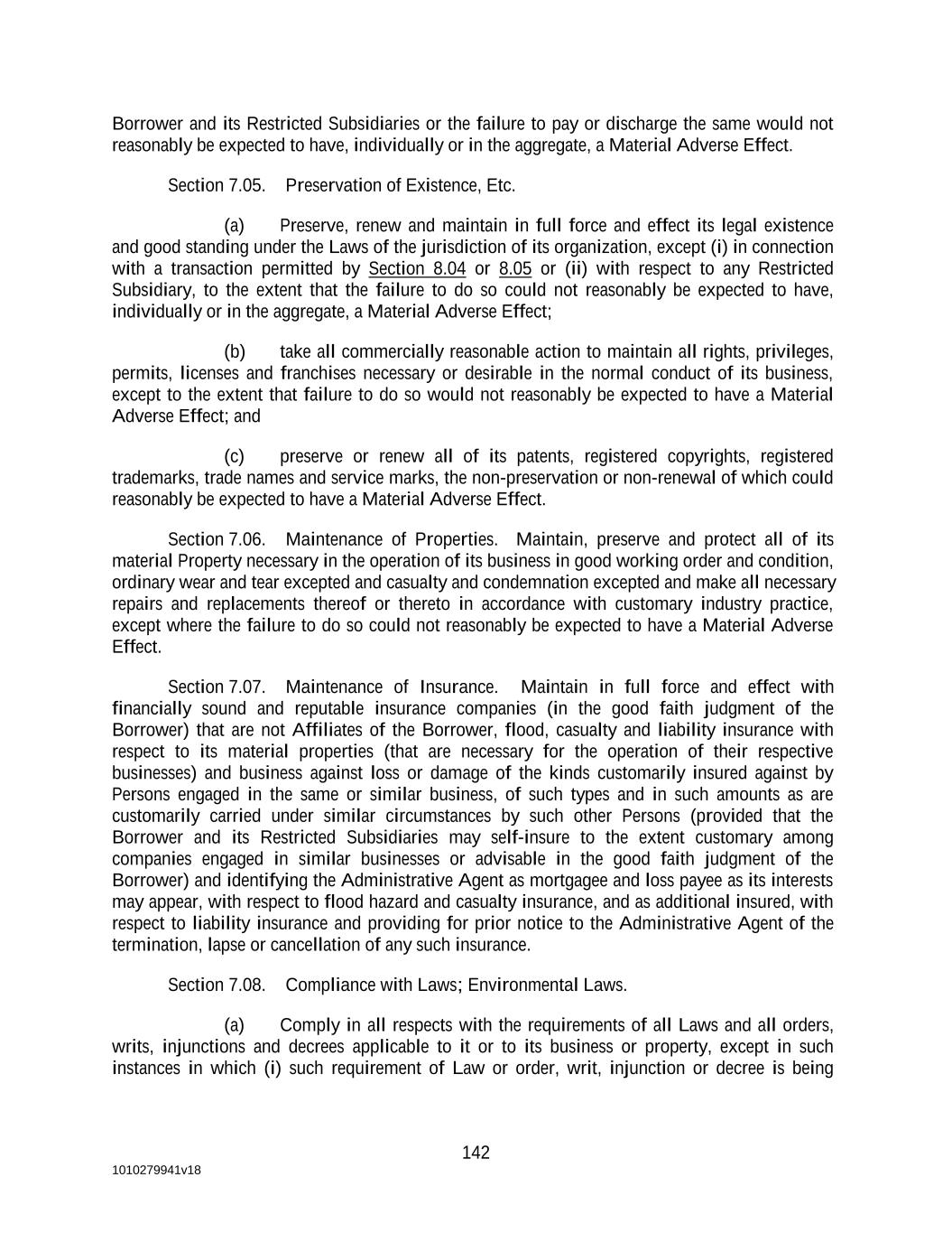 Borrower and its Restricted Subsidiaries or the failure to pay or discharge the same would not reasonably be expected to have, individually or in the aggregate, a Material Adverse Effect. Section 7.05. Preservation of Existence, Etc. (a) Preserve, renew and maintain in full force and effect its legal existence and good standing under the Laws of the jurisdiction of its organization, except (i) in connection with a transaction permitted by Section 8.04 or 8.05 or (ii) with respect to any Restricted Subsidiary, to the extent that the failure to do so could not reasonably be expected to have, individually or in the aggregate, a Material Adverse Effect; (b) take all commercially reasonable action to maintain all rights, privileges, permits, licenses and franchises necessary or desirable in the normal conduct of its business, except to the extent that failure to do so would not reasonably be expected to have a Material Adverse Effect; and (c) preserve or renew all of its patents, registered copyrights, registered trademarks, trade names and service marks, the non-preservation or non-renewal of which could reasonably be expected to have a Material Adverse Effect. Section 7.06. Maintenance of Properties. Maintain, preserve and protect all of its material Property necessary in the operation of its business in good working order and condition, ordinary wear and tear excepted and casualty and condemnation excepted and make all necessary repairs and replacements thereof or thereto in accordance with customary industry practice, except where the failure to do so could not reasonably be expected to have a Material Adverse Effect. Section 7.07. Maintenance of Insurance. Maintain in full force and effect with financially sound and reputable insurance companies (in the good faith judgment of the Borrower) that are not Affiliates of the Borrower, flood, casualty and liability insurance with respect to its material properties (that are necessary for the operation of their respective businesses) and business against loss or damage of the kinds customarily insured against by Persons engaged in the same or similar business, of such types and in such amounts as are customarily carried under similar circumstances by such other Persons (provided that the Borrower and its Restricted Subsidiaries may self-insure to the extent customary among companies engaged in similar businesses or advisable in the good faith judgment of the Borrower) and identifying the Administrative Agent as mortgagee and loss payee as its interests may appear, with respect to flood hazard and casualty insurance, and as additional insured, with respect to liability insurance and providing for prior notice to the Administrative Agent of the termination, lapse or cancellation of any such insurance. Section 7.08. Compliance with Laws; Environmental Laws. (a) Comply in all respects with the requirements of all Laws and all orders, writs, injunctions and decrees applicable to it or to its business or property, except in such instances in which (i) such requirement of Law or order, writ, injunction or decree is being 142 1010279941v18