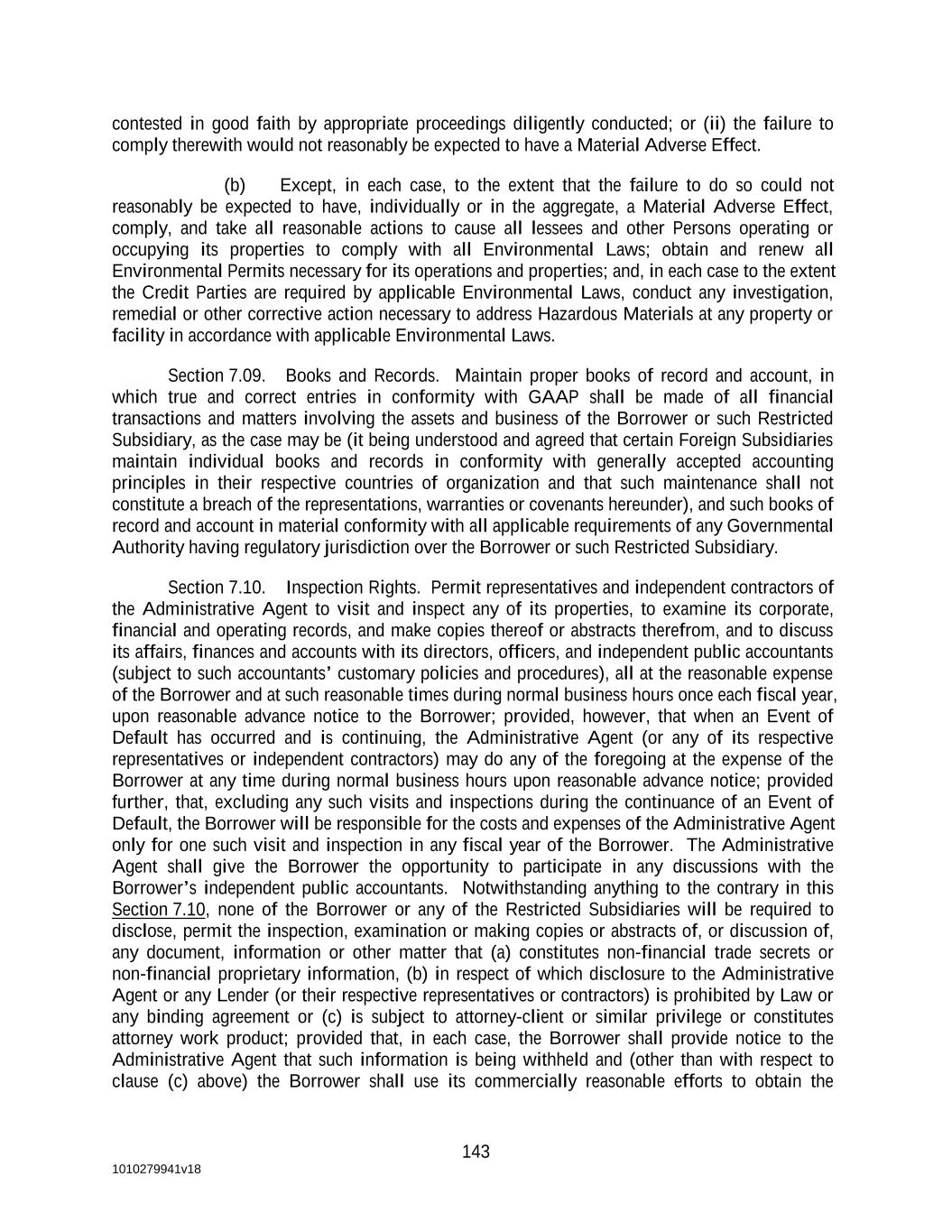 contested in good faith by appropriate proceedings diligently conducted; or (ii) the failure to comply therewith would not reasonably be expected to have a Material Adverse Effect. (b) Except, in each case, to the extent that the failure to do so could not reasonably be expected to have, individually or in the aggregate, a Material Adverse Effect, comply, and take all reasonable actions to cause all lessees and other Persons operating or occupying its properties to comply with all Environmental Laws; obtain and renew all Environmental Permits necessary for its operations and properties; and, in each case to the extent the Credit Parties are required by applicable Environmental Laws, conduct any investigation, remedial or other corrective action necessary to address Hazardous Materials at any property or facility in accordance with applicable Environmental Laws. Section 7.09. Books and Records. Maintain proper books of record and account, in which true and correct entries in conformity with GAAP shall be made of all financial transactions and matters involving the assets and business of the Borrower or such Restricted Subsidiary, as the case may be (it being understood and agreed that certain Foreign Subsidiaries maintain individual books and records in conformity with generally accepted accounting principles in their respective countries of organization and that such maintenance shall not constitute a breach of the representations, warranties or covenants hereunder), and such books of record and account in material conformity with all applicable requirements of any Governmental Authority having regulatory jurisdiction over the Borrower or such Restricted Subsidiary. Section 7.10. Inspection Rights. Permit representatives and independent contractors of the Administrative Agent to visit and inspect any of its properties, to examine its corporate, financial and operating records, and make copies thereof or abstracts therefrom, and to discuss its affairs, finances and accounts with its directors, officers, and independent public accountants (subject to such accountants’ customary policies and procedures), all at the reasonable expense of the Borrower and at such reasonable times during normal business hours once each fiscal year, upon reasonable advance notice to the Borrower; provided, however, that when an Event of Default has occurred and is continuing, the Administrative Agent (or any of its respective representatives or independent contractors) may do any of the foregoing at the expense of the Borrower at any time during normal business hours upon reasonable advance notice; provided further, that, excluding any such visits and inspections during the continuance of an Event of Default, the Borrower will be responsible for the costs and expenses of the Administrative Agent only for one such visit and inspection in any fiscal year of the Borrower. The Administrative Agent shall give the Borrower the opportunity to participate in any discussions with the Borrower’s independent public accountants. Notwithstanding anything to the contrary in this Section 7.10, none of the Borrower or any of the Restricted Subsidiaries will be required to disclose, permit the inspection, examination or making copies or abstracts of, or discussion of, any document, information or other matter that (a) constitutes non-financial trade secrets or non-financial proprietary information, (b) in respect of which disclosure to the Administrative Agent or any Lender (or their respective representatives or contractors) is prohibited by Law or any binding agreement or (c) is subject to attorney-client or similar privilege or constitutes attorney work product; provided that, in each case, the Borrower shall provide notice to the Administrative Agent that such information is being withheld and (other than with respect to clause (c) above) the Borrower shall use its commercially reasonable efforts to obtain the 143 1010279941v18