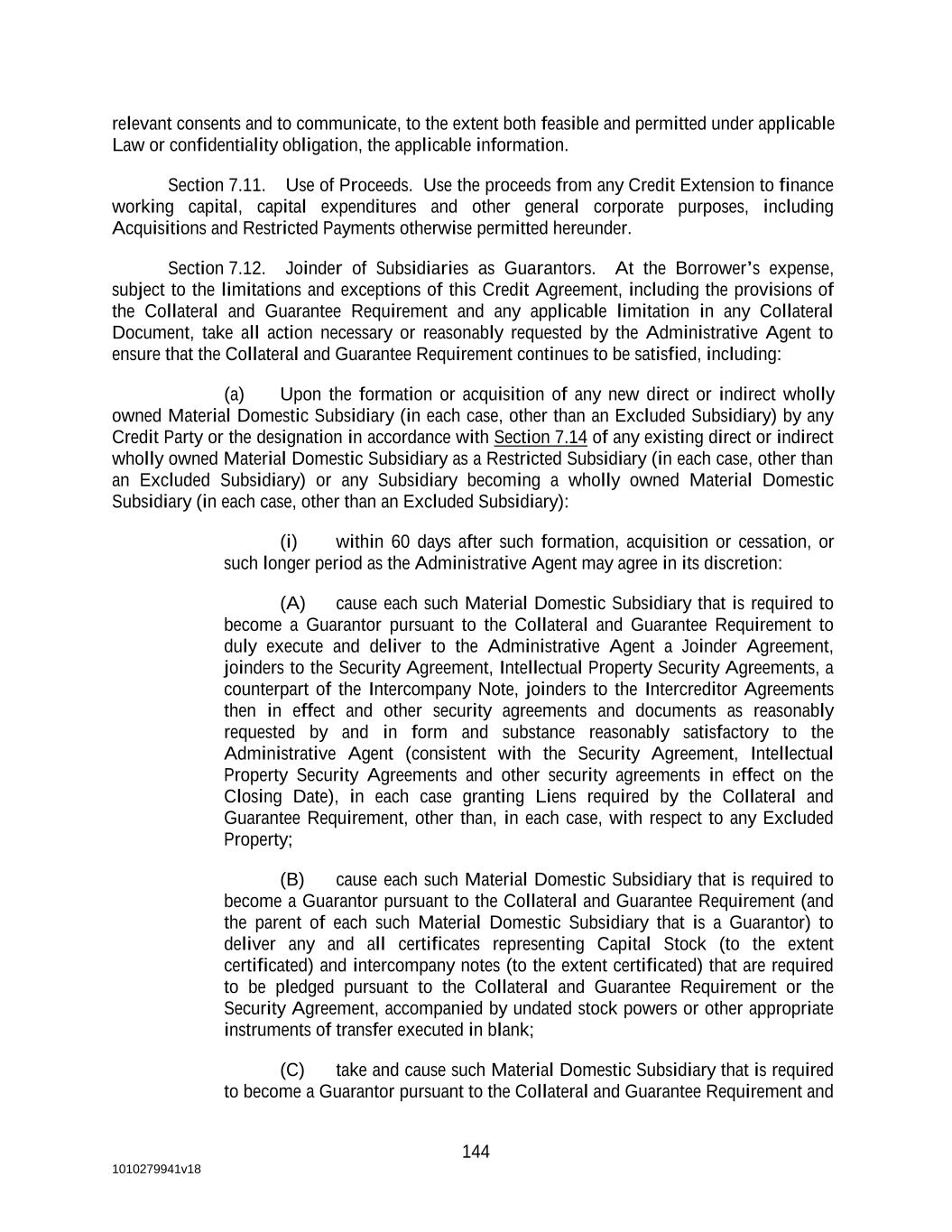 relevant consents and to communicate, to the extent both feasible and permitted under applicable Law or confidentiality obligation, the applicable information. Section 7.11. Use of Proceeds. Use the proceeds from any Credit Extension to finance working capital, capital expenditures and other general corporate purposes, including Acquisitions and Restricted Payments otherwise permitted hereunder. Section 7.12. Joinder of Subsidiaries as Guarantors. At the Borrower’s expense, subject to the limitations and exceptions of this Credit Agreement, including the provisions of the Collateral and Guarantee Requirement and any applicable limitation in any Collateral Document, take all action necessary or reasonably requested by the Administrative Agent to ensure that the Collateral and Guarantee Requirement continues to be satisfied, including: (a) Upon the formation or acquisition of any new direct or indirect wholly owned Material Domestic Subsidiary (in each case, other than an Excluded Subsidiary) by any Credit Party or the designation in accordance with Section 7.14 of any existing direct or indirect wholly owned Material Domestic Subsidiary as a Restricted Subsidiary (in each case, other than an Excluded Subsidiary) or any Subsidiary becoming a wholly owned Material Domestic Subsidiary (in each case, other than an Excluded Subsidiary): (i) within 60 days after such formation, acquisition or cessation, or such longer period as the Administrative Agent may agree in its discretion: (A) cause each such Material Domestic Subsidiary that is required to become a Guarantor pursuant to the Collateral and Guarantee Requirement to duly execute and deliver to the Administrative Agent a Joinder Agreement, joinders to the Security Agreement, Intellectual Property Security Agreements, a counterpart of the Intercompany Note, joinders to the Intercreditor Agreements then in effect and other security agreements and documents as reasonably requested by and in form and substance reasonably satisfactory to the Administrative Agent (consistent with the Security Agreement, Intellectual Property Security Agreements and other security agreements in effect on the Closing Date), in each case granting Liens required by the Collateral and Guarantee Requirement, other than, in each case, with respect to any Excluded Property; (B) cause each such Material Domestic Subsidiary that is required to become a Guarantor pursuant to the Collateral and Guarantee Requirement (and the parent of each such Material Domestic Subsidiary that is a Guarantor) to deliver any and all certificates representing Capital Stock (to the extent certificated) and intercompany notes (to the extent certificated) that are required to be pledged pursuant to the Collateral and Guarantee Requirement or the Security Agreement, accompanied by undated stock powers or other appropriate instruments of transfer executed in blank; (C) take and cause such Material Domestic Subsidiary that is required to become a Guarantor pursuant to the Collateral and Guarantee Requirement and 144 1010279941v18