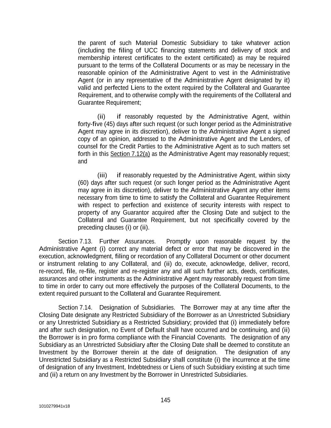 the parent of such Material Domestic Subsidiary to take whatever action (including the filing of UCC financing statements and delivery of stock and membership interest certificates to the extent certificated) as may be required pursuant to the terms of the Collateral Documents or as may be necessary in the reasonable opinion of the Administrative Agent to vest in the Administrative Agent (or in any representative of the Administrative Agent designated by it) valid and perfected Liens to the extent required by the Collateral and Guarantee Requirement, and to otherwise comply with the requirements of the Collateral and Guarantee Requirement; (ii) if reasonably requested by the Administrative Agent, within forty-five (45) days after such request (or such longer period as the Administrative Agent may agree in its discretion), deliver to the Administrative Agent a signed copy of an opinion, addressed to the Administrative Agent and the Lenders, of counsel for the Credit Parties to the Administrative Agent as to such matters set forth in this Section 7.12(a) as the Administrative Agent may reasonably request; and (iii) if reasonably requested by the Administrative Agent, within sixty (60) days after such request (or such longer period as the Administrative Agent may agree in its discretion), deliver to the Administrative Agent any other items necessary from time to time to satisfy the Collateral and Guarantee Requirement with respect to perfection and existence of security interests with respect to property of any Guarantor acquired after the Closing Date and subject to the Collateral and Guarantee Requirement, but not specifically covered by the preceding clauses (i) or (ii). Section 7.13. Further Assurances. Promptly upon reasonable request by the Administrative Agent (i) correct any material defect or error that may be discovered in the execution, acknowledgment, filing or recordation of any Collateral Document or other document or instrument relating to any Collateral, and (ii) do, execute, acknowledge, deliver, record, re-record, file, re-file, register and re-register any and all such further acts, deeds, certificates, assurances and other instruments as the Administrative Agent may reasonably request from time to time in order to carry out more effectively the purposes of the Collateral Documents, to the extent required pursuant to the Collateral and Guarantee Requirement. Section 7.14. Designation of Subsidiaries. The Borrower may at any time after the Closing Date designate any Restricted Subsidiary of the Borrower as an Unrestricted Subsidiary or any Unrestricted Subsidiary as a Restricted Subsidiary; provided that (i) immediately before and after such designation, no Event of Default shall have occurred and be continuing, and (ii) the Borrower is in pro forma compliance with the Financial Covenants. The designation of any Subsidiary as an Unrestricted Subsidiary after the Closing Date shall be deemed to constitute an Investment by the Borrower therein at the date of designation. The designation of any Unrestricted Subsidiary as a Restricted Subsidiary shall constitute (i) the incurrence at the time of designation of any Investment, Indebtedness or Liens of such Subsidiary existing at such time and (ii) a return on any Investment by the Borrower in Unrestricted Subsidiaries. 145 1010279941v18