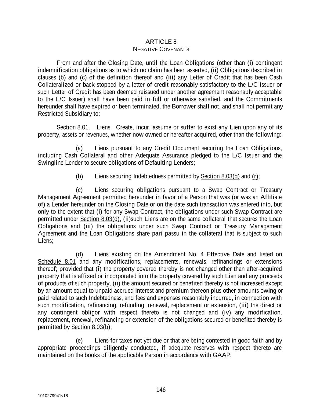 ARTICLE 8 NEGATIVE COVENANTS From and after the Closing Date, until the Loan Obligations (other than (i) contingent indemnification obligations as to which no claim has been asserted, (ii) Obligations described in clauses (b) and (c) of the definition thereof and (iii) any Letter of Credit that has been Cash Collateralized or back-stopped by a letter of credit reasonably satisfactory to the L/C Issuer or such Letter of Credit has been deemed reissued under another agreement reasonably acceptable to the L/C Issuer) shall have been paid in full or otherwise satisfied, and the Commitments hereunder shall have expired or been terminated, the Borrower shall not, and shall not permit any Restricted Subsidiary to: Section 8.01. Liens. Create, incur, assume or suffer to exist any Lien upon any of its property, assets or revenues, whether now owned or hereafter acquired, other than the following: (a) Liens pursuant to any Credit Document securing the Loan Obligations, including Cash Collateral and other Adequate Assurance pledged to the L/C Issuer and the Swingline Lender to secure obligations of Defaulting Lenders; (b) Liens securing Indebtedness permitted by Section 8.03(q) and (r); (c) Liens securing obligations pursuant to a Swap Contract or Treasury Management Agreement permitted hereunder in favor of a Person that was (or was an Affiliate of) a Lender hereunder on the Closing Date or on the date such transaction was entered into, but only to the extent that (i) for any Swap Contract, the obligations under such Swap Contract are permitted under Section 8.03(d), (ii)such Liens are on the same collateral that secures the Loan Obligations and (iii) the obligations under such Swap Contract or Treasury Management Agreement and the Loan Obligations share pari passu in the collateral that is subject to such Liens; (d) Liens existing on the Amendment No. 4 Effective Date and listed on Schedule 8.01 and any modifications, replacements, renewals, refinancings or extensions thereof; provided that (i) the property covered thereby is not changed other than after-acquired property that is affixed or incorporated into the property covered by such Lien and any proceeds of products of such property, (ii) the amount secured or benefited thereby is not increased except by an amount equal to unpaid accrued interest and premium thereon plus other amounts owing or paid related to such Indebtedness, and fees and expenses reasonably incurred, in connection with such modification, refinancing, refunding, renewal, replacement or extension, (iii) the direct or any contingent obligor with respect thereto is not changed and (iv) any modification, replacement, renewal, refinancing or extension of the obligations secured or benefited thereby is permitted by Section 8.03(b); (e) Liens for taxes not yet due or that are being contested in good faith and by appropriate proceedings diligently conducted, if adequate reserves with respect thereto are maintained on the books of the applicable Person in accordance with GAAP; 146 1010279941v18