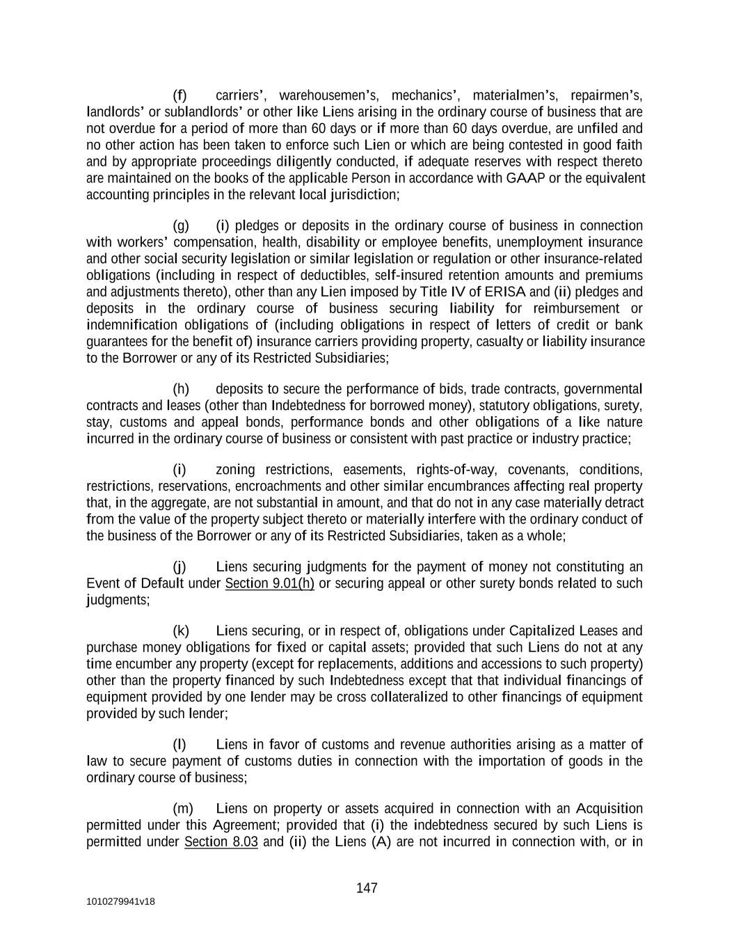 (f) carriers’, warehousemen’s, mechanics’, materialmen’s, repairmen’s, landlords’ or sublandlords’ or other like Liens arising in the ordinary course of business that are not overdue for a period of more than 60 days or if more than 60 days overdue, are unfiled and no other action has been taken to enforce such Lien or which are being contested in good faith and by appropriate proceedings diligently conducted, if adequate reserves with respect thereto are maintained on the books of the applicable Person in accordance with GAAP or the equivalent accounting principles in the relevant local jurisdiction; (g) (i) pledges or deposits in the ordinary course of business in connection with workers’ compensation, health, disability or employee benefits, unemployment insurance and other social security legislation or similar legislation or regulation or other insurance-related obligations (including in respect of deductibles, self-insured retention amounts and premiums and adjustments thereto), other than any Lien imposed by Title IV of ERISA and (ii) pledges and deposits in the ordinary course of business securing liability for reimbursement or indemnification obligations of (including obligations in respect of letters of credit or bank guarantees for the benefit of) insurance carriers providing property, casualty or liability insurance to the Borrower or any of its Restricted Subsidiaries; (h) deposits to secure the performance of bids, trade contracts, governmental contracts and leases (other than Indebtedness for borrowed money), statutory obligations, surety, stay, customs and appeal bonds, performance bonds and other obligations of a like nature incurred in the ordinary course of business or consistent with past practice or industry practice; (i) zoning restrictions, easements, rights-of-way, covenants, conditions, restrictions, reservations, encroachments and other similar encumbrances affecting real property that, in the aggregate, are not substantial in amount, and that do not in any case materially detract from the value of the property subject thereto or materially interfere with the ordinary conduct of the business of the Borrower or any of its Restricted Subsidiaries, taken as a whole; (j) Liens securing judgments for the payment of money not constituting an Event of Default under Section 9.01(h) or securing appeal or other surety bonds related to such judgments; (k) Liens securing, or in respect of, obligations under Capitalized Leases and purchase money obligations for fixed or capital assets; provided that such Liens do not at any time encumber any property (except for replacements, additions and accessions to such property) other than the property financed by such Indebtedness except that that individual financings of equipment provided by one lender may be cross collateralized to other financings of equipment provided by such lender; (l) Liens in favor of customs and revenue authorities arising as a matter of law to secure payment of customs duties in connection with the importation of goods in the ordinary course of business; (m) Liens on property or assets acquired in connection with an Acquisition permitted under this Agreement; provided that (i) the indebtedness secured by such Liens is permitted under Section 8.03 and (ii) the Liens (A) are not incurred in connection with, or in 147 1010279941v18