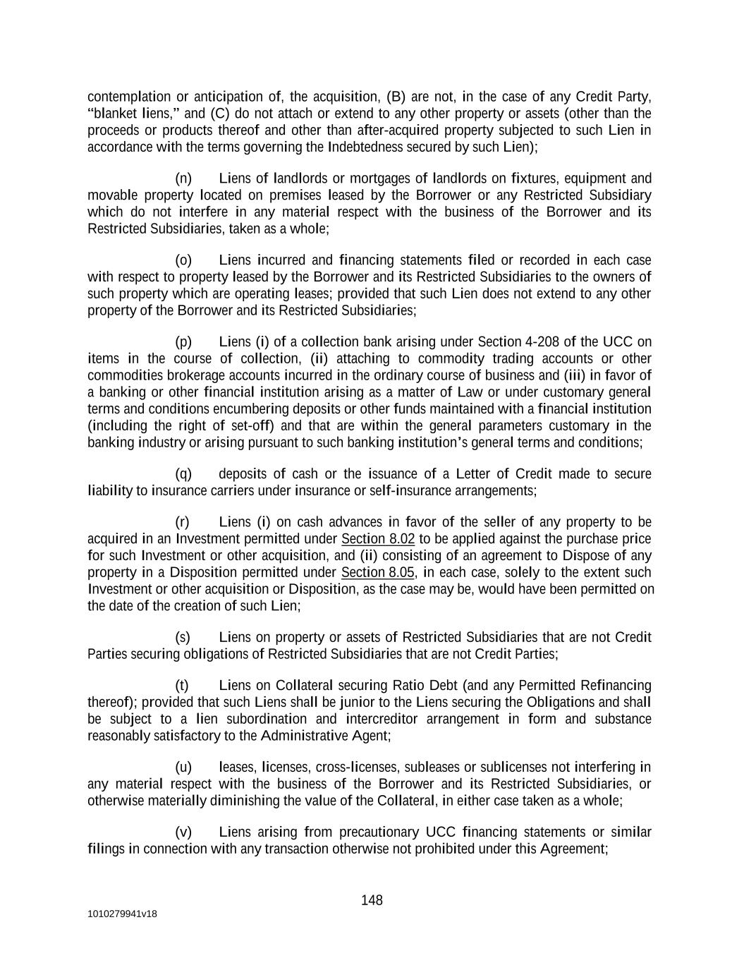 contemplation or anticipation of, the acquisition, (B) are not, in the case of any Credit Party, “blanket liens,” and (C) do not attach or extend to any other property or assets (other than the proceeds or products thereof and other than after-acquired property subjected to such Lien in accordance with the terms governing the Indebtedness secured by such Lien); (n) Liens of landlords or mortgages of landlords on fixtures, equipment and movable property located on premises leased by the Borrower or any Restricted Subsidiary which do not interfere in any material respect with the business of the Borrower and its Restricted Subsidiaries, taken as a whole; (o) Liens incurred and financing statements filed or recorded in each case with respect to property leased by the Borrower and its Restricted Subsidiaries to the owners of such property which are operating leases; provided that such Lien does not extend to any other property of the Borrower and its Restricted Subsidiaries; (p) Liens (i) of a collection bank arising under Section 4-208 of the UCC on items in the course of collection, (ii) attaching to commodity trading accounts or other commodities brokerage accounts incurred in the ordinary course of business and (iii) in favor of a banking or other financial institution arising as a matter of Law or under customary general terms and conditions encumbering deposits or other funds maintained with a financial institution (including the right of set-off) and that are within the general parameters customary in the banking industry or arising pursuant to such banking institution’s general terms and conditions; (q) deposits of cash or the issuance of a Letter of Credit made to secure liability to insurance carriers under insurance or self-insurance arrangements; (r) Liens (i) on cash advances in favor of the seller of any property to be acquired in an Investment permitted under Section 8.02 to be applied against the purchase price for such Investment or other acquisition, and (ii) consisting of an agreement to Dispose of any property in a Disposition permitted under Section 8.05, in each case, solely to the extent such Investment or other acquisition or Disposition, as the case may be, would have been permitted on the date of the creation of such Lien; (s) Liens on property or assets of Restricted Subsidiaries that are not Credit Parties securing obligations of Restricted Subsidiaries that are not Credit Parties; (t) Liens on Collateral securing Ratio Debt (and any Permitted Refinancing thereof); provided that such Liens shall be junior to the Liens securing the Obligations and shall be subject to a lien subordination and intercreditor arrangement in form and substance reasonably satisfactory to the Administrative Agent; (u) leases, licenses, cross-licenses, subleases or sublicenses not interfering in any material respect with the business of the Borrower and its Restricted Subsidiaries, or otherwise materially diminishing the value of the Collateral, in either case taken as a whole; (v) Liens arising from precautionary UCC financing statements or similar filings in connection with any transaction otherwise not prohibited under this Agreement; 148 1010279941v18