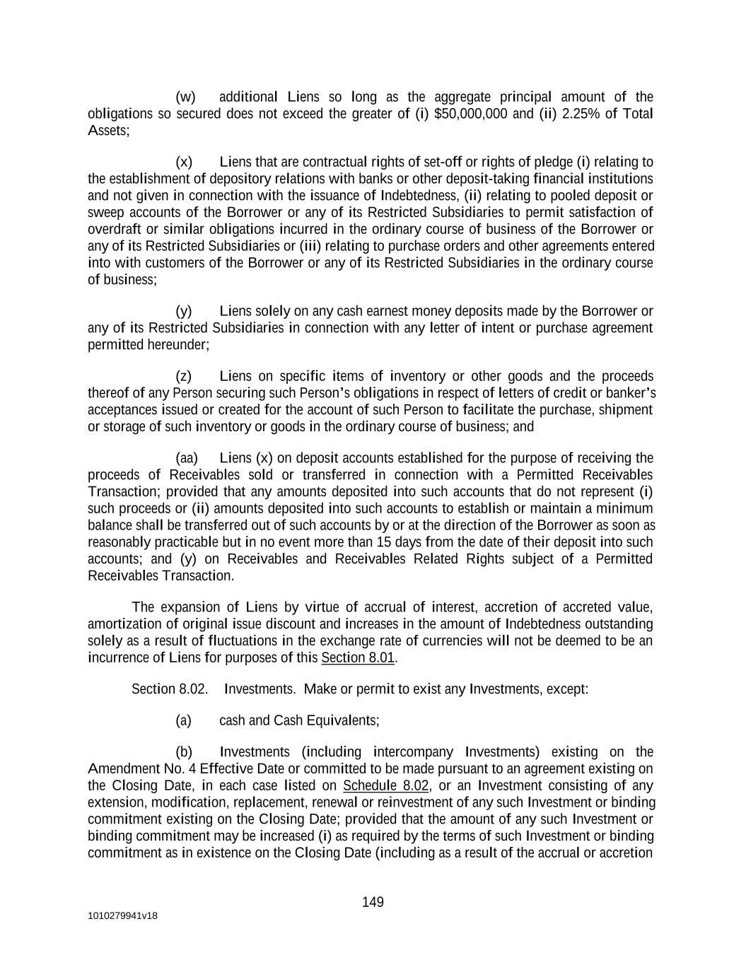 (w) additional Liens so long as the aggregate principal amount of the obligations so secured does not exceed the greater of (i) $50,000,000 and (ii) 2.25% of Total Assets; (x) Liens that are contractual rights of set-off or rights of pledge (i) relating to the establishment of depository relations with banks or other deposit-taking financial institutions and not given in connection with the issuance of Indebtedness, (ii) relating to pooled deposit or sweep accounts of the Borrower or any of its Restricted Subsidiaries to permit satisfaction of overdraft or similar obligations incurred in the ordinary course of business of the Borrower or any of its Restricted Subsidiaries or (iii) relating to purchase orders and other agreements entered into with customers of the Borrower or any of its Restricted Subsidiaries in the ordinary course of business; (y) Liens solely on any cash earnest money deposits made by the Borrower or any of its Restricted Subsidiaries in connection with any letter of intent or purchase agreement permitted hereunder; (z) Liens on specific items of inventory or other goods and the proceeds thereof of any Person securing such Person’s obligations in respect of letters of credit or banker’s acceptances issued or created for the account of such Person to facilitate the purchase, shipment or storage of such inventory or goods in the ordinary course of business; and (aa) Liens (x) on deposit accounts established for the purpose of receiving the proceeds of Receivables sold or transferred in connection with a Permitted Receivables Transaction; provided that any amounts deposited into such accounts that do not represent (i) such proceeds or (ii) amounts deposited into such accounts to establish or maintain a minimum balance shall be transferred out of such accounts by or at the direction of the Borrower as soon as reasonably practicable but in no event more than 15 days from the date of their deposit into such accounts; and (y) on Receivables and Receivables Related Rights subject of a Permitted Receivables Transaction. The expansion of Liens by virtue of accrual of interest, accretion of accreted value, amortization of original issue discount and increases in the amount of Indebtedness outstanding solely as a result of fluctuations in the exchange rate of currencies will not be deemed to be an incurrence of Liens for purposes of this Section 8.01. Section 8.02. Investments. Make or permit to exist any Investments, except: (a) cash and Cash Equivalents; (b) Investments (including intercompany Investments) existing on the Amendment No. 4 Effective Date or committed to be made pursuant to an agreement existing on the Closing Date, in each case listed on Schedule 8.02, or an Investment consisting of any extension, modification, replacement, renewal or reinvestment of any such Investment or binding commitment existing on the Closing Date; provided that the amount of any such Investment or binding commitment may be increased (i) as required by the terms of such Investment or binding commitment as in existence on the Closing Date (including as a result of the accrual or accretion 149 1010279941v18