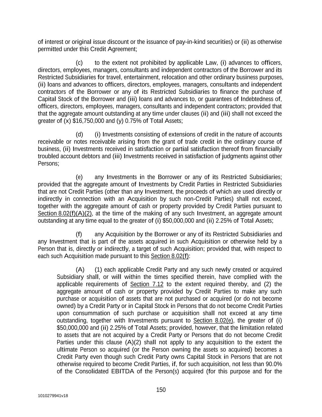 of interest or original issue discount or the issuance of pay-in-kind securities) or (ii) as otherwise permitted under this Credit Agreement; (c) to the extent not prohibited by applicable Law, (i) advances to officers, directors, employees, managers, consultants and independent contractors of the Borrower and its Restricted Subsidiaries for travel, entertainment, relocation and other ordinary business purposes, (ii) loans and advances to officers, directors, employees, managers, consultants and independent contractors of the Borrower or any of its Restricted Subsidiaries to finance the purchase of Capital Stock of the Borrower and (iii) loans and advances to, or guarantees of Indebtedness of, officers, directors, employees, managers, consultants and independent contractors; provided that that the aggregate amount outstanding at any time under clauses (ii) and (iii) shall not exceed the greater of (x) $16,750,000 and (y) 0.75% of Total Assets; (d) (i) Investments consisting of extensions of credit in the nature of accounts receivable or notes receivable arising from the grant of trade credit in the ordinary course of business, (ii) Investments received in satisfaction or partial satisfaction thereof from financially troubled account debtors and (iii) Investments received in satisfaction of judgments against other Persons; (e) any Investments in the Borrower or any of its Restricted Subsidiaries; provided that the aggregate amount of Investments by Credit Parties in Restricted Subsidiaries that are not Credit Parties (other than any Investment, the proceeds of which are used directly or indirectly in connection with an Acquisition by such non-Credit Parties) shall not exceed, together with the aggregate amount of cash or property provided by Credit Parties pursuant to Section 8.02(f)(A)(2), at the time of the making of any such Investment, an aggregate amount outstanding at any time equal to the greater of (i) $50,000,000 and (ii) 2.25% of Total Assets; (f) any Acquisition by the Borrower or any of its Restricted Subsidiaries and any Investment that is part of the assets acquired in such Acquisition or otherwise held by a Person that is, directly or indirectly, a target of such Acquisition; provided that, with respect to each such Acquisition made pursuant to this Section 8.02(f): (A) (1) each applicable Credit Party and any such newly created or acquired Subsidiary shall, or will within the times specified therein, have complied with the applicable requirements of Section 7.12 to the extent required thereby, and (2) the aggregate amount of cash or property provided by Credit Parties to make any such purchase or acquisition of assets that are not purchased or acquired (or do not become owned) by a Credit Party or in Capital Stock in Persons that do not become Credit Parties upon consummation of such purchase or acquisition shall not exceed at any time outstanding, together with Investments pursuant to Section 8.02(e), the greater of (i) $50,000,000 and (ii) 2.25% of Total Assets; provided, however, that the limitation related to assets that are not acquired by a Credit Party or Persons that do not become Credit Parties under this clause (A)(2) shall not apply to any acquisition to the extent the ultimate Person so acquired (or the Person owning the assets so acquired) becomes a Credit Party even though such Credit Party owns Capital Stock in Persons that are not otherwise required to become Credit Parties, if, for such acquisition, not less than 90.0% of the Consolidated EBITDA of the Person(s) acquired (for this purpose and for the 150 1010279941v18