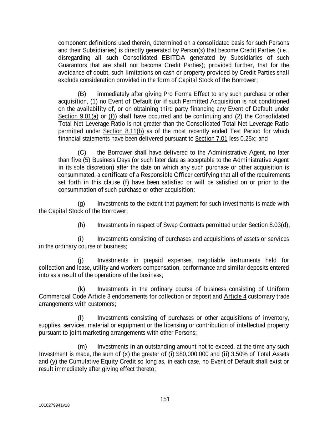 component definitions used therein, determined on a consolidated basis for such Persons and their Subsidiaries) is directly generated by Person(s) that become Credit Parties (i.e., disregarding all such Consolidated EBITDA generated by Subsidiaries of such Guarantors that are shall not become Credit Parties); provided further, that for the avoidance of doubt, such limitations on cash or property provided by Credit Parties shall exclude consideration provided in the form of Capital Stock of the Borrower; (B) immediately after giving Pro Forma Effect to any such purchase or other acquisition, (1) no Event of Default (or if such Permitted Acquisition is not conditioned on the availability of, or on obtaining third party financing any Event of Default under Section 9.01(a) or (f)) shall have occurred and be continuing and (2) the Consolidated Total Net Leverage Ratio is not greater than the Consolidated Total Net Leverage Ratio permitted under Section 8.11(b) as of the most recently ended Test Period for which financial statements have been delivered pursuant to Section 7.01 less 0.25x; and (C) the Borrower shall have delivered to the Administrative Agent, no later than five (5) Business Days (or such later date as acceptable to the Administrative Agent in its sole discretion) after the date on which any such purchase or other acquisition is consummated, a certificate of a Responsible Officer certifying that all of the requirements set forth in this clause (f) have been satisfied or will be satisfied on or prior to the consummation of such purchase or other acquisition; (g) Investments to the extent that payment for such investments is made with the Capital Stock of the Borrower; (h) Investments in respect of Swap Contracts permitted under Section 8.03(d); (i) Investments consisting of purchases and acquisitions of assets or services in the ordinary course of business; (j) Investments in prepaid expenses, negotiable instruments held for collection and lease, utility and workers compensation, performance and similar deposits entered into as a result of the operations of the business; (k) Investments in the ordinary course of business consisting of Uniform Commercial Code Article 3 endorsements for collection or deposit and Article 4 customary trade arrangements with customers; (l) Investments consisting of purchases or other acquisitions of inventory, supplies, services, material or equipment or the licensing or contribution of intellectual property pursuant to joint marketing arrangements with other Persons; (m) Investments in an outstanding amount not to exceed, at the time any such Investment is made, the sum of (x) the greater of (i) $80,000,000 and (ii) 3.50% of Total Assets and (y) the Cumulative Equity Credit so long as, in each case, no Event of Default shall exist or result immediately after giving effect thereto; 151 1010279941v18