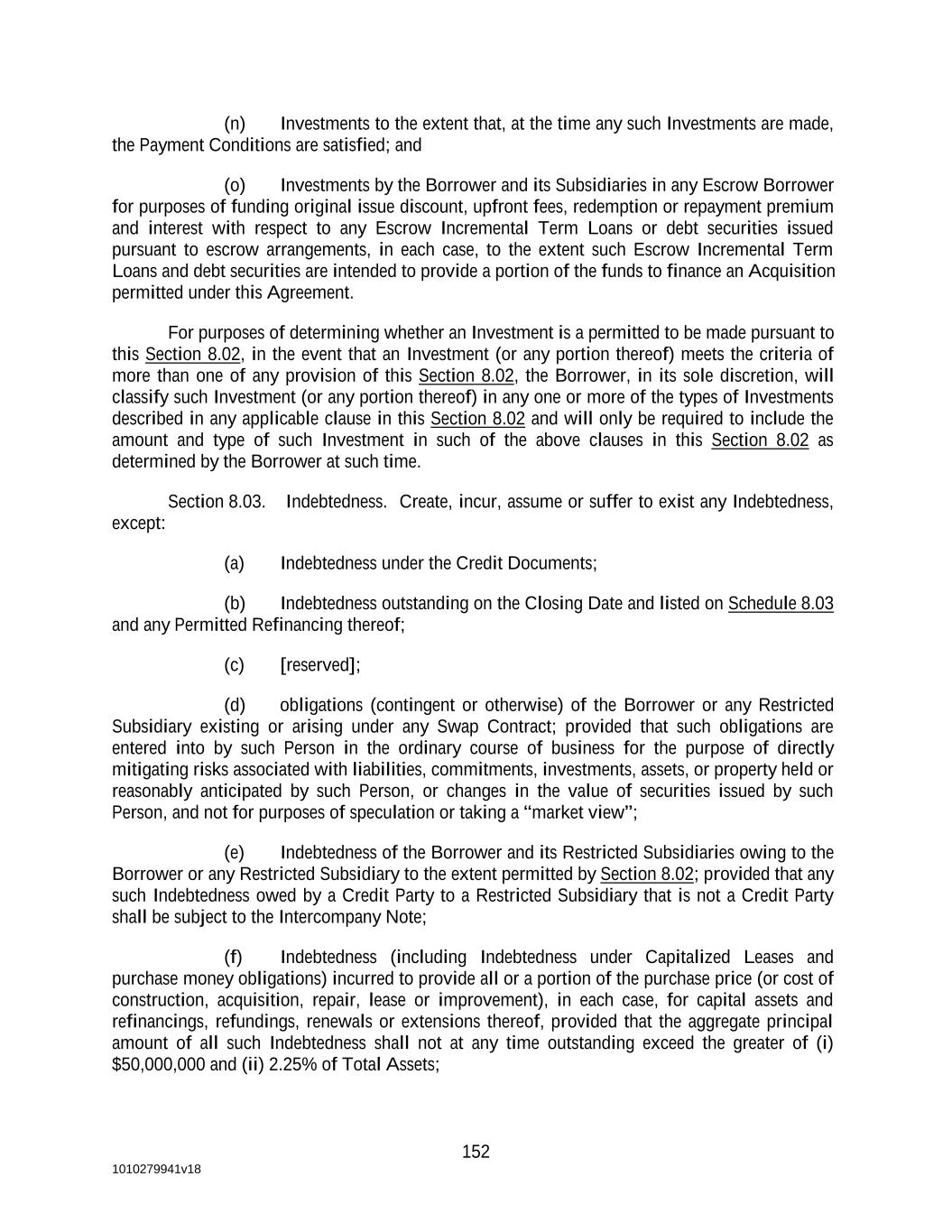 (n) Investments to the extent that, at the time any such Investments are made, the Payment Conditions are satisfied; and (o) Investments by the Borrower and its Subsidiaries in any Escrow Borrower for purposes of funding original issue discount, upfront fees, redemption or repayment premium and interest with respect to any Escrow Incremental Term Loans or debt securities issued pursuant to escrow arrangements, in each case, to the extent such Escrow Incremental Term Loans and debt securities are intended to provide a portion of the funds to finance an Acquisition permitted under this Agreement. For purposes of determining whether an Investment is a permitted to be made pursuant to this Section 8.02, in the event that an Investment (or any portion thereof) meets the criteria of more than one of any provision of this Section 8.02, the Borrower, in its sole discretion, will classify such Investment (or any portion thereof) in any one or more of the types of Investments described in any applicable clause in this Section 8.02 and will only be required to include the amount and type of such Investment in such of the above clauses in this Section 8.02 as determined by the Borrower at such time. Section 8.03. Indebtedness. Create, incur, assume or suffer to exist any Indebtedness, except: (a) Indebtedness under the Credit Documents; (b) Indebtedness outstanding on the Closing Date and listed on Schedule 8.03 and any Permitted Refinancing thereof; (c) [reserved]; (d) obligations (contingent or otherwise) of the Borrower or any Restricted Subsidiary existing or arising under any Swap Contract; provided that such obligations are entered into by such Person in the ordinary course of business for the purpose of directly mitigating risks associated with liabilities, commitments, investments, assets, or property held or reasonably anticipated by such Person, or changes in the value of securities issued by such Person, and not for purposes of speculation or taking a “market view”; (e) Indebtedness of the Borrower and its Restricted Subsidiaries owing to the Borrower or any Restricted Subsidiary to the extent permitted by Section 8.02; provided that any such Indebtedness owed by a Credit Party to a Restricted Subsidiary that is not a Credit Party shall be subject to the Intercompany Note; (f) Indebtedness (including Indebtedness under Capitalized Leases and purchase money obligations) incurred to provide all or a portion of the purchase price (or cost of construction, acquisition, repair, lease or improvement), in each case, for capital assets and refinancings, refundings, renewals or extensions thereof, provided that the aggregate principal amount of all such Indebtedness shall not at any time outstanding exceed the greater of (i) $50,000,000 and (ii) 2.25% of Total Assets; 152 1010279941v18