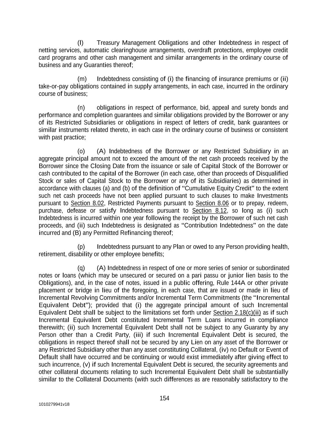 (l) Treasury Management Obligations and other Indebtedness in respect of netting services, automatic clearinghouse arrangements, overdraft protections, employee credit card programs and other cash management and similar arrangements in the ordinary course of business and any Guaranties thereof; (m) Indebtedness consisting of (i) the financing of insurance premiums or (ii) take-or-pay obligations contained in supply arrangements, in each case, incurred in the ordinary course of business; (n) obligations in respect of performance, bid, appeal and surety bonds and performance and completion guarantees and similar obligations provided by the Borrower or any of its Restricted Subsidiaries or obligations in respect of letters of credit, bank guarantees or similar instruments related thereto, in each case in the ordinary course of business or consistent with past practice; (o) (A) Indebtedness of the Borrower or any Restricted Subsidiary in an aggregate principal amount not to exceed the amount of the net cash proceeds received by the Borrower since the Closing Date from the issuance or sale of Capital Stock of the Borrower or cash contributed to the capital of the Borrower (in each case, other than proceeds of Disqualified Stock or sales of Capital Stock to the Borrower or any of its Subsidiaries) as determined in accordance with clauses (a) and (b) of the definition of “Cumulative Equity Credit” to the extent such net cash proceeds have not been applied pursuant to such clauses to make Investments pursuant to Section 8.02, Restricted Payments pursuant to Section 8.06 or to prepay, redeem, purchase, defease or satisfy Indebtedness pursuant to Section 8.12, so long as (i) such Indebtedness is incurred within one year following the receipt by the Borrower of such net cash proceeds, and (ii) such Indebtedness is designated as “Contribution Indebtedness” on the date incurred and (B) any Permitted Refinancing thereof; (p) Indebtedness pursuant to any Plan or owed to any Person providing health, retirement, disability or other employee benefits; (q) (A) Indebtedness in respect of one or more series of senior or subordinated notes or loans (which may be unsecured or secured on a pari passu or junior lien basis to the Obligations), and, in the case of notes, issued in a public offering, Rule 144A or other private placement or bridge in lieu of the foregoing, in each case, that are issued or made in lieu of Incremental Revolving Commitments and/or Incremental Term Commitments (the “Incremental Equivalent Debt”); provided that (i) the aggregate principal amount of such Incremental Equivalent Debt shall be subject to the limitations set forth under Section 2.18(c)(ii) as if such Incremental Equivalent Debt constituted Incremental Term Loans incurred in compliance therewith; (ii) such Incremental Equivalent Debt shall not be subject to any Guaranty by any Person other than a Credit Party, (iii) if such Incremental Equivalent Debt is secured, the obligations in respect thereof shall not be secured by any Lien on any asset of the Borrower or any Restricted Subsidiary other than any asset constituting Collateral, (iv) no Default or Event of Default shall have occurred and be continuing or would exist immediately after giving effect to such incurrence, (v) if such Incremental Equivalent Debt is secured, the security agreements and other collateral documents relating to such Incremental Equivalent Debt shall be substantially similar to the Collateral Documents (with such differences as are reasonably satisfactory to the 154 1010279941v18