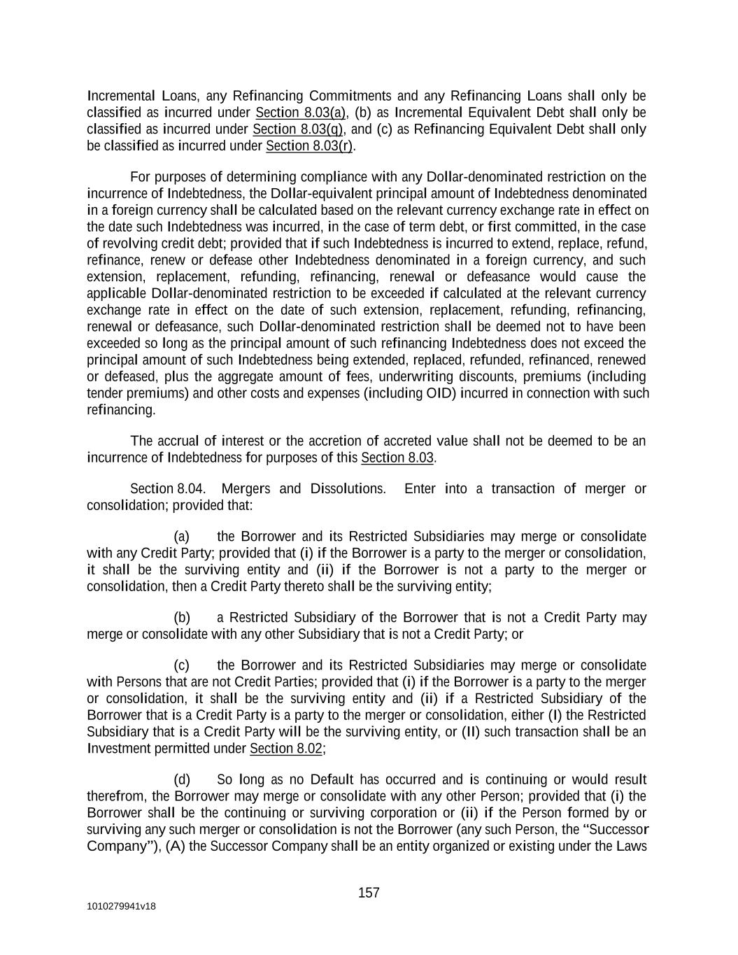 Incremental Loans, any Refinancing Commitments and any Refinancing Loans shall only be classified as incurred under Section 8.03(a), (b) as Incremental Equivalent Debt shall only be classified as incurred under Section 8.03(q), and (c) as Refinancing Equivalent Debt shall only be classified as incurred under Section 8.03(r). For purposes of determining compliance with any Dollar-denominated restriction on the incurrence of Indebtedness, the Dollar-equivalent principal amount of Indebtedness denominated in a foreign currency shall be calculated based on the relevant currency exchange rate in effect on the date such Indebtedness was incurred, in the case of term debt, or first committed, in the case of revolving credit debt; provided that if such Indebtedness is incurred to extend, replace, refund, refinance, renew or defease other Indebtedness denominated in a foreign currency, and such extension, replacement, refunding, refinancing, renewal or defeasance would cause the applicable Dollar-denominated restriction to be exceeded if calculated at the relevant currency exchange rate in effect on the date of such extension, replacement, refunding, refinancing, renewal or defeasance, such Dollar-denominated restriction shall be deemed not to have been exceeded so long as the principal amount of such refinancing Indebtedness does not exceed the principal amount of such Indebtedness being extended, replaced, refunded, refinanced, renewed or defeased, plus the aggregate amount of fees, underwriting discounts, premiums (including tender premiums) and other costs and expenses (including OID) incurred in connection with such refinancing. The accrual of interest or the accretion of accreted value shall not be deemed to be an incurrence of Indebtedness for purposes of this Section 8.03. Section 8.04. Mergers and Dissolutions. Enter into a transaction of merger or consolidation; provided that: (a) the Borrower and its Restricted Subsidiaries may merge or consolidate with any Credit Party; provided that (i) if the Borrower is a party to the merger or consolidation, it shall be the surviving entity and (ii) if the Borrower is not a party to the merger or consolidation, then a Credit Party thereto shall be the surviving entity; (b) a Restricted Subsidiary of the Borrower that is not a Credit Party may merge or consolidate with any other Subsidiary that is not a Credit Party; or (c) the Borrower and its Restricted Subsidiaries may merge or consolidate with Persons that are not Credit Parties; provided that (i) if the Borrower is a party to the merger or consolidation, it shall be the surviving entity and (ii) if a Restricted Subsidiary of the Borrower that is a Credit Party is a party to the merger or consolidation, either (I) the Restricted Subsidiary that is a Credit Party will be the surviving entity, or (II) such transaction shall be an Investment permitted under Section 8.02; (d) So long as no Default has occurred and is continuing or would result therefrom, the Borrower may merge or consolidate with any other Person; provided that (i) the Borrower shall be the continuing or surviving corporation or (ii) if the Person formed by or surviving any such merger or consolidation is not the Borrower (any such Person, the “Successor Company”), (A) the Successor Company shall be an entity organized or existing under the Laws 157 1010279941v18