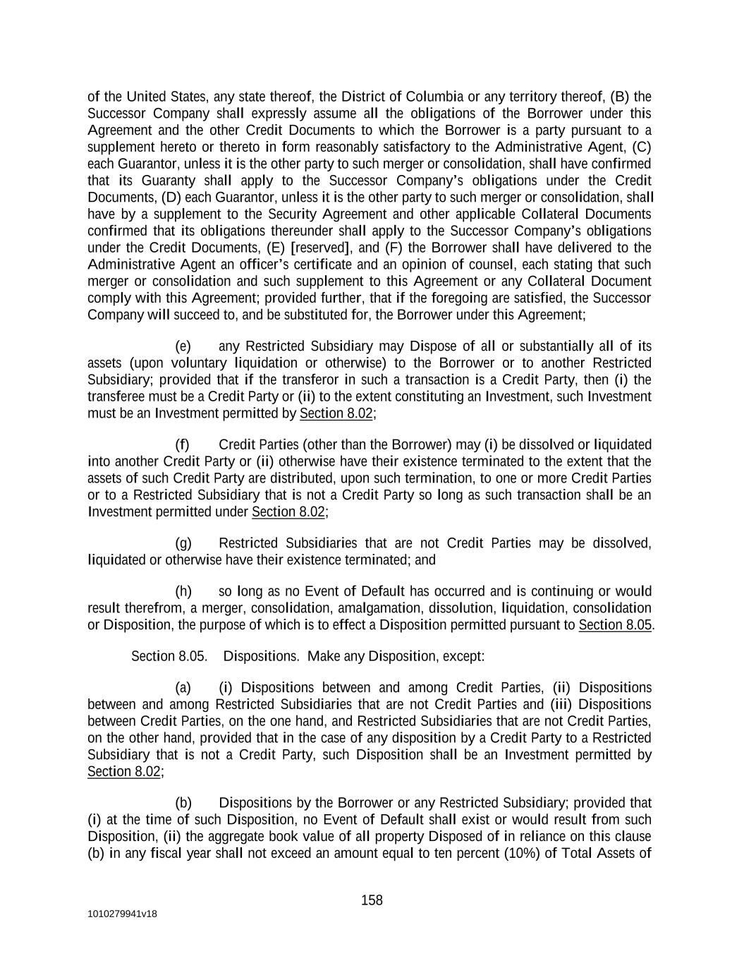 of the United States, any state thereof, the District of Columbia or any territory thereof, (B) the Successor Company shall expressly assume all the obligations of the Borrower under this Agreement and the other Credit Documents to which the Borrower is a party pursuant to a supplement hereto or thereto in form reasonably satisfactory to the Administrative Agent, (C) each Guarantor, unless it is the other party to such merger or consolidation, shall have confirmed that its Guaranty shall apply to the Successor Company’s obligations under the Credit Documents, (D) each Guarantor, unless it is the other party to such merger or consolidation, shall have by a supplement to the Security Agreement and other applicable Collateral Documents confirmed that its obligations thereunder shall apply to the Successor Company’s obligations under the Credit Documents, (E) [reserved], and (F) the Borrower shall have delivered to the Administrative Agent an officer’s certificate and an opinion of counsel, each stating that such merger or consolidation and such supplement to this Agreement or any Collateral Document comply with this Agreement; provided further, that if the foregoing are satisfied, the Successor Company will succeed to, and be substituted for, the Borrower under this Agreement; (e) any Restricted Subsidiary may Dispose of all or substantially all of its assets (upon voluntary liquidation or otherwise) to the Borrower or to another Restricted Subsidiary; provided that if the transferor in such a transaction is a Credit Party, then (i) the transferee must be a Credit Party or (ii) to the extent constituting an Investment, such Investment must be an Investment permitted by Section 8.02; (f) Credit Parties (other than the Borrower) may (i) be dissolved or liquidated into another Credit Party or (ii) otherwise have their existence terminated to the extent that the assets of such Credit Party are distributed, upon such termination, to one or more Credit Parties or to a Restricted Subsidiary that is not a Credit Party so long as such transaction shall be an Investment permitted under Section 8.02; (g) Restricted Subsidiaries that are not Credit Parties may be dissolved, liquidated or otherwise have their existence terminated; and (h) so long as no Event of Default has occurred and is continuing or would result therefrom, a merger, consolidation, amalgamation, dissolution, liquidation, consolidation or Disposition, the purpose of which is to effect a Disposition permitted pursuant to Section 8.05. Section 8.05. Dispositions. Make any Disposition, except: (a) (i) Dispositions between and among Credit Parties, (ii) Dispositions between and among Restricted Subsidiaries that are not Credit Parties and (iii) Dispositions between Credit Parties, on the one hand, and Restricted Subsidiaries that are not Credit Parties, on the other hand, provided that in the case of any disposition by a Credit Party to a Restricted Subsidiary that is not a Credit Party, such Disposition shall be an Investment permitted by Section 8.02; (b) Dispositions by the Borrower or any Restricted Subsidiary; provided that (i) at the time of such Disposition, no Event of Default shall exist or would result from such Disposition, (ii) the aggregate book value of all property Disposed of in reliance on this clause (b) in any fiscal year shall not exceed an amount equal to ten percent (10%) of Total Assets of 158 1010279941v18