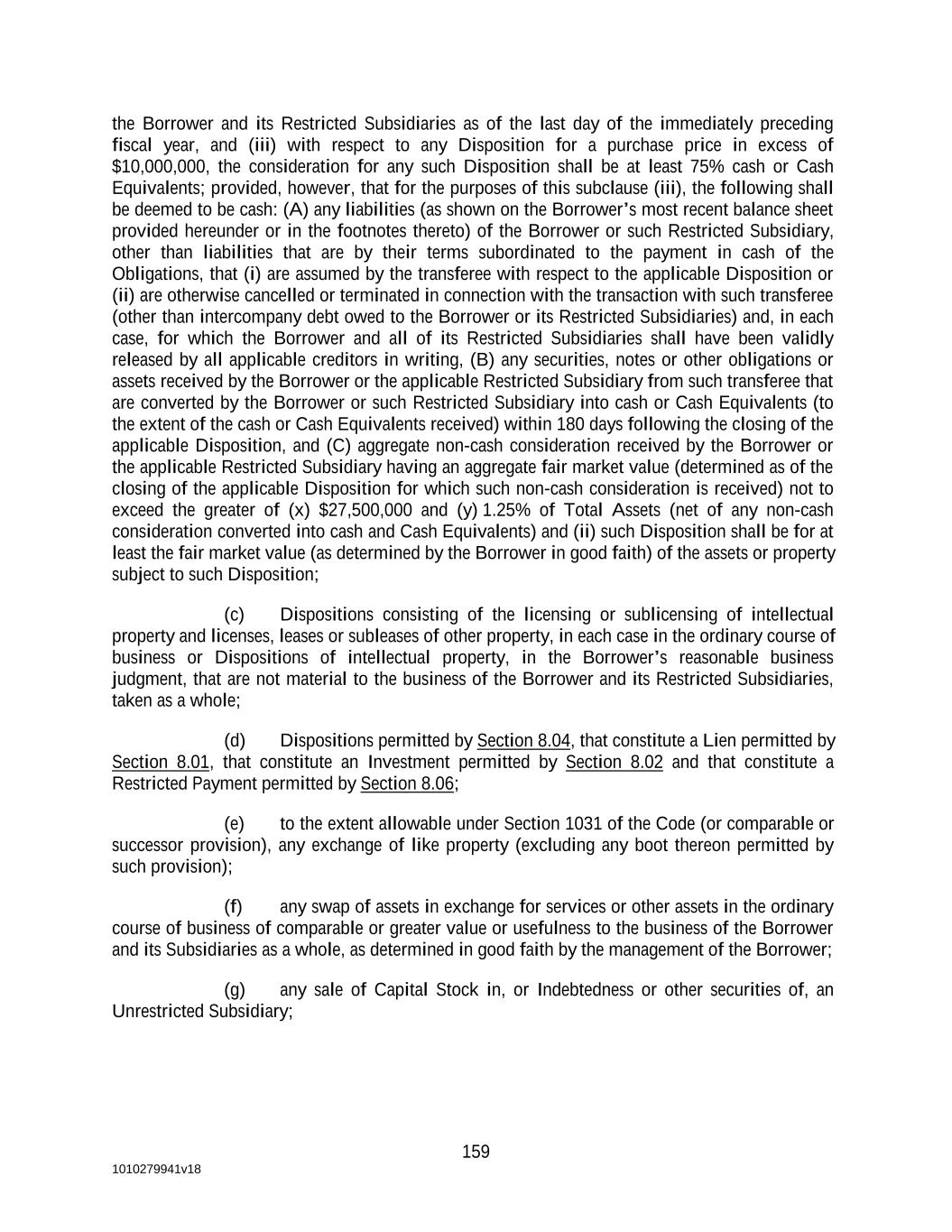 the Borrower and its Restricted Subsidiaries as of the last day of the immediately preceding fiscal year, and (iii) with respect to any Disposition for a purchase price in excess of $10,000,000, the consideration for any such Disposition shall be at least 75% cash or Cash Equivalents; provided, however, that for the purposes of this subclause (iii), the following shall be deemed to be cash: (A) any liabilities (as shown on the Borrower’s most recent balance sheet provided hereunder or in the footnotes thereto) of the Borrower or such Restricted Subsidiary, other than liabilities that are by their terms subordinated to the payment in cash of the Obligations, that (i) are assumed by the transferee with respect to the applicable Disposition or (ii) are otherwise cancelled or terminated in connection with the transaction with such transferee (other than intercompany debt owed to the Borrower or its Restricted Subsidiaries) and, in each case, for which the Borrower and all of its Restricted Subsidiaries shall have been validly released by all applicable creditors in writing, (B) any securities, notes or other obligations or assets received by the Borrower or the applicable Restricted Subsidiary from such transferee that are converted by the Borrower or such Restricted Subsidiary into cash or Cash Equivalents (to the extent of the cash or Cash Equivalents received) within 180 days following the closing of the applicable Disposition, and (C) aggregate non-cash consideration received by the Borrower or the applicable Restricted Subsidiary having an aggregate fair market value (determined as of the closing of the applicable Disposition for which such non-cash consideration is received) not to exceed the greater of (x) $27,500,000 and (y) 1.25% of Total Assets (net of any non-cash consideration converted into cash and Cash Equivalents) and (ii) such Disposition shall be for at least the fair market value (as determined by the Borrower in good faith) of the assets or property subject to such Disposition; (c) Dispositions consisting of the licensing or sublicensing of intellectual property and licenses, leases or subleases of other property, in each case in the ordinary course of business or Dispositions of intellectual property, in the Borrower’s reasonable business judgment, that are not material to the business of the Borrower and its Restricted Subsidiaries, taken as a whole; (d) Dispositions permitted by Section 8.04, that constitute a Lien permitted by Section 8.01, that constitute an Investment permitted by Section 8.02 and that constitute a Restricted Payment permitted by Section 8.06; (e) to the extent allowable under Section 1031 of the Code (or comparable or successor provision), any exchange of like property (excluding any boot thereon permitted by such provision); (f) any swap of assets in exchange for services or other assets in the ordinary course of business of comparable or greater value or usefulness to the business of the Borrower and its Subsidiaries as a whole, as determined in good faith by the management of the Borrower; (g) any sale of Capital Stock in, or Indebtedness or other securities of, an Unrestricted Subsidiary; 159 1010279941v18