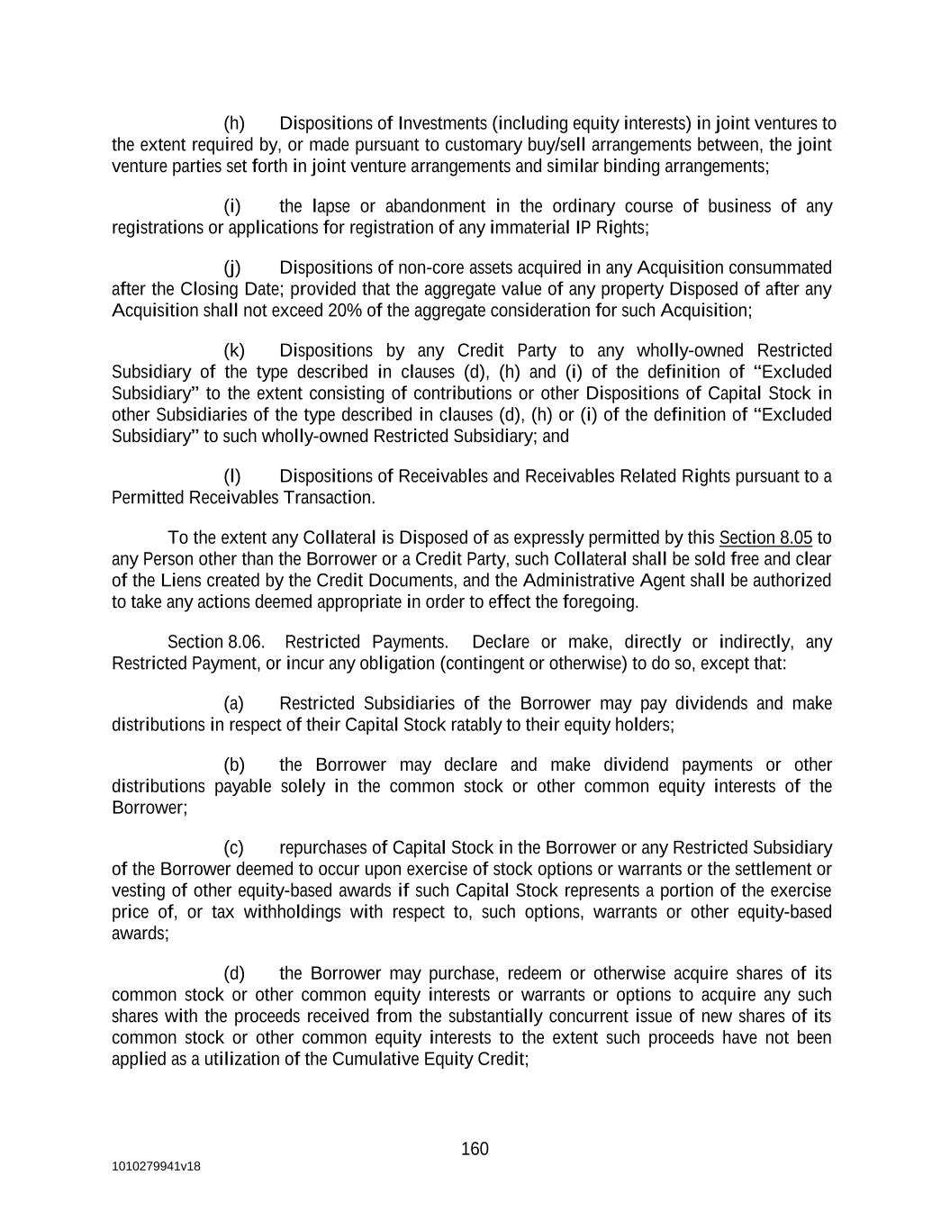 (h) Dispositions of Investments (including equity interests) in joint ventures to the extent required by, or made pursuant to customary buy/sell arrangements between, the joint venture parties set forth in joint venture arrangements and similar binding arrangements; (i) the lapse or abandonment in the ordinary course of business of any registrations or applications for registration of any immaterial IP Rights; (j) Dispositions of non-core assets acquired in any Acquisition consummated after the Closing Date; provided that the aggregate value of any property Disposed of after any Acquisition shall not exceed 20% of the aggregate consideration for such Acquisition; (k) Dispositions by any Credit Party to any wholly-owned Restricted Subsidiary of the type described in clauses (d), (h) and (i) of the definition of “Excluded Subsidiary” to the extent consisting of contributions or other Dispositions of Capital Stock in other Subsidiaries of the type described in clauses (d), (h) or (i) of the definition of “Excluded Subsidiary” to such wholly-owned Restricted Subsidiary; and (l) Dispositions of Receivables and Receivables Related Rights pursuant to a Permitted Receivables Transaction. To the extent any Collateral is Disposed of as expressly permitted by this Section 8.05 to any Person other than the Borrower or a Credit Party, such Collateral shall be sold free and clear of the Liens created by the Credit Documents, and the Administrative Agent shall be authorized to take any actions deemed appropriate in order to effect the foregoing. Section 8.06. Restricted Payments. Declare or make, directly or indirectly, any Restricted Payment, or incur any obligation (contingent or otherwise) to do so, except that: (a) Restricted Subsidiaries of the Borrower may pay dividends and make distributions in respect of their Capital Stock ratably to their equity holders; (b) the Borrower may declare and make dividend payments or other distributions payable solely in the common stock or other common equity interests of the Borrower; (c) repurchases of Capital Stock in the Borrower or any Restricted Subsidiary of the Borrower deemed to occur upon exercise of stock options or warrants or the settlement or vesting of other equity-based awards if such Capital Stock represents a portion of the exercise price of, or tax withholdings with respect to, such options, warrants or other equity-based awards; (d) the Borrower may purchase, redeem or otherwise acquire shares of its common stock or other common equity interests or warrants or options to acquire any such shares with the proceeds received from the substantially concurrent issue of new shares of its common stock or other common equity interests to the extent such proceeds have not been applied as a utilization of the Cumulative Equity Credit; 160 1010279941v18