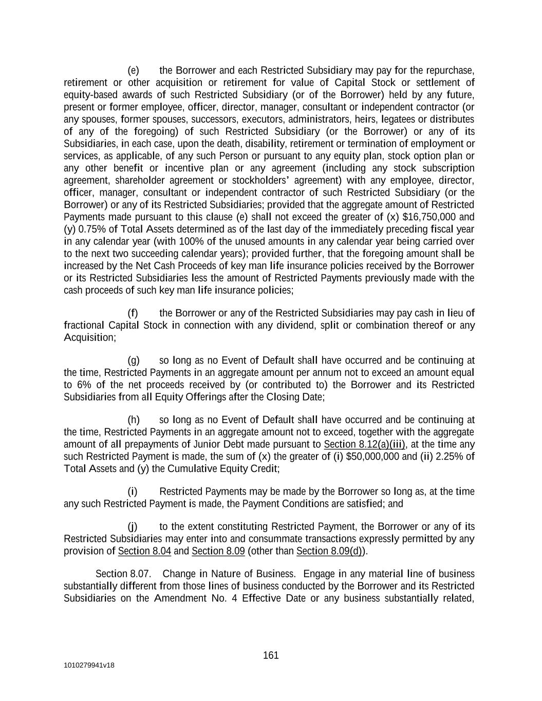 (e) the Borrower and each Restricted Subsidiary may pay for the repurchase, retirement or other acquisition or retirement for value of Capital Stock or settlement of equity-based awards of such Restricted Subsidiary (or of the Borrower) held by any future, present or former employee, officer, director, manager, consultant or independent contractor (or any spouses, former spouses, successors, executors, administrators, heirs, legatees or distributes of any of the foregoing) of such Restricted Subsidiary (or the Borrower) or any of its Subsidiaries, in each case, upon the death, disability, retirement or termination of employment or services, as applicable, of any such Person or pursuant to any equity plan, stock option plan or any other benefit or incentive plan or any agreement (including any stock subscription agreement, shareholder agreement or stockholders’ agreement) with any employee, director, officer, manager, consultant or independent contractor of such Restricted Subsidiary (or the Borrower) or any of its Restricted Subsidiaries; provided that the aggregate amount of Restricted Payments made pursuant to this clause (e) shall not exceed the greater of (x) $16,750,000 and (y) 0.75% of Total Assets determined as of the last day of the immediately preceding fiscal year in any calendar year (with 100% of the unused amounts in any calendar year being carried over to the next two succeeding calendar years); provided further, that the foregoing amount shall be increased by the Net Cash Proceeds of key man life insurance policies received by the Borrower or its Restricted Subsidiaries less the amount of Restricted Payments previously made with the cash proceeds of such key man life insurance policies; (f) the Borrower or any of the Restricted Subsidiaries may pay cash in lieu of fractional Capital Stock in connection with any dividend, split or combination thereof or any Acquisition; (g) so long as no Event of Default shall have occurred and be continuing at the time, Restricted Payments in an aggregate amount per annum not to exceed an amount equal to 6% of the net proceeds received by (or contributed to) the Borrower and its Restricted Subsidiaries from all Equity Offerings after the Closing Date; (h) so long as no Event of Default shall have occurred and be continuing at the time, Restricted Payments in an aggregate amount not to exceed, together with the aggregate amount of all prepayments of Junior Debt made pursuant to Section 8.12(a)(iii), at the time any such Restricted Payment is made, the sum of (x) the greater of (i) $50,000,000 and (ii) 2.25% of Total Assets and (y) the Cumulative Equity Credit; (i) Restricted Payments may be made by the Borrower so long as, at the time any such Restricted Payment is made, the Payment Conditions are satisfied; and (j) to the extent constituting Restricted Payment, the Borrower or any of its Restricted Subsidiaries may enter into and consummate transactions expressly permitted by any provision of Section 8.04 and Section 8.09 (other than Section 8.09(d)). Section 8.07. Change in Nature of Business. Engage in any material line of business substantially different from those lines of business conducted by the Borrower and its Restricted Subsidiaries on the Amendment No. 4 Effective Date or any business substantially related, 161 1010279941v18
