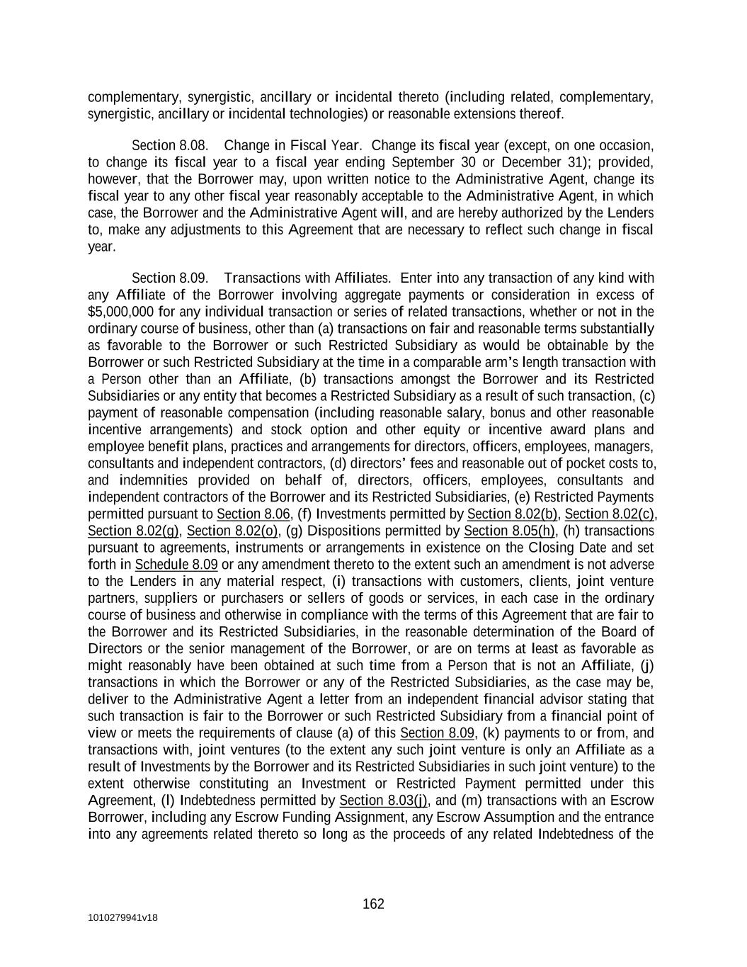 complementary, synergistic, ancillary or incidental thereto (including related, complementary, synergistic, ancillary or incidental technologies) or reasonable extensions thereof. Section 8.08. Change in Fiscal Year. Change its fiscal year (except, on one occasion, to change its fiscal year to a fiscal year ending September 30 or December 31); provided, however, that the Borrower may, upon written notice to the Administrative Agent, change its fiscal year to any other fiscal year reasonably acceptable to the Administrative Agent, in which case, the Borrower and the Administrative Agent will, and are hereby authorized by the Lenders to, make any adjustments to this Agreement that are necessary to reflect such change in fiscal year. Section 8.09. Transactions with Affiliates. Enter into any transaction of any kind with any Affiliate of the Borrower involving aggregate payments or consideration in excess of $5,000,000 for any individual transaction or series of related transactions, whether or not in the ordinary course of business, other than (a) transactions on fair and reasonable terms substantially as favorable to the Borrower or such Restricted Subsidiary as would be obtainable by the Borrower or such Restricted Subsidiary at the time in a comparable arm’s length transaction with a Person other than an Affiliate, (b) transactions amongst the Borrower and its Restricted Subsidiaries or any entity that becomes a Restricted Subsidiary as a result of such transaction, (c) payment of reasonable compensation (including reasonable salary, bonus and other reasonable incentive arrangements) and stock option and other equity or incentive award plans and employee benefit plans, practices and arrangements for directors, officers, employees, managers, consultants and independent contractors, (d) directors’ fees and reasonable out of pocket costs to, and indemnities provided on behalf of, directors, officers, employees, consultants and independent contractors of the Borrower and its Restricted Subsidiaries, (e) Restricted Payments permitted pursuant to Section 8.06, (f) Investments permitted by Section 8.02(b), Section 8.02(c), Section 8.02(g), Section 8.02(o), (g) Dispositions permitted by Section 8.05(h), (h) transactions pursuant to agreements, instruments or arrangements in existence on the Closing Date and set forth in Schedule 8.09 or any amendment thereto to the extent such an amendment is not adverse to the Lenders in any material respect, (i) transactions with customers, clients, joint venture partners, suppliers or purchasers or sellers of goods or services, in each case in the ordinary course of business and otherwise in compliance with the terms of this Agreement that are fair to the Borrower and its Restricted Subsidiaries, in the reasonable determination of the Board of Directors or the senior management of the Borrower, or are on terms at least as favorable as might reasonably have been obtained at such time from a Person that is not an Affiliate, (j) transactions in which the Borrower or any of the Restricted Subsidiaries, as the case may be, deliver to the Administrative Agent a letter from an independent financial advisor stating that such transaction is fair to the Borrower or such Restricted Subsidiary from a financial point of view or meets the requirements of clause (a) of this Section 8.09, (k) payments to or from, and transactions with, joint ventures (to the extent any such joint venture is only an Affiliate as a result of Investments by the Borrower and its Restricted Subsidiaries in such joint venture) to the extent otherwise constituting an Investment or Restricted Payment permitted under this Agreement, (l) Indebtedness permitted by Section 8.03(j), and (m) transactions with an Escrow Borrower, including any Escrow Funding Assignment, any Escrow Assumption and the entrance into any agreements related thereto so long as the proceeds of any related Indebtedness of the 162 1010279941v18