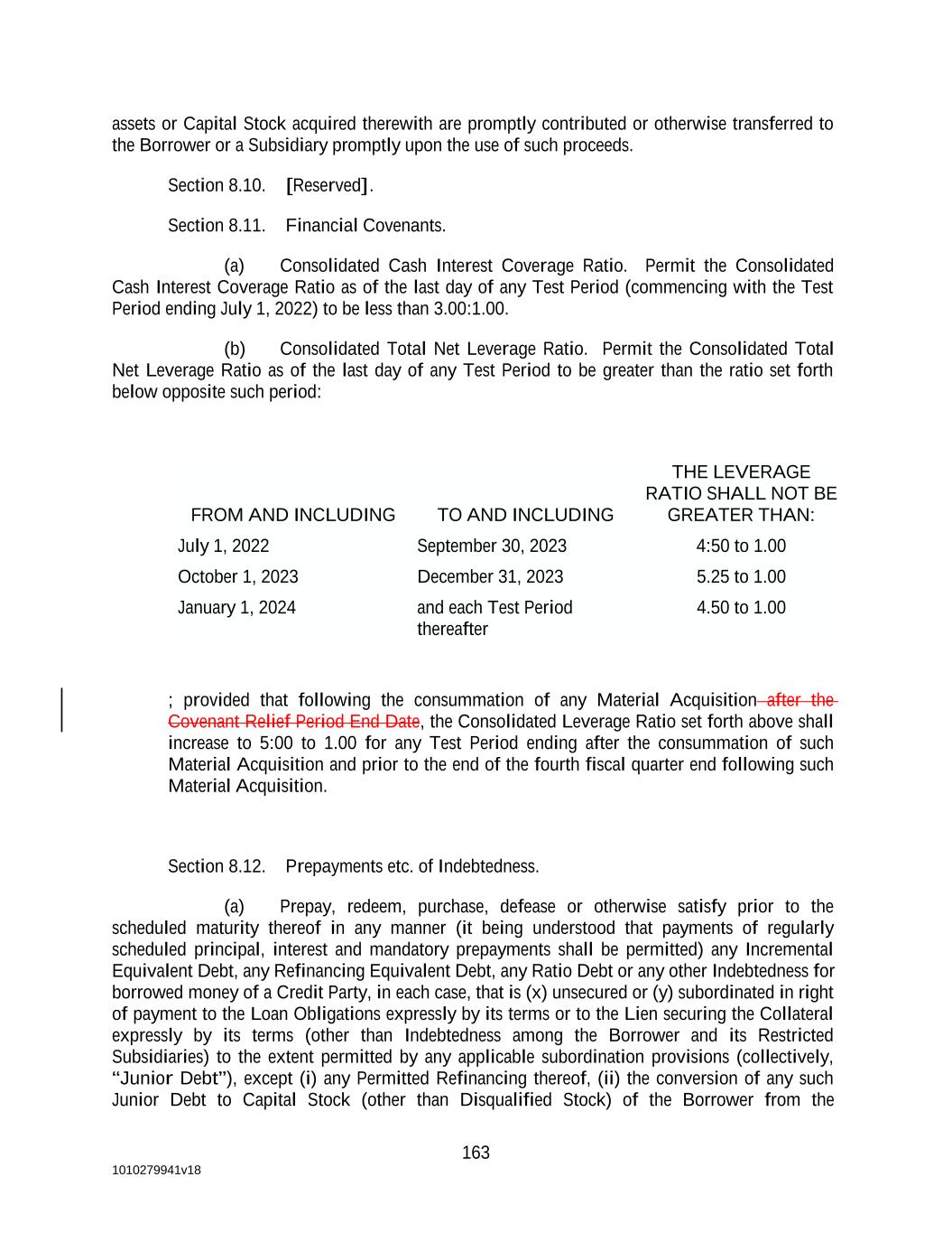 163 1010279941v18 4:50 to 1.00 TO AND INCLUDING assets or Capital Stock acquired therewith are promptly contributed or otherwise transferred to the Borrower or a Subsidiary promptly upon the use of such proceeds. Section 8.10. [Reserved]. Section 8.11. Financial Covenants. (a) Consolidated Cash Interest Coverage Ratio. Permit the Consolidated Cash Interest Coverage Ratio as of the last day of any Test Period (commencing with the Test Period ending July 1, 2022) to be less than 3.00:1.00. (b) Consolidated Total Net Leverage Ratio. Permit the Consolidated Total Net Leverage Ratio as of the last day of any Test Period to be greater than the ratio set forth below opposite such period: October 1, 2023 THE LEVERAGE RATIO SHALL NOT BE GREATER THAN: December 31, 2023 5.25 to 1.00 January 1, 2024 July 1, 2022 and each Test Period thereafter FROM AND INCLUDING 4.50 to 1.00 September 30, 2023 ; provided that following the consummation of any Material Acquisition after the Covenant Relief Period End Date, the Consolidated Leverage Ratio set forth above shall increase to 5:00 to 1.00 for any Test Period ending after the consummation of such Material Acquisition and prior to the end of the fourth fiscal quarter end following such Material Acquisition. Section 8.12. Prepayments etc. of Indebtedness. (a) Prepay, redeem, purchase, defease or otherwise satisfy prior to the scheduled maturity thereof in any manner (it being understood that payments of regularly scheduled principal, interest and mandatory prepayments shall be permitted) any Incremental Equivalent Debt, any Refinancing Equivalent Debt, any Ratio Debt or any other Indebtedness for borrowed money of a Credit Party, in each case, that is (x) unsecured or (y) subordinated in right of payment to the Loan Obligations expressly by its terms or to the Lien securing the Collateral expressly by its terms (other than Indebtedness among the Borrower and its Restricted Subsidiaries) to the extent permitted by any applicable subordination provisions (collectively, “Junior Debt”), except (i) any Permitted Refinancing thereof, (ii) the conversion of any such Junior Debt to Capital Stock (other than Disqualified Stock) of the Borrower from the