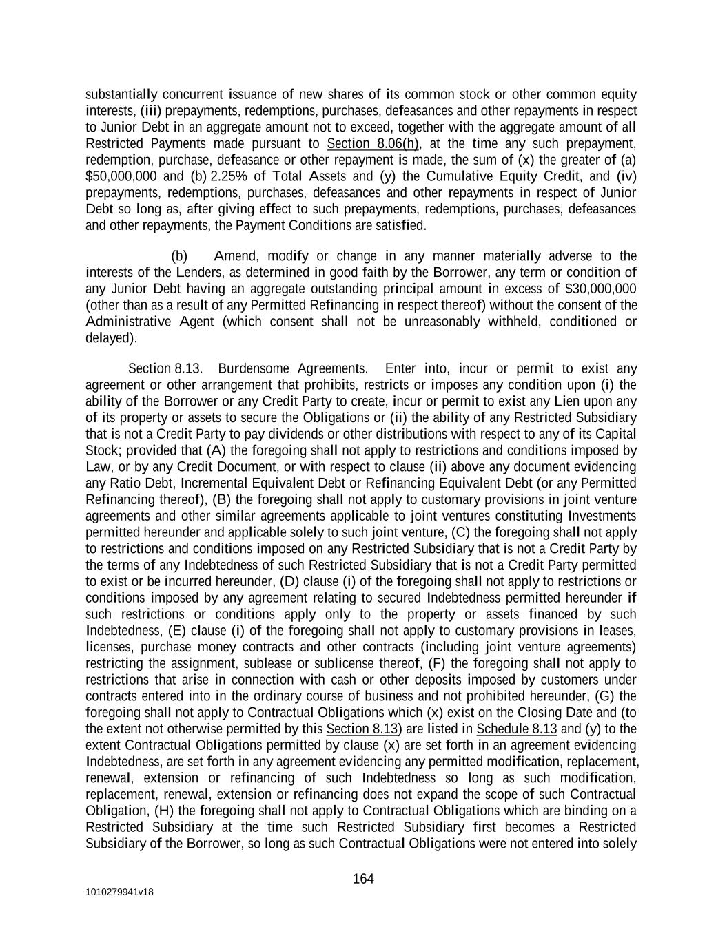 substantially concurrent issuance of new shares of its common stock or other common equity interests, (iii) prepayments, redemptions, purchases, defeasances and other repayments in respect to Junior Debt in an aggregate amount not to exceed, together with the aggregate amount of all Restricted Payments made pursuant to Section 8.06(h), at the time any such prepayment, redemption, purchase, defeasance or other repayment is made, the sum of (x) the greater of (a) $50,000,000 and (b) 2.25% of Total Assets and (y) the Cumulative Equity Credit, and (iv) prepayments, redemptions, purchases, defeasances and other repayments in respect of Junior Debt so long as, after giving effect to such prepayments, redemptions, purchases, defeasances and other repayments, the Payment Conditions are satisfied. (b) Amend, modify or change in any manner materially adverse to the interests of the Lenders, as determined in good faith by the Borrower, any term or condition of any Junior Debt having an aggregate outstanding principal amount in excess of $30,000,000 (other than as a result of any Permitted Refinancing in respect thereof) without the consent of the Administrative Agent (which consent shall not be unreasonably withheld, conditioned or delayed). Section 8.13. Burdensome Agreements. Enter into, incur or permit to exist any agreement or other arrangement that prohibits, restricts or imposes any condition upon (i) the ability of the Borrower or any Credit Party to create, incur or permit to exist any Lien upon any of its property or assets to secure the Obligations or (ii) the ability of any Restricted Subsidiary that is not a Credit Party to pay dividends or other distributions with respect to any of its Capital Stock; provided that (A) the foregoing shall not apply to restrictions and conditions imposed by Law, or by any Credit Document, or with respect to clause (ii) above any document evidencing any Ratio Debt, Incremental Equivalent Debt or Refinancing Equivalent Debt (or any Permitted Refinancing thereof), (B) the foregoing shall not apply to customary provisions in joint venture agreements and other similar agreements applicable to joint ventures constituting Investments permitted hereunder and applicable solely to such joint venture, (C) the foregoing shall not apply to restrictions and conditions imposed on any Restricted Subsidiary that is not a Credit Party by the terms of any Indebtedness of such Restricted Subsidiary that is not a Credit Party permitted to exist or be incurred hereunder, (D) clause (i) of the foregoing shall not apply to restrictions or conditions imposed by any agreement relating to secured Indebtedness permitted hereunder if such restrictions or conditions apply only to the property or assets financed by such Indebtedness, (E) clause (i) of the foregoing shall not apply to customary provisions in leases, licenses, purchase money contracts and other contracts (including joint venture agreements) restricting the assignment, sublease or sublicense thereof, (F) the foregoing shall not apply to restrictions that arise in connection with cash or other deposits imposed by customers under contracts entered into in the ordinary course of business and not prohibited hereunder, (G) the foregoing shall not apply to Contractual Obligations which (x) exist on the Closing Date and (to the extent not otherwise permitted by this Section 8.13) are listed in Schedule 8.13 and (y) to the extent Contractual Obligations permitted by clause (x) are set forth in an agreement evidencing Indebtedness, are set forth in any agreement evidencing any permitted modification, replacement, renewal, extension or refinancing of such Indebtedness so long as such modification, replacement, renewal, extension or refinancing does not expand the scope of such Contractual Obligation, (H) the foregoing shall not apply to Contractual Obligations which are binding on a Restricted Subsidiary at the time such Restricted Subsidiary first becomes a Restricted Subsidiary of the Borrower, so long as such Contractual Obligations were not entered into solely 164 1010279941v18