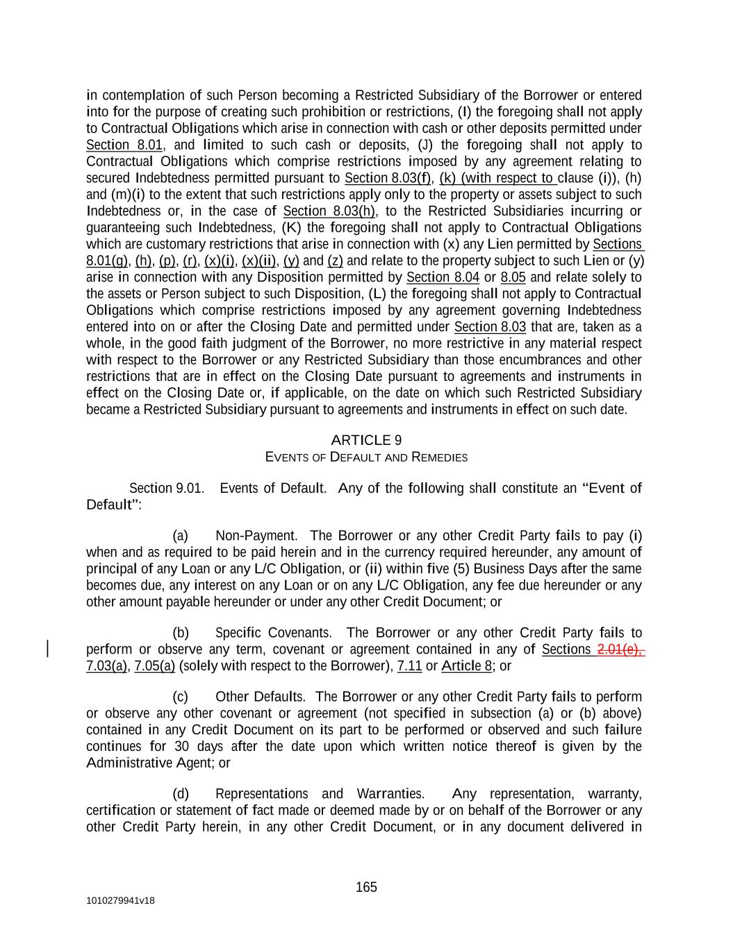 in contemplation of such Person becoming a Restricted Subsidiary of the Borrower or entered into for the purpose of creating such prohibition or restrictions, (I) the foregoing shall not apply to Contractual Obligations which arise in connection with cash or other deposits permitted under Section 8.01, and limited to such cash or deposits, (J) the foregoing shall not apply to Contractual Obligations which comprise restrictions imposed by any agreement relating to secured Indebtedness permitted pursuant to Section 8.03(f), (k) (with respect to clause (i)), (h) and (m)(i) to the extent that such restrictions apply only to the property or assets subject to such Indebtedness or, in the case of Section 8.03(h), to the Restricted Subsidiaries incurring or guaranteeing such Indebtedness, (K) the foregoing shall not apply to Contractual Obligations which are customary restrictions that arise in connection with (x) any Lien permitted by Sections 8.01(g), (h), (p), (r), (x)(i), (x)(ii), (y) and (z) and relate to the property subject to such Lien or (y) arise in connection with any Disposition permitted by Section 8.04 or 8.05 and relate solely to the assets or Person subject to such Disposition, (L) the foregoing shall not apply to Contractual Obligations which comprise restrictions imposed by any agreement governing Indebtedness entered into on or after the Closing Date and permitted under Section 8.03 that are, taken as a whole, in the good faith judgment of the Borrower, no more restrictive in any material respect with respect to the Borrower or any Restricted Subsidiary than those encumbrances and other restrictions that are in effect on the Closing Date pursuant to agreements and instruments in effect on the Closing Date or, if applicable, on the date on which such Restricted Subsidiary became a Restricted Subsidiary pursuant to agreements and instruments in effect on such date. ARTICLE 9 EVENTS OF DEFAULT AND REMEDIES Section 9.01. Events of Default. Any of the following shall constitute an “Event of Default”: (a) Non-Payment. The Borrower or any other Credit Party fails to pay (i) when and as required to be paid herein and in the currency required hereunder, any amount of principal of any Loan or any L/C Obligation, or (ii) within five (5) Business Days after the same becomes due, any interest on any Loan or on any L/C Obligation, any fee due hereunder or any other amount payable hereunder or under any other Credit Document; or (b) Specific Covenants. The Borrower or any other Credit Party fails to perform or observe any term, covenant or agreement contained in any of Sections 2.01(e), 7.03(a), 7.05(a) (solely with respect to the Borrower), 7.11 or Article 8; or (c) Other Defaults. The Borrower or any other Credit Party fails to perform or observe any other covenant or agreement (not specified in subsection (a) or (b) above) contained in any Credit Document on its part to be performed or observed and such failure continues for 30 days after the date upon which written notice thereof is given by the Administrative Agent; or (d) Representations and Warranties. Any representation, warranty, certification or statement of fact made or deemed made by or on behalf of the Borrower or any other Credit Party herein, in any other Credit Document, or in any document delivered in 165 1010279941v18