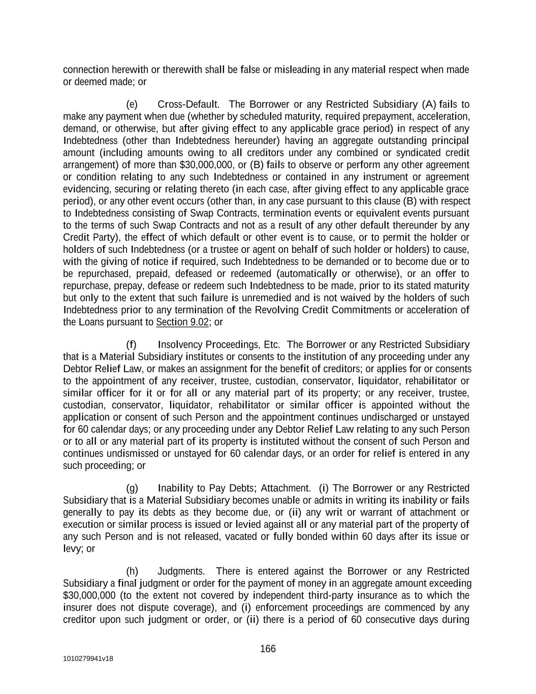 connection herewith or therewith shall be false or misleading in any material respect when made or deemed made; or (e) Cross-Default. The Borrower or any Restricted Subsidiary (A) fails to make any payment when due (whether by scheduled maturity, required prepayment, acceleration, demand, or otherwise, but after giving effect to any applicable grace period) in respect of any Indebtedness (other than Indebtedness hereunder) having an aggregate outstanding principal amount (including amounts owing to all creditors under any combined or syndicated credit arrangement) of more than $30,000,000, or (B) fails to observe or perform any other agreement or condition relating to any such Indebtedness or contained in any instrument or agreement evidencing, securing or relating thereto (in each case, after giving effect to any applicable grace period), or any other event occurs (other than, in any case pursuant to this clause (B) with respect to Indebtedness consisting of Swap Contracts, termination events or equivalent events pursuant to the terms of such Swap Contracts and not as a result of any other default thereunder by any Credit Party), the effect of which default or other event is to cause, or to permit the holder or holders of such Indebtedness (or a trustee or agent on behalf of such holder or holders) to cause, with the giving of notice if required, such Indebtedness to be demanded or to become due or to be repurchased, prepaid, defeased or redeemed (automatically or otherwise), or an offer to repurchase, prepay, defease or redeem such Indebtedness to be made, prior to its stated maturity but only to the extent that such failure is unremedied and is not waived by the holders of such Indebtedness prior to any termination of the Revolving Credit Commitments or acceleration of the Loans pursuant to Section 9.02; or (f) Insolvency Proceedings, Etc. The Borrower or any Restricted Subsidiary that is a Material Subsidiary institutes or consents to the institution of any proceeding under any Debtor Relief Law, or makes an assignment for the benefit of creditors; or applies for or consents to the appointment of any receiver, trustee, custodian, conservator, liquidator, rehabilitator or similar officer for it or for all or any material part of its property; or any receiver, trustee, custodian, conservator, liquidator, rehabilitator or similar officer is appointed without the application or consent of such Person and the appointment continues undischarged or unstayed for 60 calendar days; or any proceeding under any Debtor Relief Law relating to any such Person or to all or any material part of its property is instituted without the consent of such Person and continues undismissed or unstayed for 60 calendar days, or an order for relief is entered in any such proceeding; or (g) Inability to Pay Debts; Attachment. (i) The Borrower or any Restricted Subsidiary that is a Material Subsidiary becomes unable or admits in writing its inability or fails generally to pay its debts as they become due, or (ii) any writ or warrant of attachment or execution or similar process is issued or levied against all or any material part of the property of any such Person and is not released, vacated or fully bonded within 60 days after its issue or levy; or (h) Judgments. There is entered against the Borrower or any Restricted Subsidiary a final judgment or order for the payment of money in an aggregate amount exceeding $30,000,000 (to the extent not covered by independent third-party insurance as to which the insurer does not dispute coverage), and (i) enforcement proceedings are commenced by any creditor upon such judgment or order, or (ii) there is a period of 60 consecutive days during 166 1010279941v18