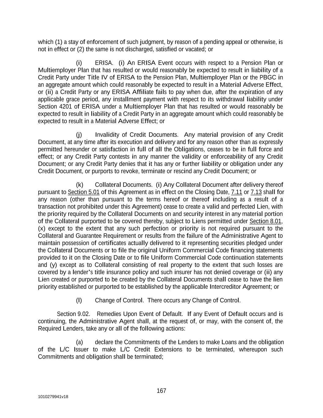 which (1) a stay of enforcement of such judgment, by reason of a pending appeal or otherwise, is not in effect or (2) the same is not discharged, satisfied or vacated; or (i) ERISA. (i) An ERISA Event occurs with respect to a Pension Plan or Multiemployer Plan that has resulted or would reasonably be expected to result in liability of a Credit Party under Title IV of ERISA to the Pension Plan, Multiemployer Plan or the PBGC in an aggregate amount which could reasonably be expected to result in a Material Adverse Effect, or (ii) a Credit Party or any ERISA Affiliate fails to pay when due, after the expiration of any applicable grace period, any installment payment with respect to its withdrawal liability under Section 4201 of ERISA under a Multiemployer Plan that has resulted or would reasonably be expected to result in liability of a Credit Party in an aggregate amount which could reasonably be expected to result in a Material Adverse Effect; or (j) Invalidity of Credit Documents. Any material provision of any Credit Document, at any time after its execution and delivery and for any reason other than as expressly permitted hereunder or satisfaction in full of all the Obligations, ceases to be in full force and effect; or any Credit Party contests in any manner the validity or enforceability of any Credit Document; or any Credit Party denies that it has any or further liability or obligation under any Credit Document, or purports to revoke, terminate or rescind any Credit Document; or (k) Collateral Documents. (i) Any Collateral Document after delivery thereof pursuant to Section 5.01 of this Agreement as in effect on the Closing Date, 7.11 or 7.13 shall for any reason (other than pursuant to the terms hereof or thereof including as a result of a transaction not prohibited under this Agreement) cease to create a valid and perfected Lien, with the priority required by the Collateral Documents on and security interest in any material portion of the Collateral purported to be covered thereby, subject to Liens permitted under Section 8.01, (x) except to the extent that any such perfection or priority is not required pursuant to the Collateral and Guarantee Requirement or results from the failure of the Administrative Agent to maintain possession of certificates actually delivered to it representing securities pledged under the Collateral Documents or to file the original Uniform Commercial Code financing statements provided to it on the Closing Date or to file Uniform Commercial Code continuation statements and (y) except as to Collateral consisting of real property to the extent that such losses are covered by a lender’s title insurance policy and such insurer has not denied coverage or (ii) any Lien created or purported to be created by the Collateral Documents shall cease to have the lien priority established or purported to be established by the applicable Intercreditor Agreement; or (l) Change of Control. There occurs any Change of Control. Section 9.02. Remedies Upon Event of Default. If any Event of Default occurs and is continuing, the Administrative Agent shall, at the request of, or may, with the consent of, the Required Lenders, take any or all of the following actions: (a) declare the Commitments of the Lenders to make Loans and the obligation of the L/C Issuer to make L/C Credit Extensions to be terminated, whereupon such Commitments and obligation shall be terminated; 167 1010279941v18