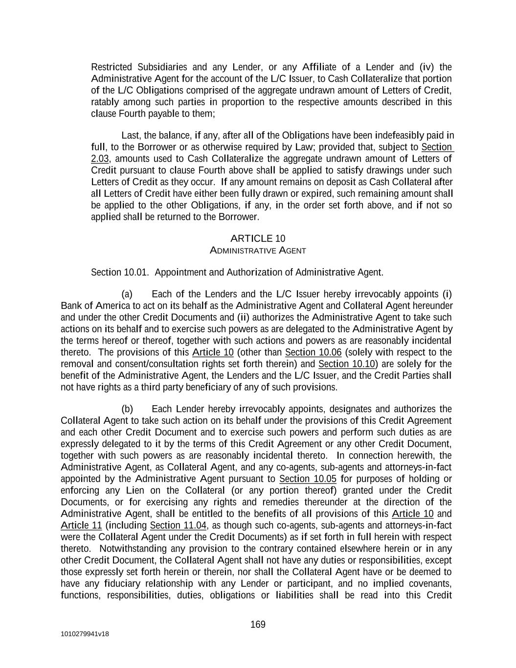 Restricted Subsidiaries and any Lender, or any Affiliate of a Lender and (iv) the Administrative Agent for the account of the L/C Issuer, to Cash Collateralize that portion of the L/C Obligations comprised of the aggregate undrawn amount of Letters of Credit, ratably among such parties in proportion to the respective amounts described in this clause Fourth payable to them; Last, the balance, if any, after all of the Obligations have been indefeasibly paid in full, to the Borrower or as otherwise required by Law; provided that, subject to Section 2.03, amounts used to Cash Collateralize the aggregate undrawn amount of Letters of Credit pursuant to clause Fourth above shall be applied to satisfy drawings under such Letters of Credit as they occur. If any amount remains on deposit as Cash Collateral after all Letters of Credit have either been fully drawn or expired, such remaining amount shall be applied to the other Obligations, if any, in the order set forth above, and if not so applied shall be returned to the Borrower. ARTICLE 10 ADMINISTRATIVE AGENT Section 10.01. Appointment and Authorization of Administrative Agent. (a) Each of the Lenders and the L/C Issuer hereby irrevocably appoints (i) Bank of America to act on its behalf as the Administrative Agent and Collateral Agent hereunder and under the other Credit Documents and (ii) authorizes the Administrative Agent to take such actions on its behalf and to exercise such powers as are delegated to the Administrative Agent by the terms hereof or thereof, together with such actions and powers as are reasonably incidental thereto. The provisions of this Article 10 (other than Section 10.06 (solely with respect to the removal and consent/consultation rights set forth therein) and Section 10.10) are solely for the benefit of the Administrative Agent, the Lenders and the L/C Issuer, and the Credit Parties shall not have rights as a third party beneficiary of any of such provisions. (b) Each Lender hereby irrevocably appoints, designates and authorizes the Collateral Agent to take such action on its behalf under the provisions of this Credit Agreement and each other Credit Document and to exercise such powers and perform such duties as are expressly delegated to it by the terms of this Credit Agreement or any other Credit Document, together with such powers as are reasonably incidental thereto. In connection herewith, the Administrative Agent, as Collateral Agent, and any co-agents, sub-agents and attorneys-in-fact appointed by the Administrative Agent pursuant to Section 10.05 for purposes of holding or enforcing any Lien on the Collateral (or any portion thereof) granted under the Credit Documents, or for exercising any rights and remedies thereunder at the direction of the Administrative Agent, shall be entitled to the benefits of all provisions of this Article 10 and Article 11 (including Section 11.04, as though such co-agents, sub-agents and attorneys-in-fact were the Collateral Agent under the Credit Documents) as if set forth in full herein with respect thereto. Notwithstanding any provision to the contrary contained elsewhere herein or in any other Credit Document, the Collateral Agent shall not have any duties or responsibilities, except those expressly set forth herein or therein, nor shall the Collateral Agent have or be deemed to have any fiduciary relationship with any Lender or participant, and no implied covenants, functions, responsibilities, duties, obligations or liabilities shall be read into this Credit 169 1010279941v18