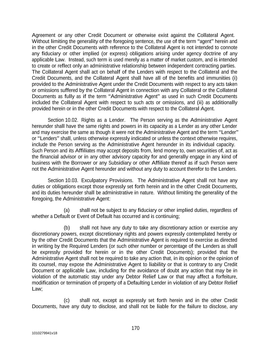Agreement or any other Credit Document or otherwise exist against the Collateral Agent. Without limiting the generality of the foregoing sentence, the use of the term “agent” herein and in the other Credit Documents with reference to the Collateral Agent is not intended to connote any fiduciary or other implied (or express) obligations arising under agency doctrine of any applicable Law. Instead, such term is used merely as a matter of market custom, and is intended to create or reflect only an administrative relationship between independent contracting parties. The Collateral Agent shall act on behalf of the Lenders with respect to the Collateral and the Credit Documents, and the Collateral Agent shall have all of the benefits and immunities (i) provided to the Administrative Agent under the Credit Documents with respect to any acts taken or omissions suffered by the Collateral Agent in connection with any Collateral or the Collateral Documents as fully as if the term “Administrative Agent” as used in such Credit Documents included the Collateral Agent with respect to such acts or omissions, and (ii) as additionally provided herein or in the other Credit Documents with respect to the Collateral Agent. Section 10.02. Rights as a Lender. The Person serving as the Administrative Agent hereunder shall have the same rights and powers in its capacity as a Lender as any other Lender and may exercise the same as though it were not the Administrative Agent and the term “Lender” or “Lenders” shall, unless otherwise expressly indicated or unless the context otherwise requires, include the Person serving as the Administrative Agent hereunder in its individual capacity. Such Person and its Affiliates may accept deposits from, lend money to, own securities of, act as the financial advisor or in any other advisory capacity for and generally engage in any kind of business with the Borrower or any Subsidiary or other Affiliate thereof as if such Person were not the Administrative Agent hereunder and without any duty to account therefor to the Lenders. Section 10.03. Exculpatory Provisions. The Administrative Agent shall not have any duties or obligations except those expressly set forth herein and in the other Credit Documents, and its duties hereunder shall be administrative in nature. Without limiting the generality of the foregoing, the Administrative Agent: (a) shall not be subject to any fiduciary or other implied duties, regardless of whether a Default or Event of Default has occurred and is continuing; (b) shall not have any duty to take any discretionary action or exercise any discretionary powers, except discretionary rights and powers expressly contemplated hereby or by the other Credit Documents that the Administrative Agent is required to exercise as directed in writing by the Required Lenders (or such other number or percentage of the Lenders as shall be expressly provided for herein or in the other Credit Documents); provided that the Administrative Agent shall not be required to take any action that, in its opinion or the opinion of its counsel, may expose the Administrative Agent to liability or that is contrary to any Credit Document or applicable Law, including for the avoidance of doubt any action that may be in violation of the automatic stay under any Debtor Relief Law or that may affect a forfeiture, modification or termination of property of a Defaulting Lender in violation of any Debtor Relief Law; (c) shall not, except as expressly set forth herein and in the other Credit Documents, have any duty to disclose, and shall not be liable for the failure to disclose, any 170 1010279941v18