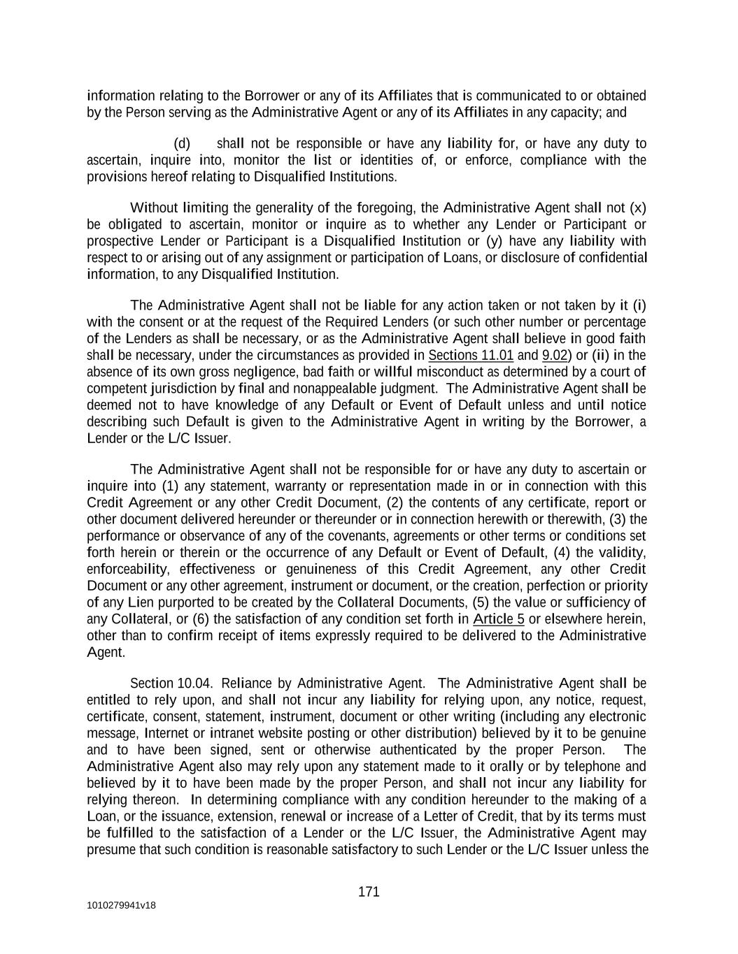 information relating to the Borrower or any of its Affiliates that is communicated to or obtained by the Person serving as the Administrative Agent or any of its Affiliates in any capacity; and (d) shall not be responsible or have any liability for, or have any duty to ascertain, inquire into, monitor the list or identities of, or enforce, compliance with the provisions hereof relating to Disqualified Institutions. Without limiting the generality of the foregoing, the Administrative Agent shall not (x) be obligated to ascertain, monitor or inquire as to whether any Lender or Participant or prospective Lender or Participant is a Disqualified Institution or (y) have any liability with respect to or arising out of any assignment or participation of Loans, or disclosure of confidential information, to any Disqualified Institution. The Administrative Agent shall not be liable for any action taken or not taken by it (i) with the consent or at the request of the Required Lenders (or such other number or percentage of the Lenders as shall be necessary, or as the Administrative Agent shall believe in good faith shall be necessary, under the circumstances as provided in Sections 11.01 and 9.02) or (ii) in the absence of its own gross negligence, bad faith or willful misconduct as determined by a court of competent jurisdiction by final and nonappealable judgment. The Administrative Agent shall be deemed not to have knowledge of any Default or Event of Default unless and until notice describing such Default is given to the Administrative Agent in writing by the Borrower, a Lender or the L/C Issuer. The Administrative Agent shall not be responsible for or have any duty to ascertain or inquire into (1) any statement, warranty or representation made in or in connection with this Credit Agreement or any other Credit Document, (2) the contents of any certificate, report or other document delivered hereunder or thereunder or in connection herewith or therewith, (3) the performance or observance of any of the covenants, agreements or other terms or conditions set forth herein or therein or the occurrence of any Default or Event of Default, (4) the validity, enforceability, effectiveness or genuineness of this Credit Agreement, any other Credit Document or any other agreement, instrument or document, or the creation, perfection or priority of any Lien purported to be created by the Collateral Documents, (5) the value or sufficiency of any Collateral, or (6) the satisfaction of any condition set forth in Article 5 or elsewhere herein, other than to confirm receipt of items expressly required to be delivered to the Administrative Agent. Section 10.04. Reliance by Administrative Agent. The Administrative Agent shall be entitled to rely upon, and shall not incur any liability for relying upon, any notice, request, certificate, consent, statement, instrument, document or other writing (including any electronic message, Internet or intranet website posting or other distribution) believed by it to be genuine and to have been signed, sent or otherwise authenticated by the proper Person. The Administrative Agent also may rely upon any statement made to it orally or by telephone and believed by it to have been made by the proper Person, and shall not incur any liability for relying thereon. In determining compliance with any condition hereunder to the making of a Loan, or the issuance, extension, renewal or increase of a Letter of Credit, that by its terms must be fulfilled to the satisfaction of a Lender or the L/C Issuer, the Administrative Agent may presume that such condition is reasonable satisfactory to such Lender or the L/C Issuer unless the 171 1010279941v18