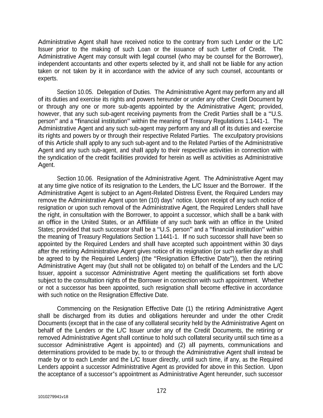 Administrative Agent shall have received notice to the contrary from such Lender or the L/C Issuer prior to the making of such Loan or the issuance of such Letter of Credit. The Administrative Agent may consult with legal counsel (who may be counsel for the Borrower), independent accountants and other experts selected by it, and shall not be liable for any action taken or not taken by it in accordance with the advice of any such counsel, accountants or experts. Section 10.05. Delegation of Duties. The Administrative Agent may perform any and all of its duties and exercise its rights and powers hereunder or under any other Credit Document by or through any one or more sub-agents appointed by the Administrative Agent; provided, however, that any such sub-agent receiving payments from the Credit Parties shall be a “U.S. person” and a “financial institution” within the meaning of Treasury Regulations 1.1441-1. The Administrative Agent and any such sub-agent may perform any and all of its duties and exercise its rights and powers by or through their respective Related Parties. The exculpatory provisions of this Article shall apply to any such sub-agent and to the Related Parties of the Administrative Agent and any such sub-agent, and shall apply to their respective activities in connection with the syndication of the credit facilities provided for herein as well as activities as Administrative Agent. Section 10.06. Resignation of the Administrative Agent. The Administrative Agent may at any time give notice of its resignation to the Lenders, the L/C Issuer and the Borrower. If the Administrative Agent is subject to an Agent-Related Distress Event, the Required Lenders may remove the Administrative Agent upon ten (10) days’ notice. Upon receipt of any such notice of resignation or upon such removal of the Administrative Agent, the Required Lenders shall have the right, in consultation with the Borrower, to appoint a successor, which shall be a bank with an office in the United States, or an Affiliate of any such bank with an office in the United States; provided that such successor shall be a “U.S. person” and a “financial institution” within the meaning of Treasury Regulations Section 1.1441-1. If no such successor shall have been so appointed by the Required Lenders and shall have accepted such appointment within 30 days after the retiring Administrative Agent gives notice of its resignation (or such earlier day as shall be agreed to by the Required Lenders) (the “Resignation Effective Date”)), then the retiring Administrative Agent may (but shall not be obligated to) on behalf of the Lenders and the L/C Issuer, appoint a successor Administrative Agent meeting the qualifications set forth above subject to the consultation rights of the Borrower in connection with such appointment. Whether or not a successor has been appointed, such resignation shall become effective in accordance with such notice on the Resignation Effective Date. Commencing on the Resignation Effective Date (1) the retiring Administrative Agent shall be discharged from its duties and obligations hereunder and under the other Credit Documents (except that in the case of any collateral security held by the Administrative Agent on behalf of the Lenders or the L/C Issuer under any of the Credit Documents, the retiring or removed Administrative Agent shall continue to hold such collateral security until such time as a successor Administrative Agent is appointed) and (2) all payments, communications and determinations provided to be made by, to or through the Administrative Agent shall instead be made by or to each Lender and the L/C Issuer directly, until such time, if any, as the Required Lenders appoint a successor Administrative Agent as provided for above in this Section. Upon the acceptance of a successor’s appointment as Administrative Agent hereunder, such successor 172 1010279941v18