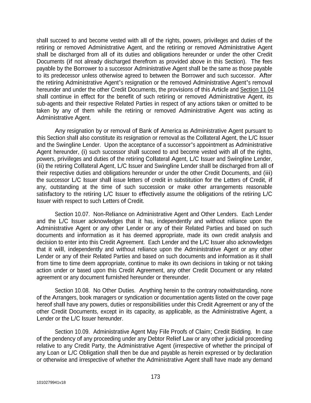 shall succeed to and become vested with all of the rights, powers, privileges and duties of the retiring or removed Administrative Agent, and the retiring or removed Administrative Agent shall be discharged from all of its duties and obligations hereunder or under the other Credit Documents (if not already discharged therefrom as provided above in this Section). The fees payable by the Borrower to a successor Administrative Agent shall be the same as those payable to its predecessor unless otherwise agreed to between the Borrower and such successor. After the retiring Administrative Agent’s resignation or the removed Administrative Agent’s removal hereunder and under the other Credit Documents, the provisions of this Article and Section 11.04 shall continue in effect for the benefit of such retiring or removed Administrative Agent, its sub-agents and their respective Related Parties in respect of any actions taken or omitted to be taken by any of them while the retiring or removed Administrative Agent was acting as Administrative Agent. Any resignation by or removal of Bank of America as Administrative Agent pursuant to this Section shall also constitute its resignation or removal as the Collateral Agent, the L/C Issuer and the Swingline Lender. Upon the acceptance of a successor’s appointment as Administrative Agent hereunder, (i) such successor shall succeed to and become vested with all of the rights, powers, privileges and duties of the retiring Collateral Agent, L/C Issuer and Swingline Lender, (ii) the retiring Collateral Agent, L/C Issuer and Swingline Lender shall be discharged from all of their respective duties and obligations hereunder or under the other Credit Documents, and (iii) the successor L/C Issuer shall issue letters of credit in substitution for the Letters of Credit, if any, outstanding at the time of such succession or make other arrangements reasonable satisfactory to the retiring L/C Issuer to effectively assume the obligations of the retiring L/C Issuer with respect to such Letters of Credit. Section 10.07. Non-Reliance on Administrative Agent and Other Lenders. Each Lender and the L/C Issuer acknowledges that it has, independently and without reliance upon the Administrative Agent or any other Lender or any of their Related Parties and based on such documents and information as it has deemed appropriate, made its own credit analysis and decision to enter into this Credit Agreement. Each Lender and the L/C Issuer also acknowledges that it will, independently and without reliance upon the Administrative Agent or any other Lender or any of their Related Parties and based on such documents and information as it shall from time to time deem appropriate, continue to make its own decisions in taking or not taking action under or based upon this Credit Agreement, any other Credit Document or any related agreement or any document furnished hereunder or thereunder. Section 10.08. No Other Duties. Anything herein to the contrary notwithstanding, none of the Arrangers, book managers or syndication or documentation agents listed on the cover page hereof shall have any powers, duties or responsibilities under this Credit Agreement or any of the other Credit Documents, except in its capacity, as applicable, as the Administrative Agent, a Lender or the L/C Issuer hereunder. Section 10.09. Administrative Agent May File Proofs of Claim; Credit Bidding. In case of the pendency of any proceeding under any Debtor Relief Law or any other judicial proceeding relative to any Credit Party, the Administrative Agent (irrespective of whether the principal of any Loan or L/C Obligation shall then be due and payable as herein expressed or by declaration or otherwise and irrespective of whether the Administrative Agent shall have made any demand 173 1010279941v18