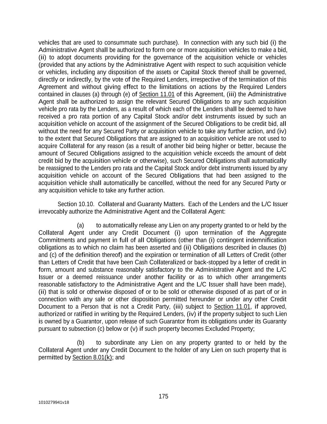 vehicles that are used to consummate such purchase). In connection with any such bid (i) the Administrative Agent shall be authorized to form one or more acquisition vehicles to make a bid, (ii) to adopt documents providing for the governance of the acquisition vehicle or vehicles (provided that any actions by the Administrative Agent with respect to such acquisition vehicle or vehicles, including any disposition of the assets or Capital Stock thereof shall be governed, directly or indirectly, by the vote of the Required Lenders, irrespective of the termination of this Agreement and without giving effect to the limitations on actions by the Required Lenders contained in clauses (a) through (e) of Section 11.01 of this Agreement, (iii) the Administrative Agent shall be authorized to assign the relevant Secured Obligations to any such acquisition vehicle pro rata by the Lenders, as a result of which each of the Lenders shall be deemed to have received a pro rata portion of any Capital Stock and/or debt instruments issued by such an acquisition vehicle on account of the assignment of the Secured Obligations to be credit bid, all without the need for any Secured Party or acquisition vehicle to take any further action, and (iv) to the extent that Secured Obligations that are assigned to an acquisition vehicle are not used to acquire Collateral for any reason (as a result of another bid being higher or better, because the amount of Secured Obligations assigned to the acquisition vehicle exceeds the amount of debt credit bid by the acquisition vehicle or otherwise), such Secured Obligations shall automatically be reassigned to the Lenders pro rata and the Capital Stock and/or debt instruments issued by any acquisition vehicle on account of the Secured Obligations that had been assigned to the acquisition vehicle shall automatically be cancelled, without the need for any Secured Party or any acquisition vehicle to take any further action. Section 10.10. Collateral and Guaranty Matters. Each of the Lenders and the L/C Issuer irrevocably authorize the Administrative Agent and the Collateral Agent: (a) to automatically release any Lien on any property granted to or held by the Collateral Agent under any Credit Document (i) upon termination of the Aggregate Commitments and payment in full of all Obligations (other than (i) contingent indemnification obligations as to which no claim has been asserted and (ii) Obligations described in clauses (b) and (c) of the definition thereof) and the expiration or termination of all Letters of Credit (other than Letters of Credit that have been Cash Collateralized or back-stopped by a letter of credit in form, amount and substance reasonably satisfactory to the Administrative Agent and the L/C Issuer or a deemed reissuance under another facility or as to which other arrangements reasonable satisfactory to the Administrative Agent and the L/C Issuer shall have been made), (ii) that is sold or otherwise disposed of or to be sold or otherwise disposed of as part of or in connection with any sale or other disposition permitted hereunder or under any other Credit Document to a Person that is not a Credit Party, (iii) subject to Section 11.01, if approved, authorized or ratified in writing by the Required Lenders, (iv) if the property subject to such Lien is owned by a Guarantor, upon release of such Guarantor from its obligations under its Guaranty pursuant to subsection (c) below or (v) if such property becomes Excluded Property; (b) to subordinate any Lien on any property granted to or held by the Collateral Agent under any Credit Document to the holder of any Lien on such property that is permitted by Section 8.01(k); and 175 1010279941v18