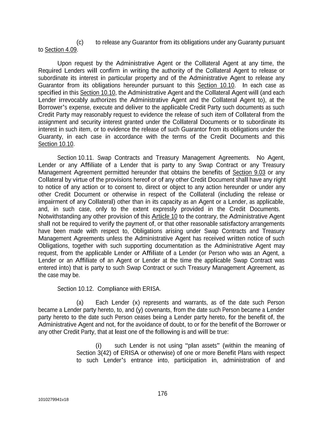 (c) to release any Guarantor from its obligations under any Guaranty pursuant to Section 4.09. Upon request by the Administrative Agent or the Collateral Agent at any time, the Required Lenders will confirm in writing the authority of the Collateral Agent to release or subordinate its interest in particular property and of the Administrative Agent to release any Guarantor from its obligations hereunder pursuant to this Section 10.10. In each case as specified in this Section 10.10, the Administrative Agent and the Collateral Agent will (and each Lender irrevocably authorizes the Administrative Agent and the Collateral Agent to), at the Borrower’s expense, execute and deliver to the applicable Credit Party such documents as such Credit Party may reasonably request to evidence the release of such item of Collateral from the assignment and security interest granted under the Collateral Documents or to subordinate its interest in such item, or to evidence the release of such Guarantor from its obligations under the Guaranty, in each case in accordance with the terms of the Credit Documents and this Section 10.10. Section 10.11. Swap Contracts and Treasury Management Agreements. No Agent, Lender or any Affiliate of a Lender that is party to any Swap Contract or any Treasury Management Agreement permitted hereunder that obtains the benefits of Section 9.03 or any Collateral by virtue of the provisions hereof or of any other Credit Document shall have any right to notice of any action or to consent to, direct or object to any action hereunder or under any other Credit Document or otherwise in respect of the Collateral (including the release or impairment of any Collateral) other than in its capacity as an Agent or a Lender, as applicable, and, in such case, only to the extent expressly provided in the Credit Documents. Notwithstanding any other provision of this Article 10 to the contrary, the Administrative Agent shall not be required to verify the payment of, or that other reasonable satisfactory arrangements have been made with respect to, Obligations arising under Swap Contracts and Treasury Management Agreements unless the Administrative Agent has received written notice of such Obligations, together with such supporting documentation as the Administrative Agent may request, from the applicable Lender or Affiliate of a Lender (or Person who was an Agent, a Lender or an Affiliate of an Agent or Lender at the time the applicable Swap Contract was entered into) that is party to such Swap Contract or such Treasury Management Agreement, as the case may be. Section 10.12. Compliance with ERISA. (a) Each Lender (x) represents and warrants, as of the date such Person became a Lender party hereto, to, and (y) covenants, from the date such Person became a Lender party hereto to the date such Person ceases being a Lender party hereto, for the benefit of, the Administrative Agent and not, for the avoidance of doubt, to or for the benefit of the Borrower or any other Credit Party, that at least one of the following is and will be true: (i) such Lender is not using “plan assets” (within the meaning of Section 3(42) of ERISA or otherwise) of one or more Benefit Plans with respect to such Lender’s entrance into, participation in, administration of and 176 1010279941v18