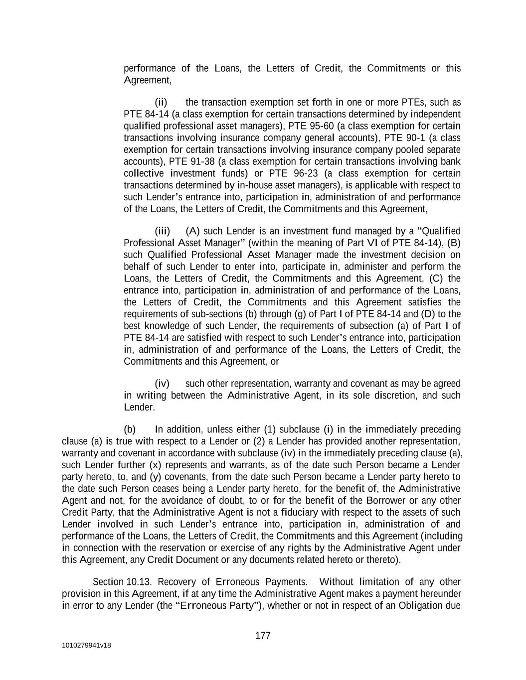 performance of the Loans, the Letters of Credit, the Commitments or this Agreement, (ii) the transaction exemption set forth in one or more PTEs, such as PTE 84-14 (a class exemption for certain transactions determined by independent qualified professional asset managers), PTE 95-60 (a class exemption for certain transactions involving insurance company general accounts), PTE 90-1 (a class exemption for certain transactions involving insurance company pooled separate accounts), PTE 91-38 (a class exemption for certain transactions involving bank collective investment funds) or PTE 96-23 (a class exemption for certain transactions determined by in-house asset managers), is applicable with respect to such Lender’s entrance into, participation in, administration of and performance of the Loans, the Letters of Credit, the Commitments and this Agreement, (iii) (A) such Lender is an investment fund managed by a “Qualified Professional Asset Manager” (within the meaning of Part VI of PTE 84-14), (B) such Qualified Professional Asset Manager made the investment decision on behalf of such Lender to enter into, participate in, administer and perform the Loans, the Letters of Credit, the Commitments and this Agreement, (C) the entrance into, participation in, administration of and performance of the Loans, the Letters of Credit, the Commitments and this Agreement satisfies the requirements of sub-sections (b) through (g) of Part I of PTE 84-14 and (D) to the best knowledge of such Lender, the requirements of subsection (a) of Part I of PTE 84-14 are satisfied with respect to such Lender’s entrance into, participation in, administration of and performance of the Loans, the Letters of Credit, the Commitments and this Agreement, or (iv) such other representation, warranty and covenant as may be agreed in writing between the Administrative Agent, in its sole discretion, and such Lender. (b) In addition, unless either (1) subclause (i) in the immediately preceding clause (a) is true with respect to a Lender or (2) a Lender has provided another representation, warranty and covenant in accordance with subclause (iv) in the immediately preceding clause (a), such Lender further (x) represents and warrants, as of the date such Person became a Lender party hereto, to, and (y) covenants, from the date such Person became a Lender party hereto to the date such Person ceases being a Lender party hereto, for the benefit of, the Administrative Agent and not, for the avoidance of doubt, to or for the benefit of the Borrower or any other Credit Party, that the Administrative Agent is not a fiduciary with respect to the assets of such Lender involved in such Lender’s entrance into, participation in, administration of and performance of the Loans, the Letters of Credit, the Commitments and this Agreement (including in connection with the reservation or exercise of any rights by the Administrative Agent under this Agreement, any Credit Document or any documents related hereto or thereto). Section 10.13. Recovery of Erroneous Payments. Without limitation of any other provision in this Agreement, if at any time the Administrative Agent makes a payment hereunder in error to any Lender (the “Erroneous Party”), whether or not in respect of an Obligation due 177 1010279941v18