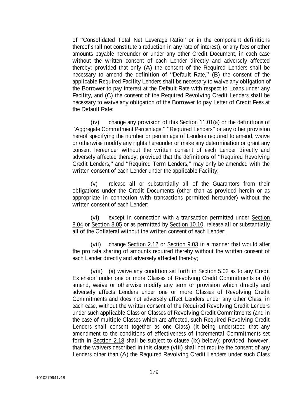 of “Consolidated Total Net Leverage Ratio” or in the component definitions thereof shall not constitute a reduction in any rate of interest), or any fees or other amounts payable hereunder or under any other Credit Document, in each case without the written consent of each Lender directly and adversely affected thereby; provided that only (A) the consent of the Required Lenders shall be necessary to amend the definition of “Default Rate,” (B) the consent of the applicable Required Facility Lenders shall be necessary to waive any obligation of the Borrower to pay interest at the Default Rate with respect to Loans under any Facility, and (C) the consent of the Required Revolving Credit Lenders shall be necessary to waive any obligation of the Borrower to pay Letter of Credit Fees at the Default Rate; (iv) change any provision of this Section 11.01(a) or the definitions of “Aggregate Commitment Percentage,” “Required Lenders” or any other provision hereof specifying the number or percentage of Lenders required to amend, waive or otherwise modify any rights hereunder or make any determination or grant any consent hereunder without the written consent of each Lender directly and adversely affected thereby; provided that the definitions of “Required Revolving Credit Lenders,” and “Required Term Lenders,” may only be amended with the written consent of each Lender under the applicable Facility; (v) release all or substantially all of the Guarantors from their obligations under the Credit Documents (other than as provided herein or as appropriate in connection with transactions permitted hereunder) without the written consent of each Lender; (vi) except in connection with a transaction permitted under Section 8.04 or Section 8.05 or as permitted by Section 10.10, release all or substantially all of the Collateral without the written consent of each Lender; (vii) change Section 2.12 or Section 9.03 in a manner that would alter the pro rata sharing of amounts required thereby without the written consent of each Lender directly and adversely affected thereby; (viii) (a) waive any condition set forth in Section 5.02 as to any Credit Extension under one or more Classes of Revolving Credit Commitments or (b) amend, waive or otherwise modify any term or provision which directly and adversely affects Lenders under one or more Classes of Revolving Credit Commitments and does not adversely affect Lenders under any other Class, in each case, without the written consent of the Required Revolving Credit Lenders under such applicable Class or Classes of Revolving Credit Commitments (and in the case of multiple Classes which are affected, such Required Revolving Credit Lenders shall consent together as one Class) (it being understood that any amendment to the conditions of effectiveness of Incremental Commitments set forth in Section 2.18 shall be subject to clause (ix) below); provided, however, that the waivers described in this clause (viii) shall not require the consent of any Lenders other than (A) the Required Revolving Credit Lenders under such Class 179 1010279941v18
