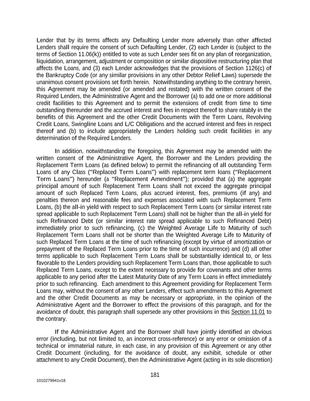 Lender that by its terms affects any Defaulting Lender more adversely than other affected Lenders shall require the consent of such Defaulting Lender, (2) each Lender is (subject to the terms of Section 11.06(k)) entitled to vote as such Lender sees fit on any plan of reorganization, liquidation, arrangement, adjustment or composition or similar dispositive restructuring plan that affects the Loans, and (3) each Lender acknowledges that the provisions of Section 1126(c) of the Bankruptcy Code (or any similar provisions in any other Debtor Relief Laws) supersede the unanimous consent provisions set forth herein. Notwithstanding anything to the contrary herein, this Agreement may be amended (or amended and restated) with the written consent of the Required Lenders, the Administrative Agent and the Borrower (a) to add one or more additional credit facilities to this Agreement and to permit the extensions of credit from time to time outstanding thereunder and the accrued interest and fees in respect thereof to share ratably in the benefits of this Agreement and the other Credit Documents with the Term Loans, Revolving Credit Loans, Swingline Loans and L/C Obligations and the accrued interest and fees in respect thereof and (b) to include appropriately the Lenders holding such credit facilities in any determination of the Required Lenders. In addition, notwithstanding the foregoing, this Agreement may be amended with the written consent of the Administrative Agent, the Borrower and the Lenders providing the Replacement Term Loans (as defined below) to permit the refinancing of all outstanding Term Loans of any Class (“Replaced Term Loans”) with replacement term loans (“Replacement Term Loans”) hereunder (a “Replacement Amendment”); provided that (a) the aggregate principal amount of such Replacement Term Loans shall not exceed the aggregate principal amount of such Replaced Term Loans, plus accrued interest, fees, premiums (if any) and penalties thereon and reasonable fees and expenses associated with such Replacement Term Loans, (b) the all-in yield with respect to such Replacement Term Loans (or similar interest rate spread applicable to such Replacement Term Loans) shall not be higher than the all-in yield for such Refinanced Debt (or similar interest rate spread applicable to such Refinanced Debt) immediately prior to such refinancing, (c) the Weighted Average Life to Maturity of such Replacement Term Loans shall not be shorter than the Weighted Average Life to Maturity of such Replaced Term Loans at the time of such refinancing (except by virtue of amortization or prepayment of the Replaced Term Loans prior to the time of such incurrence) and (d) all other terms applicable to such Replacement Term Loans shall be substantially identical to, or less favorable to the Lenders providing such Replacement Term Loans than, those applicable to such Replaced Term Loans, except to the extent necessary to provide for covenants and other terms applicable to any period after the Latest Maturity Date of any Term Loans in effect immediately prior to such refinancing. Each amendment to this Agreement providing for Replacement Term Loans may, without the consent of any other Lenders, effect such amendments to this Agreement and the other Credit Documents as may be necessary or appropriate, in the opinion of the Administrative Agent and the Borrower to effect the provisions of this paragraph, and for the avoidance of doubt, this paragraph shall supersede any other provisions in this Section 11.01 to the contrary. If the Administrative Agent and the Borrower shall have jointly identified an obvious error (including, but not limited to, an incorrect cross-reference) or any error or omission of a technical or immaterial nature, in each case, in any provision of this Agreement or any other Credit Document (including, for the avoidance of doubt, any exhibit, schedule or other attachment to any Credit Document), then the Administrative Agent (acting in its sole discretion) 181 1010279941v18