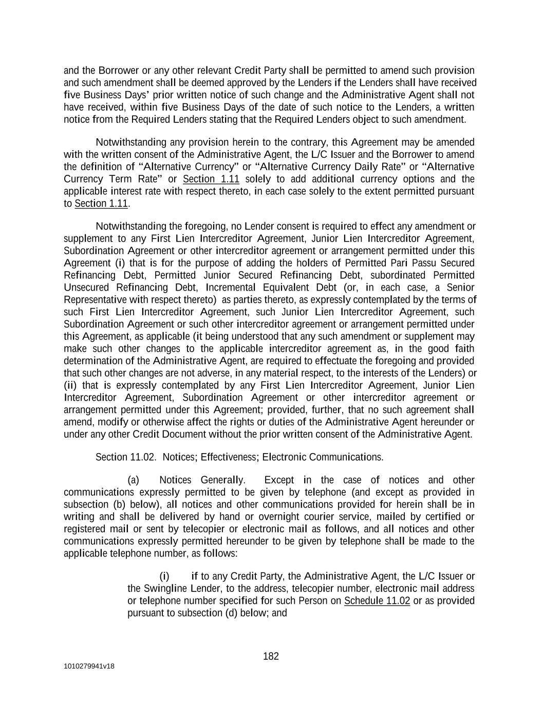 and the Borrower or any other relevant Credit Party shall be permitted to amend such provision and such amendment shall be deemed approved by the Lenders if the Lenders shall have received five Business Days’ prior written notice of such change and the Administrative Agent shall not have received, within five Business Days of the date of such notice to the Lenders, a written notice from the Required Lenders stating that the Required Lenders object to such amendment. Notwithstanding any provision herein to the contrary, this Agreement may be amended with the written consent of the Administrative Agent, the L/C Issuer and the Borrower to amend the definition of “Alternative Currency” or “Alternative Currency Daily Rate” or “Alternative Currency Term Rate” or Section 1.11 solely to add additional currency options and the applicable interest rate with respect thereto, in each case solely to the extent permitted pursuant to Section 1.11. Notwithstanding the foregoing, no Lender consent is required to effect any amendment or supplement to any First Lien Intercreditor Agreement, Junior Lien Intercreditor Agreement, Subordination Agreement or other intercreditor agreement or arrangement permitted under this Agreement (i) that is for the purpose of adding the holders of Permitted Pari Passu Secured Refinancing Debt, Permitted Junior Secured Refinancing Debt, subordinated Permitted Unsecured Refinancing Debt, Incremental Equivalent Debt (or, in each case, a Senior Representative with respect thereto) as parties thereto, as expressly contemplated by the terms of such First Lien Intercreditor Agreement, such Junior Lien Intercreditor Agreement, such Subordination Agreement or such other intercreditor agreement or arrangement permitted under this Agreement, as applicable (it being understood that any such amendment or supplement may make such other changes to the applicable intercreditor agreement as, in the good faith determination of the Administrative Agent, are required to effectuate the foregoing and provided that such other changes are not adverse, in any material respect, to the interests of the Lenders) or (ii) that is expressly contemplated by any First Lien Intercreditor Agreement, Junior Lien Intercreditor Agreement, Subordination Agreement or other intercreditor agreement or arrangement permitted under this Agreement; provided, further, that no such agreement shall amend, modify or otherwise affect the rights or duties of the Administrative Agent hereunder or under any other Credit Document without the prior written consent of the Administrative Agent. Section 11.02. Notices; Effectiveness; Electronic Communications. (a) Notices Generally. Except in the case of notices and other communications expressly permitted to be given by telephone (and except as provided in subsection (b) below), all notices and other communications provided for herein shall be in writing and shall be delivered by hand or overnight courier service, mailed by certified or registered mail or sent by telecopier or electronic mail as follows, and all notices and other communications expressly permitted hereunder to be given by telephone shall be made to the applicable telephone number, as follows: (i) if to any Credit Party, the Administrative Agent, the L/C Issuer or the Swingline Lender, to the address, telecopier number, electronic mail address or telephone number specified for such Person on Schedule 11.02 or as provided pursuant to subsection (d) below; and 182 1010279941v18