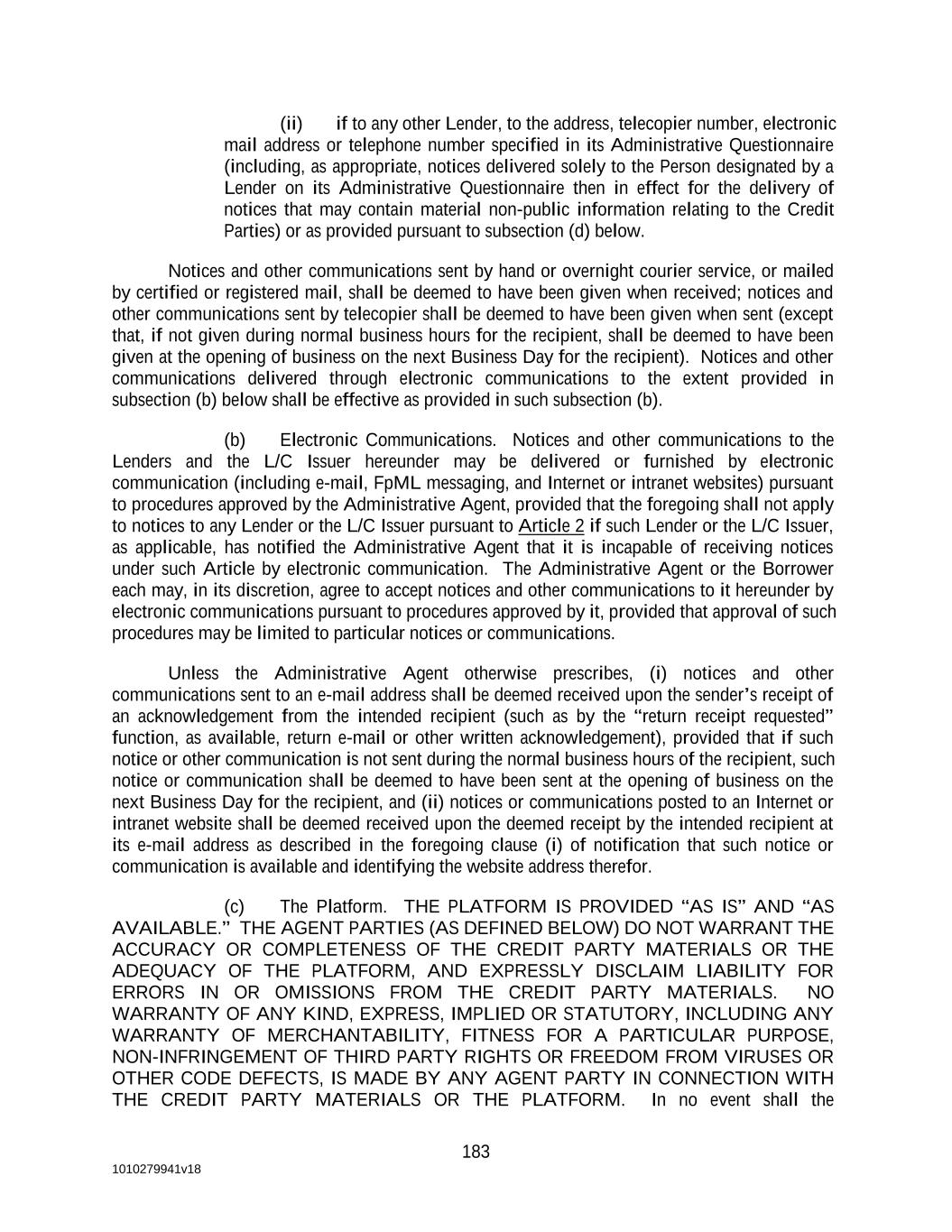 (ii) if to any other Lender, to the address, telecopier number, electronic mail address or telephone number specified in its Administrative Questionnaire (including, as appropriate, notices delivered solely to the Person designated by a Lender on its Administrative Questionnaire then in effect for the delivery of notices that may contain material non-public information relating to the Credit Parties) or as provided pursuant to subsection (d) below. Notices and other communications sent by hand or overnight courier service, or mailed by certified or registered mail, shall be deemed to have been given when received; notices and other communications sent by telecopier shall be deemed to have been given when sent (except that, if not given during normal business hours for the recipient, shall be deemed to have been given at the opening of business on the next Business Day for the recipient). Notices and other communications delivered through electronic communications to the extent provided in subsection (b) below shall be effective as provided in such subsection (b). (b) Electronic Communications. Notices and other communications to the Lenders and the L/C Issuer hereunder may be delivered or furnished by electronic communication (including e-mail, FpML messaging, and Internet or intranet websites) pursuant to procedures approved by the Administrative Agent, provided that the foregoing shall not apply to notices to any Lender or the L/C Issuer pursuant to Article 2 if such Lender or the L/C Issuer, as applicable, has notified the Administrative Agent that it is incapable of receiving notices under such Article by electronic communication. The Administrative Agent or the Borrower each may, in its discretion, agree to accept notices and other communications to it hereunder by electronic communications pursuant to procedures approved by it, provided that approval of such procedures may be limited to particular notices or communications. Unless the Administrative Agent otherwise prescribes, (i) notices and other communications sent to an e-mail address shall be deemed received upon the sender’s receipt of an acknowledgement from the intended recipient (such as by the “return receipt requested” function, as available, return e-mail or other written acknowledgement), provided that if such notice or other communication is not sent during the normal business hours of the recipient, such notice or communication shall be deemed to have been sent at the opening of business on the next Business Day for the recipient, and (ii) notices or communications posted to an Internet or intranet website shall be deemed received upon the deemed receipt by the intended recipient at its e-mail address as described in the foregoing clause (i) of notification that such notice or communication is available and identifying the website address therefor. (c) The Platform. THE PLATFORM IS PROVIDED “AS IS” AND “AS AVAILABLE.” THE AGENT PARTIES (AS DEFINED BELOW) DO NOT WARRANT THE ACCURACY OR COMPLETENESS OF THE CREDIT PARTY MATERIALS OR THE ADEQUACY OF THE PLATFORM, AND EXPRESSLY DISCLAIM LIABILITY FOR ERRORS IN OR OMISSIONS FROM THE CREDIT PARTY MATERIALS. NO WARRANTY OF ANY KIND, EXPRESS, IMPLIED OR STATUTORY, INCLUDING ANY WARRANTY OF MERCHANTABILITY, FITNESS FOR A PARTICULAR PURPOSE, NON-INFRINGEMENT OF THIRD PARTY RIGHTS OR FREEDOM FROM VIRUSES OR OTHER CODE DEFECTS, IS MADE BY ANY AGENT PARTY IN CONNECTION WITH THE CREDIT PARTY MATERIALS OR THE PLATFORM. In no event shall the 183 1010279941v18
