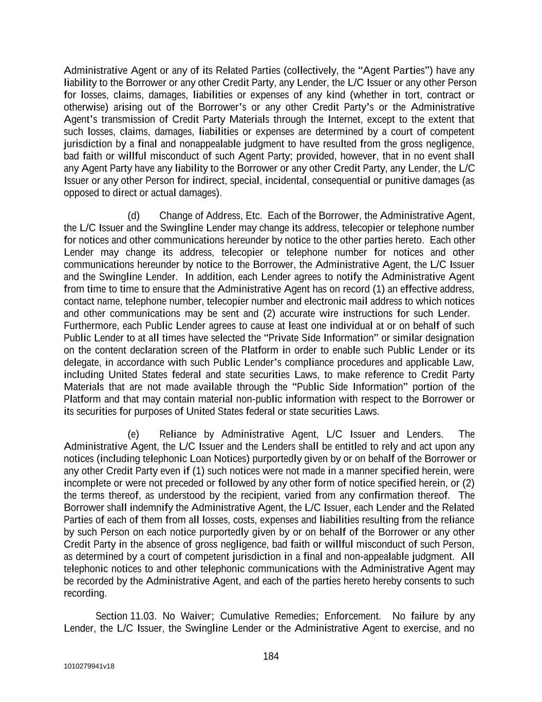 Administrative Agent or any of its Related Parties (collectively, the “Agent Parties”) have any liability to the Borrower or any other Credit Party, any Lender, the L/C Issuer or any other Person for losses, claims, damages, liabilities or expenses of any kind (whether in tort, contract or otherwise) arising out of the Borrower’s or any other Credit Party’s or the Administrative Agent’s transmission of Credit Party Materials through the Internet, except to the extent that such losses, claims, damages, liabilities or expenses are determined by a court of competent jurisdiction by a final and nonappealable judgment to have resulted from the gross negligence, bad faith or willful misconduct of such Agent Party; provided, however, that in no event shall any Agent Party have any liability to the Borrower or any other Credit Party, any Lender, the L/C Issuer or any other Person for indirect, special, incidental, consequential or punitive damages (as opposed to direct or actual damages). (d) Change of Address, Etc. Each of the Borrower, the Administrative Agent, the L/C Issuer and the Swingline Lender may change its address, telecopier or telephone number for notices and other communications hereunder by notice to the other parties hereto. Each other Lender may change its address, telecopier or telephone number for notices and other communications hereunder by notice to the Borrower, the Administrative Agent, the L/C Issuer and the Swingline Lender. In addition, each Lender agrees to notify the Administrative Agent from time to time to ensure that the Administrative Agent has on record (1) an effective address, contact name, telephone number, telecopier number and electronic mail address to which notices and other communications may be sent and (2) accurate wire instructions for such Lender. Furthermore, each Public Lender agrees to cause at least one individual at or on behalf of such Public Lender to at all times have selected the “Private Side Information” or similar designation on the content declaration screen of the Platform in order to enable such Public Lender or its delegate, in accordance with such Public Lender’s compliance procedures and applicable Law, including United States federal and state securities Laws, to make reference to Credit Party Materials that are not made available through the “Public Side Information” portion of the Platform and that may contain material non-public information with respect to the Borrower or its securities for purposes of United States federal or state securities Laws. (e) Reliance by Administrative Agent, L/C Issuer and Lenders. The Administrative Agent, the L/C Issuer and the Lenders shall be entitled to rely and act upon any notices (including telephonic Loan Notices) purportedly given by or on behalf of the Borrower or any other Credit Party even if (1) such notices were not made in a manner specified herein, were incomplete or were not preceded or followed by any other form of notice specified herein, or (2) the terms thereof, as understood by the recipient, varied from any confirmation thereof. The Borrower shall indemnify the Administrative Agent, the L/C Issuer, each Lender and the Related Parties of each of them from all losses, costs, expenses and liabilities resulting from the reliance by such Person on each notice purportedly given by or on behalf of the Borrower or any other Credit Party in the absence of gross negligence, bad faith or willful misconduct of such Person, as determined by a court of competent jurisdiction in a final and non-appealable judgment. All telephonic notices to and other telephonic communications with the Administrative Agent may be recorded by the Administrative Agent, and each of the parties hereto hereby consents to such recording. Section 11.03. No Waiver; Cumulative Remedies; Enforcement. No failure by any Lender, the L/C Issuer, the Swingline Lender or the Administrative Agent to exercise, and no 184 1010279941v18