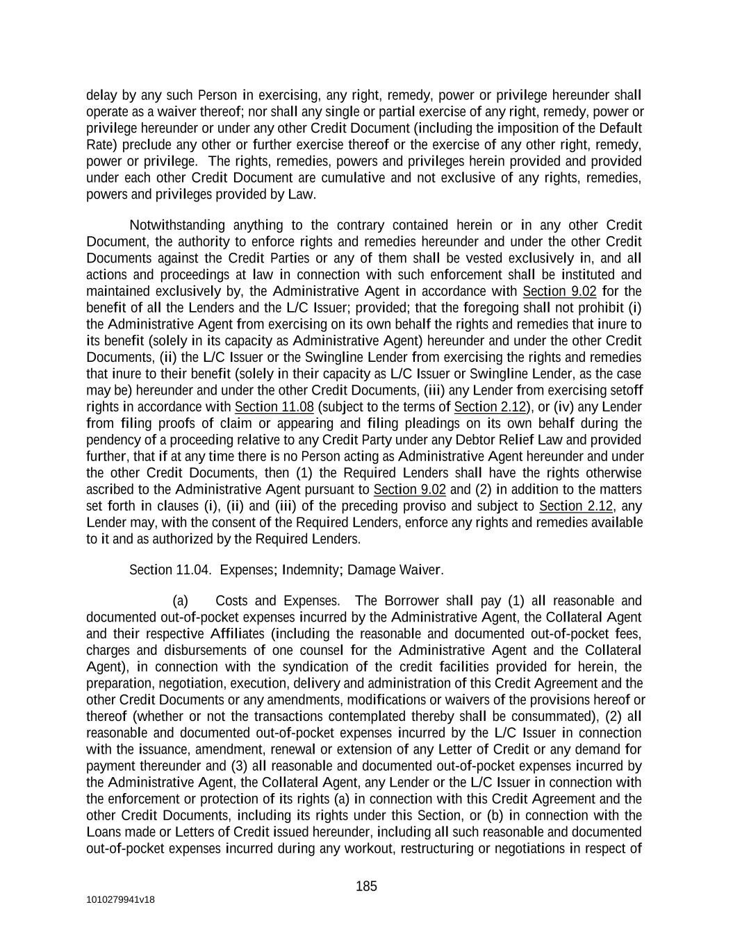 delay by any such Person in exercising, any right, remedy, power or privilege hereunder shall operate as a waiver thereof; nor shall any single or partial exercise of any right, remedy, power or privilege hereunder or under any other Credit Document (including the imposition of the Default Rate) preclude any other or further exercise thereof or the exercise of any other right, remedy, power or privilege. The rights, remedies, powers and privileges herein provided and provided under each other Credit Document are cumulative and not exclusive of any rights, remedies, powers and privileges provided by Law. Notwithstanding anything to the contrary contained herein or in any other Credit Document, the authority to enforce rights and remedies hereunder and under the other Credit Documents against the Credit Parties or any of them shall be vested exclusively in, and all actions and proceedings at law in connection with such enforcement shall be instituted and maintained exclusively by, the Administrative Agent in accordance with Section 9.02 for the benefit of all the Lenders and the L/C Issuer; provided; that the foregoing shall not prohibit (i) the Administrative Agent from exercising on its own behalf the rights and remedies that inure to its benefit (solely in its capacity as Administrative Agent) hereunder and under the other Credit Documents, (ii) the L/C Issuer or the Swingline Lender from exercising the rights and remedies that inure to their benefit (solely in their capacity as L/C Issuer or Swingline Lender, as the case may be) hereunder and under the other Credit Documents, (iii) any Lender from exercising setoff rights in accordance with Section 11.08 (subject to the terms of Section 2.12), or (iv) any Lender from filing proofs of claim or appearing and filing pleadings on its own behalf during the pendency of a proceeding relative to any Credit Party under any Debtor Relief Law and provided further, that if at any time there is no Person acting as Administrative Agent hereunder and under the other Credit Documents, then (1) the Required Lenders shall have the rights otherwise ascribed to the Administrative Agent pursuant to Section 9.02 and (2) in addition to the matters set forth in clauses (i), (ii) and (iii) of the preceding proviso and subject to Section 2.12, any Lender may, with the consent of the Required Lenders, enforce any rights and remedies available to it and as authorized by the Required Lenders. Section 11.04. Expenses; Indemnity; Damage Waiver. (a) Costs and Expenses. The Borrower shall pay (1) all reasonable and documented out-of-pocket expenses incurred by the Administrative Agent, the Collateral Agent and their respective Affiliates (including the reasonable and documented out-of-pocket fees, charges and disbursements of one counsel for the Administrative Agent and the Collateral Agent), in connection with the syndication of the credit facilities provided for herein, the preparation, negotiation, execution, delivery and administration of this Credit Agreement and the other Credit Documents or any amendments, modifications or waivers of the provisions hereof or thereof (whether or not the transactions contemplated thereby shall be consummated), (2) all reasonable and documented out-of-pocket expenses incurred by the L/C Issuer in connection with the issuance, amendment, renewal or extension of any Letter of Credit or any demand for payment thereunder and (3) all reasonable and documented out-of-pocket expenses incurred by the Administrative Agent, the Collateral Agent, any Lender or the L/C Issuer in connection with the enforcement or protection of its rights (a) in connection with this Credit Agreement and the other Credit Documents, including its rights under this Section, or (b) in connection with the Loans made or Letters of Credit issued hereunder, including all such reasonable and documented out-of-pocket expenses incurred during any workout, restructuring or negotiations in respect of 185 1010279941v18
