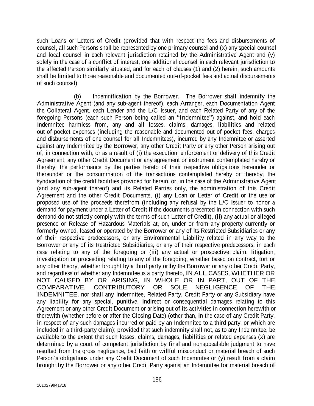 such Loans or Letters of Credit (provided that with respect the fees and disbursements of counsel, all such Persons shall be represented by one primary counsel and (x) any special counsel and local counsel in each relevant jurisdiction retained by the Administrative Agent and (y) solely in the case of a conflict of interest, one additional counsel in each relevant jurisdiction to the affected Person similarly situated, and for each of clauses (1) and (2) herein, such amounts shall be limited to those reasonable and documented out-of-pocket fees and actual disbursements of such counsel). (b) Indemnification by the Borrower. The Borrower shall indemnify the Administrative Agent (and any sub-agent thereof), each Arranger, each Documentation Agent the Collateral Agent, each Lender and the L/C Issuer, and each Related Party of any of the foregoing Persons (each such Person being called an “Indemnitee”) against, and hold each Indemnitee harmless from, any and all losses, claims, damages, liabilities and related out-of-pocket expenses (including the reasonable and documented out-of-pocket fees, charges and disbursements of one counsel for all Indemnitees), incurred by any Indemnitee or asserted against any Indemnitee by the Borrower, any other Credit Party or any other Person arising out of, in connection with, or as a result of (i) the execution, enforcement or delivery of this Credit Agreement, any other Credit Document or any agreement or instrument contemplated hereby or thereby, the performance by the parties hereto of their respective obligations hereunder or thereunder or the consummation of the transactions contemplated hereby or thereby, the syndication of the credit facilities provided for herein, or, in the case of the Administrative Agent (and any sub-agent thereof) and its Related Parties only, the administration of this Credit Agreement and the other Credit Documents, (i) any Loan or Letter of Credit or the use or proposed use of the proceeds therefrom (including any refusal by the L/C Issuer to honor a demand for payment under a Letter of Credit if the documents presented in connection with such demand do not strictly comply with the terms of such Letter of Credit), (ii) any actual or alleged presence or Release of Hazardous Materials at, on, under or from any property currently or formerly owned, leased or operated by the Borrower or any of its Restricted Subsidiaries or any of their respective predecessors, or any Environmental Liability related in any way to the Borrower or any of its Restricted Subsidiaries, or any of their respective predecessors, in each case relating to any of the foregoing or (iii) any actual or prospective claim, litigation, investigation or proceeding relating to any of the foregoing, whether based on contract, tort or any other theory, whether brought by a third party or by the Borrower or any other Credit Party, and regardless of whether any Indemnitee is a party thereto, IN ALL CASES, WHETHER OR NOT CAUSED BY OR ARISING, IN WHOLE OR IN PART, OUT OF THE COMPARATIVE, CONTRIBUTORY OR SOLE NEGLIGENCE OF THE INDEMNITEE, nor shall any Indemnitee, Related Party, Credit Party or any Subsidiary have any liability for any special, punitive, indirect or consequential damages relating to this Agreement or any other Credit Document or arising out of its activities in connection herewith or therewith (whether before or after the Closing Date) (other than, in the case of any Credit Party, in respect of any such damages incurred or paid by an Indemnitee to a third party, or which are included in a third-party claim); provided that such indemnity shall not, as to any Indemnitee, be available to the extent that such losses, claims, damages, liabilities or related expenses (x) are determined by a court of competent jurisdiction by final and nonappealable judgment to have resulted from the gross negligence, bad faith or willful misconduct or material breach of such Person’s obligations under any Credit Document of such Indemnitee or (y) result from a claim brought by the Borrower or any other Credit Party against an Indemnitee for material breach of 186 1010279941v18