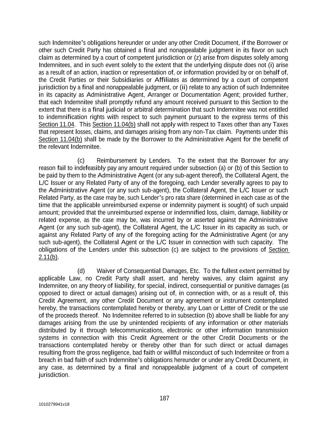 such Indemnitee’s obligations hereunder or under any other Credit Document, if the Borrower or other such Credit Party has obtained a final and nonappealable judgment in its favor on such claim as determined by a court of competent jurisdiction or (z) arise from disputes solely among Indemnitees, and in such event solely to the extent that the underlying dispute does not (i) arise as a result of an action, inaction or representation of, or information provided by or on behalf of, the Credit Parties or their Subsidiaries or Affiliates as determined by a court of competent jurisdiction by a final and nonappealable judgment, or (ii) relate to any action of such Indemnitee in its capacity as Administrative Agent, Arranger or Documentation Agent; provided further, that each Indemnitee shall promptly refund any amount received pursuant to this Section to the extent that there is a final judicial or arbitral determination that such Indemnitee was not entitled to indemnification rights with respect to such payment pursuant to the express terms of this Section 11.04. This Section 11.04(b) shall not apply with respect to Taxes other than any Taxes that represent losses, claims, and damages arising from any non-Tax claim. Payments under this Section 11.04(b) shall be made by the Borrower to the Administrative Agent for the benefit of the relevant Indemnitee. (c) Reimbursement by Lenders. To the extent that the Borrower for any reason fail to indefeasibly pay any amount required under subsection (a) or (b) of this Section to be paid by them to the Administrative Agent (or any sub-agent thereof), the Collateral Agent, the L/C Issuer or any Related Party of any of the foregoing, each Lender severally agrees to pay to the Administrative Agent (or any such sub-agent), the Collateral Agent, the L/C Issuer or such Related Party, as the case may be, such Lender’s pro rata share (determined in each case as of the time that the applicable unreimbursed expense or indemnity payment is sought) of such unpaid amount; provided that the unreimbursed expense or indemnified loss, claim, damage, liability or related expense, as the case may be, was incurred by or asserted against the Administrative Agent (or any such sub-agent), the Collateral Agent, the L/C Issuer in its capacity as such, or against any Related Party of any of the foregoing acting for the Administrative Agent (or any such sub-agent), the Collateral Agent or the L/C Issuer in connection with such capacity. The obligations of the Lenders under this subsection (c) are subject to the provisions of Section 2.11(b). (d) Waiver of Consequential Damages, Etc. To the fullest extent permitted by applicable Law, no Credit Party shall assert, and hereby waives, any claim against any Indemnitee, on any theory of liability, for special, indirect, consequential or punitive damages (as opposed to direct or actual damages) arising out of, in connection with, or as a result of, this Credit Agreement, any other Credit Document or any agreement or instrument contemplated hereby, the transactions contemplated hereby or thereby, any Loan or Letter of Credit or the use of the proceeds thereof. No Indemnitee referred to in subsection (b) above shall be liable for any damages arising from the use by unintended recipients of any information or other materials distributed by it through telecommunications, electronic or other information transmission systems in connection with this Credit Agreement or the other Credit Documents or the transactions contemplated hereby or thereby other than for such direct or actual damages resulting from the gross negligence, bad faith or willful misconduct of such Indemnitee or from a breach in bad faith of such Indemnitee’s obligations hereunder or under any Credit Document, in any case, as determined by a final and nonappealable judgment of a court of competent jurisdiction. 187 1010279941v18