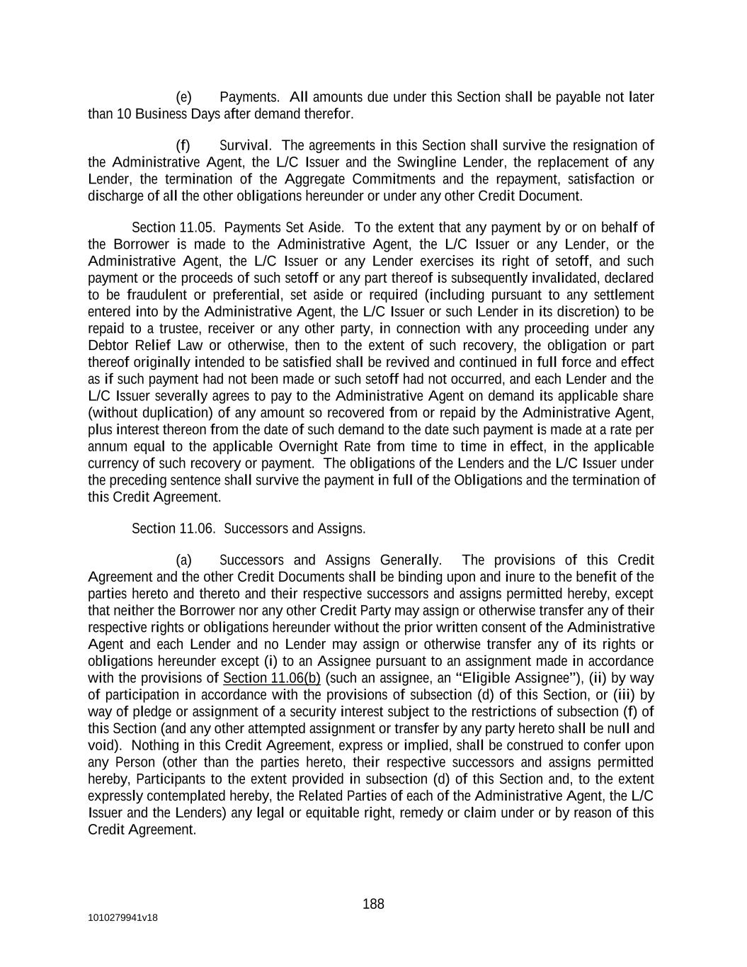 (e) Payments. All amounts due under this Section shall be payable not later than 10 Business Days after demand therefor. (f) Survival. The agreements in this Section shall survive the resignation of the Administrative Agent, the L/C Issuer and the Swingline Lender, the replacement of any Lender, the termination of the Aggregate Commitments and the repayment, satisfaction or discharge of all the other obligations hereunder or under any other Credit Document. Section 11.05. Payments Set Aside. To the extent that any payment by or on behalf of the Borrower is made to the Administrative Agent, the L/C Issuer or any Lender, or the Administrative Agent, the L/C Issuer or any Lender exercises its right of setoff, and such payment or the proceeds of such setoff or any part thereof is subsequently invalidated, declared to be fraudulent or preferential, set aside or required (including pursuant to any settlement entered into by the Administrative Agent, the L/C Issuer or such Lender in its discretion) to be repaid to a trustee, receiver or any other party, in connection with any proceeding under any Debtor Relief Law or otherwise, then to the extent of such recovery, the obligation or part thereof originally intended to be satisfied shall be revived and continued in full force and effect as if such payment had not been made or such setoff had not occurred, and each Lender and the L/C Issuer severally agrees to pay to the Administrative Agent on demand its applicable share (without duplication) of any amount so recovered from or repaid by the Administrative Agent, plus interest thereon from the date of such demand to the date such payment is made at a rate per annum equal to the applicable Overnight Rate from time to time in effect, in the applicable currency of such recovery or payment. The obligations of the Lenders and the L/C Issuer under the preceding sentence shall survive the payment in full of the Obligations and the termination of this Credit Agreement. Section 11.06. Successors and Assigns. (a) Successors and Assigns Generally. The provisions of this Credit Agreement and the other Credit Documents shall be binding upon and inure to the benefit of the parties hereto and thereto and their respective successors and assigns permitted hereby, except that neither the Borrower nor any other Credit Party may assign or otherwise transfer any of their respective rights or obligations hereunder without the prior written consent of the Administrative Agent and each Lender and no Lender may assign or otherwise transfer any of its rights or obligations hereunder except (i) to an Assignee pursuant to an assignment made in accordance with the provisions of Section 11.06(b) (such an assignee, an “Eligible Assignee”), (ii) by way of participation in accordance with the provisions of subsection (d) of this Section, or (iii) by way of pledge or assignment of a security interest subject to the restrictions of subsection (f) of this Section (and any other attempted assignment or transfer by any party hereto shall be null and void). Nothing in this Credit Agreement, express or implied, shall be construed to confer upon any Person (other than the parties hereto, their respective successors and assigns permitted hereby, Participants to the extent provided in subsection (d) of this Section and, to the extent expressly contemplated hereby, the Related Parties of each of the Administrative Agent, the L/C Issuer and the Lenders) any legal or equitable right, remedy or claim under or by reason of this Credit Agreement. 188 1010279941v18