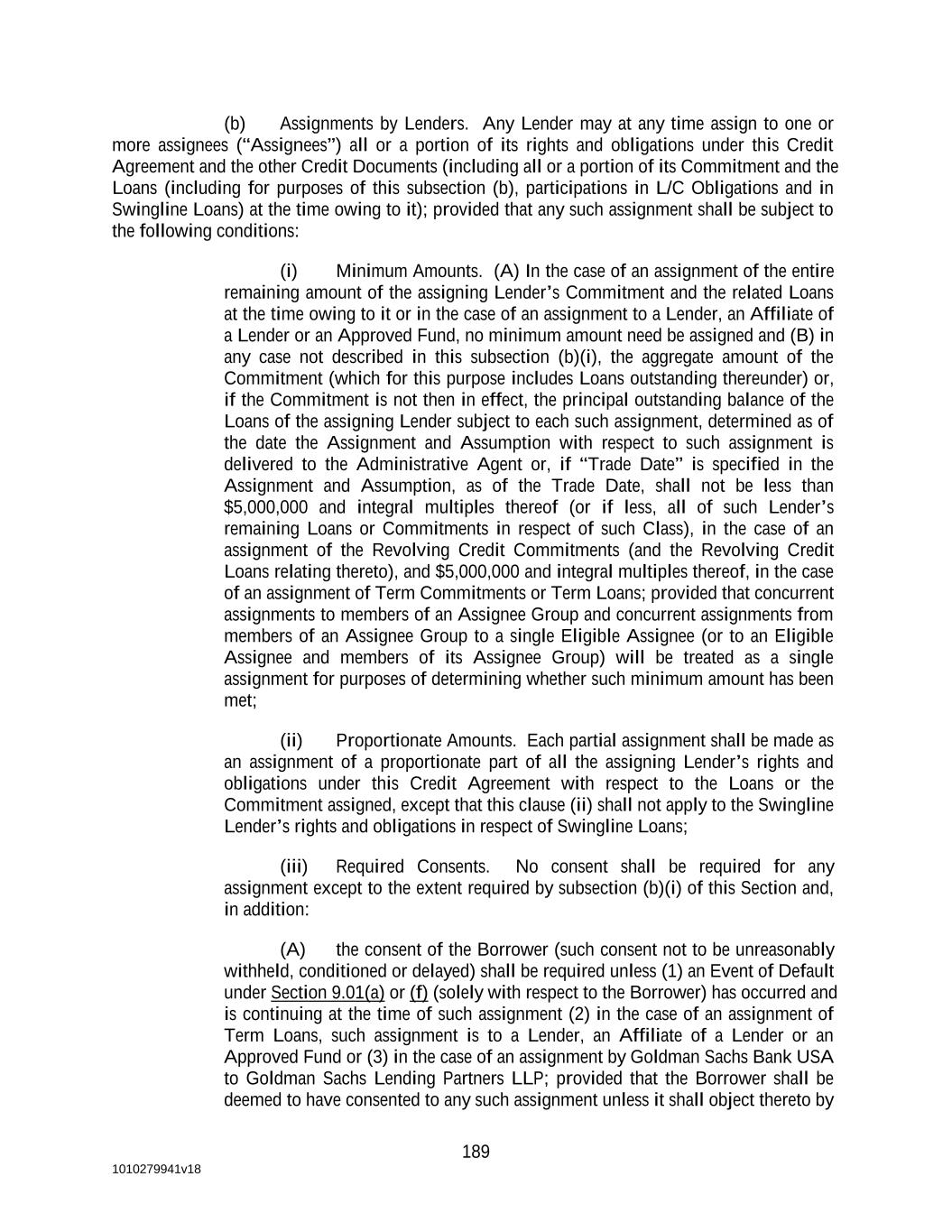 (b) Assignments by Lenders. Any Lender may at any time assign to one or more assignees (“Assignees”) all or a portion of its rights and obligations under this Credit Agreement and the other Credit Documents (including all or a portion of its Commitment and the Loans (including for purposes of this subsection (b), participations in L/C Obligations and in Swingline Loans) at the time owing to it); provided that any such assignment shall be subject to the following conditions: (i) Minimum Amounts. (A) In the case of an assignment of the entire remaining amount of the assigning Lender’s Commitment and the related Loans at the time owing to it or in the case of an assignment to a Lender, an Affiliate of a Lender or an Approved Fund, no minimum amount need be assigned and (B) in any case not described in this subsection (b)(i), the aggregate amount of the Commitment (which for this purpose includes Loans outstanding thereunder) or, if the Commitment is not then in effect, the principal outstanding balance of the Loans of the assigning Lender subject to each such assignment, determined as of the date the Assignment and Assumption with respect to such assignment is delivered to the Administrative Agent or, if “Trade Date” is specified in the Assignment and Assumption, as of the Trade Date, shall not be less than $5,000,000 and integral multiples thereof (or if less, all of such Lender’s remaining Loans or Commitments in respect of such Class), in the case of an assignment of the Revolving Credit Commitments (and the Revolving Credit Loans relating thereto), and $5,000,000 and integral multiples thereof, in the case of an assignment of Term Commitments or Term Loans; provided that concurrent assignments to members of an Assignee Group and concurrent assignments from members of an Assignee Group to a single Eligible Assignee (or to an Eligible Assignee and members of its Assignee Group) will be treated as a single assignment for purposes of determining whether such minimum amount has been met; (ii) Proportionate Amounts. Each partial assignment shall be made as an assignment of a proportionate part of all the assigning Lender’s rights and obligations under this Credit Agreement with respect to the Loans or the Commitment assigned, except that this clause (ii) shall not apply to the Swingline Lender’s rights and obligations in respect of Swingline Loans; (iii) Required Consents. No consent shall be required for any assignment except to the extent required by subsection (b)(i) of this Section and, in addition: (A) the consent of the Borrower (such consent not to be unreasonably withheld, conditioned or delayed) shall be required unless (1) an Event of Default under Section 9.01(a) or (f) (solely with respect to the Borrower) has occurred and is continuing at the time of such assignment (2) in the case of an assignment of Term Loans, such assignment is to a Lender, an Affiliate of a Lender or an Approved Fund or (3) in the case of an assignment by Goldman Sachs Bank USA to Goldman Sachs Lending Partners LLP; provided that the Borrower shall be deemed to have consented to any such assignment unless it shall object thereto by 189 1010279941v18