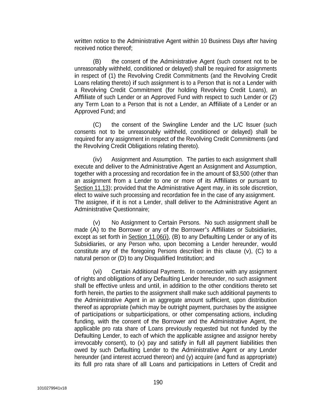 written notice to the Administrative Agent within 10 Business Days after having received notice thereof; (B) the consent of the Administrative Agent (such consent not to be unreasonably withheld, conditioned or delayed) shall be required for assignments in respect of (1) the Revolving Credit Commitments (and the Revolving Credit Loans relating thereto) if such assignment is to a Person that is not a Lender with a Revolving Credit Commitment (for holding Revolving Credit Loans), an Affiliate of such Lender or an Approved Fund with respect to such Lender or (2) any Term Loan to a Person that is not a Lender, an Affiliate of a Lender or an Approved Fund; and (C) the consent of the Swingline Lender and the L/C Issuer (such consents not to be unreasonably withheld, conditioned or delayed) shall be required for any assignment in respect of the Revolving Credit Commitments (and the Revolving Credit Obligations relating thereto). (iv) Assignment and Assumption. The parties to each assignment shall execute and deliver to the Administrative Agent an Assignment and Assumption, together with a processing and recordation fee in the amount of $3,500 (other than an assignment from a Lender to one or more of its Affiliates or pursuant to Section 11.13); provided that the Administrative Agent may, in its sole discretion, elect to waive such processing and recordation fee in the case of any assignment. The assignee, if it is not a Lender, shall deliver to the Administrative Agent an Administrative Questionnaire; (v) No Assignment to Certain Persons. No such assignment shall be made (A) to the Borrower or any of the Borrower’s Affiliates or Subsidiaries, except as set forth in Section 11.06(i), (B) to any Defaulting Lender or any of its Subsidiaries, or any Person who, upon becoming a Lender hereunder, would constitute any of the foregoing Persons described in this clause (v), (C) to a natural person or (D) to any Disqualified Institution; and (vi) Certain Additional Payments. In connection with any assignment of rights and obligations of any Defaulting Lender hereunder, no such assignment shall be effective unless and until, in addition to the other conditions thereto set forth herein, the parties to the assignment shall make such additional payments to the Administrative Agent in an aggregate amount sufficient, upon distribution thereof as appropriate (which may be outright payment, purchases by the assignee of participations or subparticipations, or other compensating actions, including funding, with the consent of the Borrower and the Administrative Agent, the applicable pro rata share of Loans previously requested but not funded by the Defaulting Lender, to each of which the applicable assignee and assignor hereby irrevocably consent), to (x) pay and satisfy in full all payment liabilities then owed by such Defaulting Lender to the Administrative Agent or any Lender hereunder (and interest accrued thereon) and (y) acquire (and fund as appropriate) its full pro rata share of all Loans and participations in Letters of Credit and 190 1010279941v18
