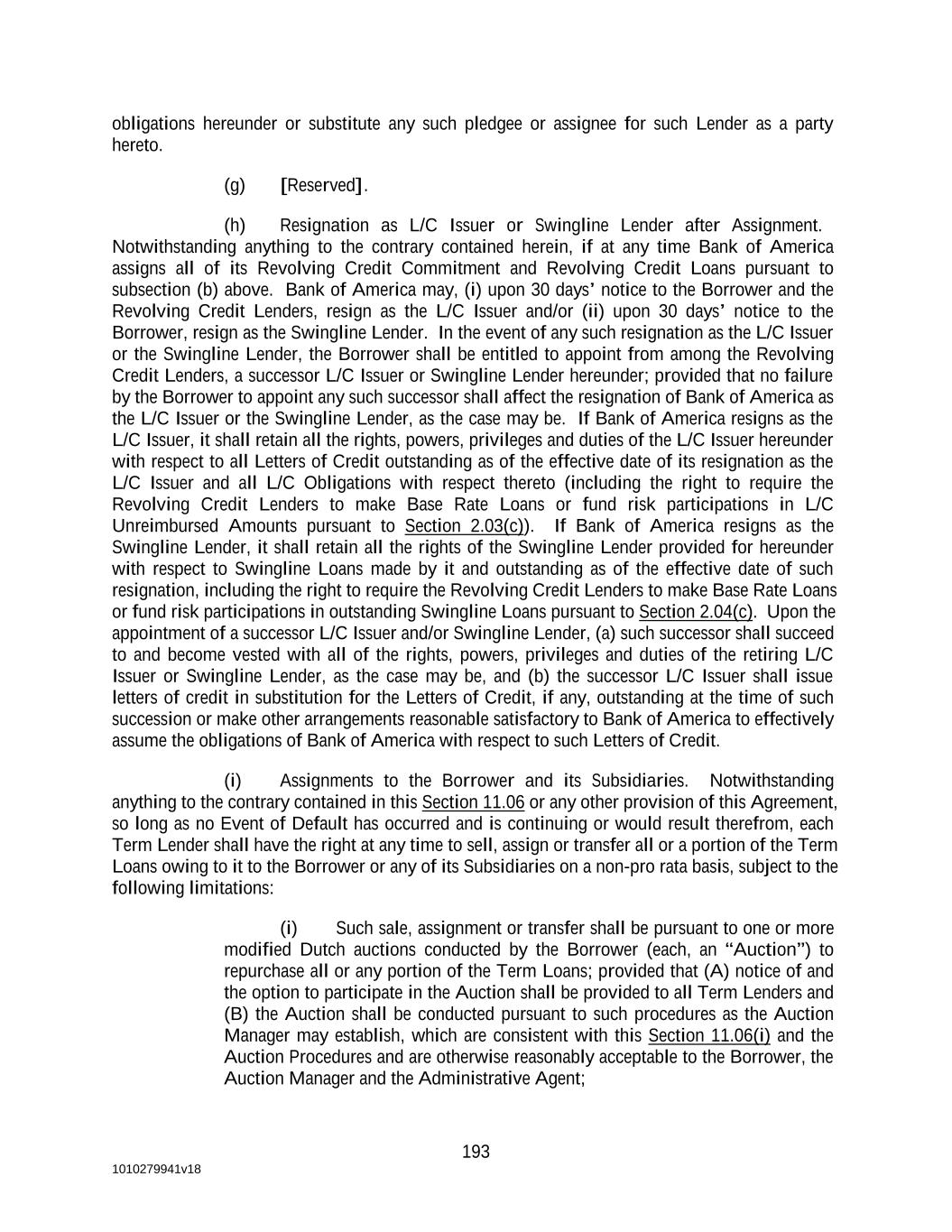 obligations hereunder or substitute any such pledgee or assignee for such Lender as a party hereto. (g) [Reserved]. (h) Resignation as L/C Issuer or Swingline Lender after Assignment. Notwithstanding anything to the contrary contained herein, if at any time Bank of America assigns all of its Revolving Credit Commitment and Revolving Credit Loans pursuant to subsection (b) above. Bank of America may, (i) upon 30 days’ notice to the Borrower and the Revolving Credit Lenders, resign as the L/C Issuer and/or (ii) upon 30 days’ notice to the Borrower, resign as the Swingline Lender. In the event of any such resignation as the L/C Issuer or the Swingline Lender, the Borrower shall be entitled to appoint from among the Revolving Credit Lenders, a successor L/C Issuer or Swingline Lender hereunder; provided that no failure by the Borrower to appoint any such successor shall affect the resignation of Bank of America as the L/C Issuer or the Swingline Lender, as the case may be. If Bank of America resigns as the L/C Issuer, it shall retain all the rights, powers, privileges and duties of the L/C Issuer hereunder with respect to all Letters of Credit outstanding as of the effective date of its resignation as the L/C Issuer and all L/C Obligations with respect thereto (including the right to require the Revolving Credit Lenders to make Base Rate Loans or fund risk participations in L/C Unreimbursed Amounts pursuant to Section 2.03(c)). If Bank of America resigns as the Swingline Lender, it shall retain all the rights of the Swingline Lender provided for hereunder with respect to Swingline Loans made by it and outstanding as of the effective date of such resignation, including the right to require the Revolving Credit Lenders to make Base Rate Loans or fund risk participations in outstanding Swingline Loans pursuant to Section 2.04(c). Upon the appointment of a successor L/C Issuer and/or Swingline Lender, (a) such successor shall succeed to and become vested with all of the rights, powers, privileges and duties of the retiring L/C Issuer or Swingline Lender, as the case may be, and (b) the successor L/C Issuer shall issue letters of credit in substitution for the Letters of Credit, if any, outstanding at the time of such succession or make other arrangements reasonable satisfactory to Bank of America to effectively assume the obligations of Bank of America with respect to such Letters of Credit. (i) Assignments to the Borrower and its Subsidiaries. Notwithstanding anything to the contrary contained in this Section 11.06 or any other provision of this Agreement, so long as no Event of Default has occurred and is continuing or would result therefrom, each Term Lender shall have the right at any time to sell, assign or transfer all or a portion of the Term Loans owing to it to the Borrower or any of its Subsidiaries on a non-pro rata basis, subject to the following limitations: (i) Such sale, assignment or transfer shall be pursuant to one or more modified Dutch auctions conducted by the Borrower (each, an “Auction”) to repurchase all or any portion of the Term Loans; provided that (A) notice of and the option to participate in the Auction shall be provided to all Term Lenders and (B) the Auction shall be conducted pursuant to such procedures as the Auction Manager may establish, which are consistent with this Section 11.06(i) and the Auction Procedures and are otherwise reasonably acceptable to the Borrower, the Auction Manager and the Administrative Agent; 193 1010279941v18