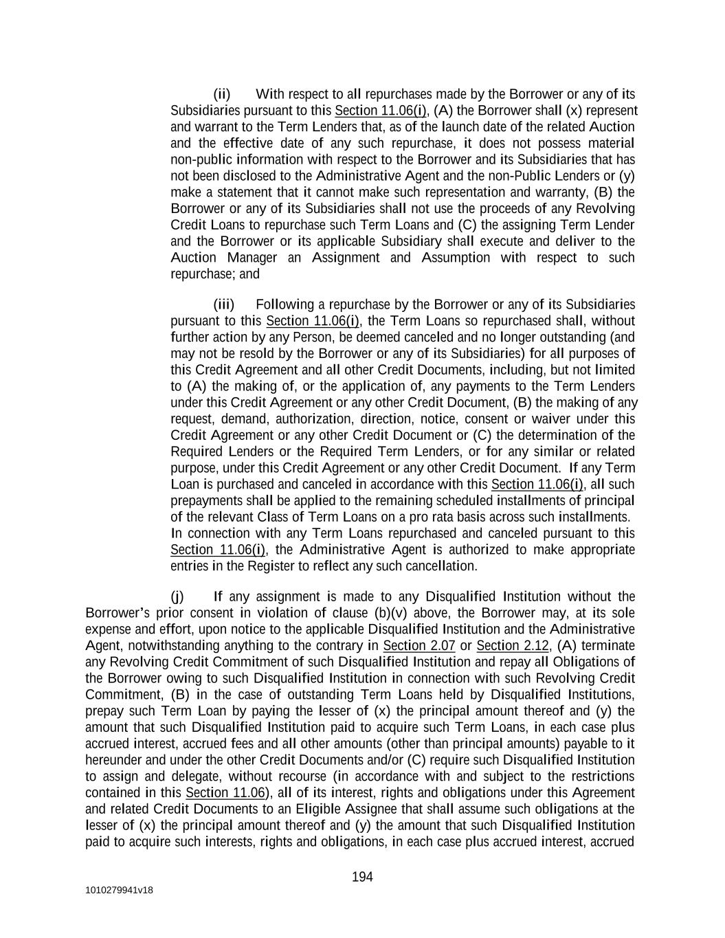 (ii) With respect to all repurchases made by the Borrower or any of its Subsidiaries pursuant to this Section 11.06(i), (A) the Borrower shall (x) represent and warrant to the Term Lenders that, as of the launch date of the related Auction and the effective date of any such repurchase, it does not possess material non-public information with respect to the Borrower and its Subsidiaries that has not been disclosed to the Administrative Agent and the non-Public Lenders or (y) make a statement that it cannot make such representation and warranty, (B) the Borrower or any of its Subsidiaries shall not use the proceeds of any Revolving Credit Loans to repurchase such Term Loans and (C) the assigning Term Lender and the Borrower or its applicable Subsidiary shall execute and deliver to the Auction Manager an Assignment and Assumption with respect to such repurchase; and (iii) Following a repurchase by the Borrower or any of its Subsidiaries pursuant to this Section 11.06(i), the Term Loans so repurchased shall, without further action by any Person, be deemed canceled and no longer outstanding (and may not be resold by the Borrower or any of its Subsidiaries) for all purposes of this Credit Agreement and all other Credit Documents, including, but not limited to (A) the making of, or the application of, any payments to the Term Lenders under this Credit Agreement or any other Credit Document, (B) the making of any request, demand, authorization, direction, notice, consent or waiver under this Credit Agreement or any other Credit Document or (C) the determination of the Required Lenders or the Required Term Lenders, or for any similar or related purpose, under this Credit Agreement or any other Credit Document. If any Term Loan is purchased and canceled in accordance with this Section 11.06(i), all such prepayments shall be applied to the remaining scheduled installments of principal of the relevant Class of Term Loans on a pro rata basis across such installments. In connection with any Term Loans repurchased and canceled pursuant to this Section 11.06(i), the Administrative Agent is authorized to make appropriate entries in the Register to reflect any such cancellation. (j) If any assignment is made to any Disqualified Institution without the Borrower’s prior consent in violation of clause (b)(v) above, the Borrower may, at its sole expense and effort, upon notice to the applicable Disqualified Institution and the Administrative Agent, notwithstanding anything to the contrary in Section 2.07 or Section 2.12, (A) terminate any Revolving Credit Commitment of such Disqualified Institution and repay all Obligations of the Borrower owing to such Disqualified Institution in connection with such Revolving Credit Commitment, (B) in the case of outstanding Term Loans held by Disqualified Institutions, prepay such Term Loan by paying the lesser of (x) the principal amount thereof and (y) the amount that such Disqualified Institution paid to acquire such Term Loans, in each case plus accrued interest, accrued fees and all other amounts (other than principal amounts) payable to it hereunder and under the other Credit Documents and/or (C) require such Disqualified Institution to assign and delegate, without recourse (in accordance with and subject to the restrictions contained in this Section 11.06), all of its interest, rights and obligations under this Agreement and related Credit Documents to an Eligible Assignee that shall assume such obligations at the lesser of (x) the principal amount thereof and (y) the amount that such Disqualified Institution paid to acquire such interests, rights and obligations, in each case plus accrued interest, accrued 194 1010279941v18
