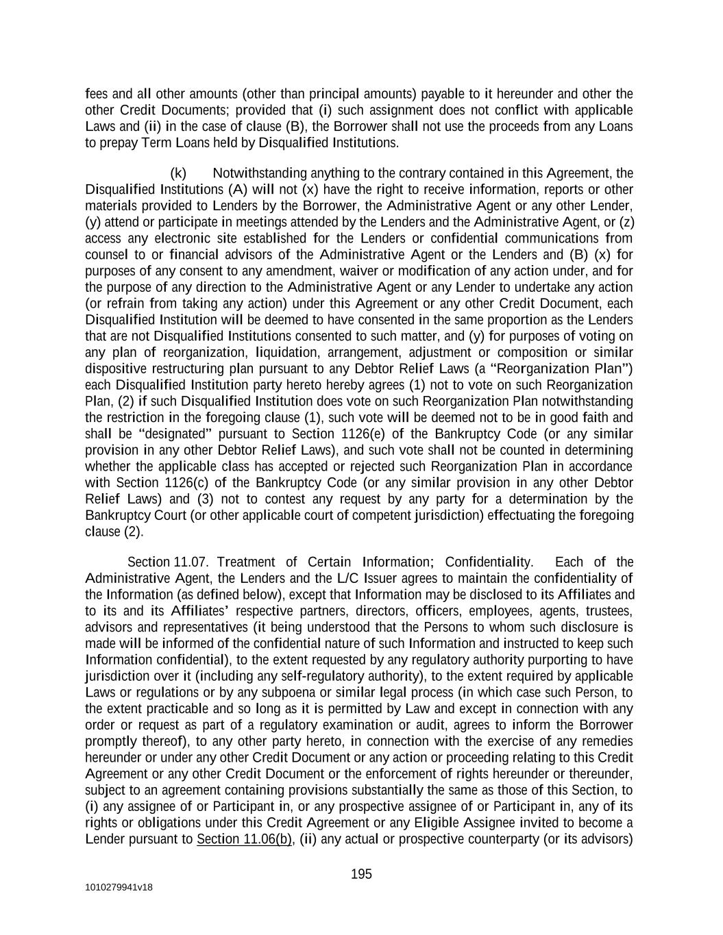 fees and all other amounts (other than principal amounts) payable to it hereunder and other the other Credit Documents; provided that (i) such assignment does not conflict with applicable Laws and (ii) in the case of clause (B), the Borrower shall not use the proceeds from any Loans to prepay Term Loans held by Disqualified Institutions. (k) Notwithstanding anything to the contrary contained in this Agreement, the Disqualified Institutions (A) will not (x) have the right to receive information, reports or other materials provided to Lenders by the Borrower, the Administrative Agent or any other Lender, (y) attend or participate in meetings attended by the Lenders and the Administrative Agent, or (z) access any electronic site established for the Lenders or confidential communications from counsel to or financial advisors of the Administrative Agent or the Lenders and (B) (x) for purposes of any consent to any amendment, waiver or modification of any action under, and for the purpose of any direction to the Administrative Agent or any Lender to undertake any action (or refrain from taking any action) under this Agreement or any other Credit Document, each Disqualified Institution will be deemed to have consented in the same proportion as the Lenders that are not Disqualified Institutions consented to such matter, and (y) for purposes of voting on any plan of reorganization, liquidation, arrangement, adjustment or composition or similar dispositive restructuring plan pursuant to any Debtor Relief Laws (a “Reorganization Plan”) each Disqualified Institution party hereto hereby agrees (1) not to vote on such Reorganization Plan, (2) if such Disqualified Institution does vote on such Reorganization Plan notwithstanding the restriction in the foregoing clause (1), such vote will be deemed not to be in good faith and shall be “designated” pursuant to Section 1126(e) of the Bankruptcy Code (or any similar provision in any other Debtor Relief Laws), and such vote shall not be counted in determining whether the applicable class has accepted or rejected such Reorganization Plan in accordance with Section 1126(c) of the Bankruptcy Code (or any similar provision in any other Debtor Relief Laws) and (3) not to contest any request by any party for a determination by the Bankruptcy Court (or other applicable court of competent jurisdiction) effectuating the foregoing clause (2). Section 11.07. Treatment of Certain Information; Confidentiality. Each of the Administrative Agent, the Lenders and the L/C Issuer agrees to maintain the confidentiality of the Information (as defined below), except that Information may be disclosed to its Affiliates and to its and its Affiliates’ respective partners, directors, officers, employees, agents, trustees, advisors and representatives (it being understood that the Persons to whom such disclosure is made will be informed of the confidential nature of such Information and instructed to keep such Information confidential), to the extent requested by any regulatory authority purporting to have jurisdiction over it (including any self-regulatory authority), to the extent required by applicable Laws or regulations or by any subpoena or similar legal process (in which case such Person, to the extent practicable and so long as it is permitted by Law and except in connection with any order or request as part of a regulatory examination or audit, agrees to inform the Borrower promptly thereof), to any other party hereto, in connection with the exercise of any remedies hereunder or under any other Credit Document or any action or proceeding relating to this Credit Agreement or any other Credit Document or the enforcement of rights hereunder or thereunder, subject to an agreement containing provisions substantially the same as those of this Section, to (i) any assignee of or Participant in, or any prospective assignee of or Participant in, any of its rights or obligations under this Credit Agreement or any Eligible Assignee invited to become a Lender pursuant to Section 11.06(b), (ii) any actual or prospective counterparty (or its advisors) 195 1010279941v18